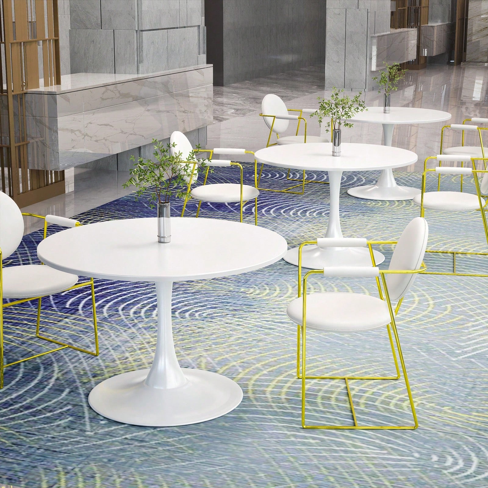 - La base centrale garantisce stabilità e libertà di movimento, mentre il piano circolare massimizza lo spazio conversazionale.