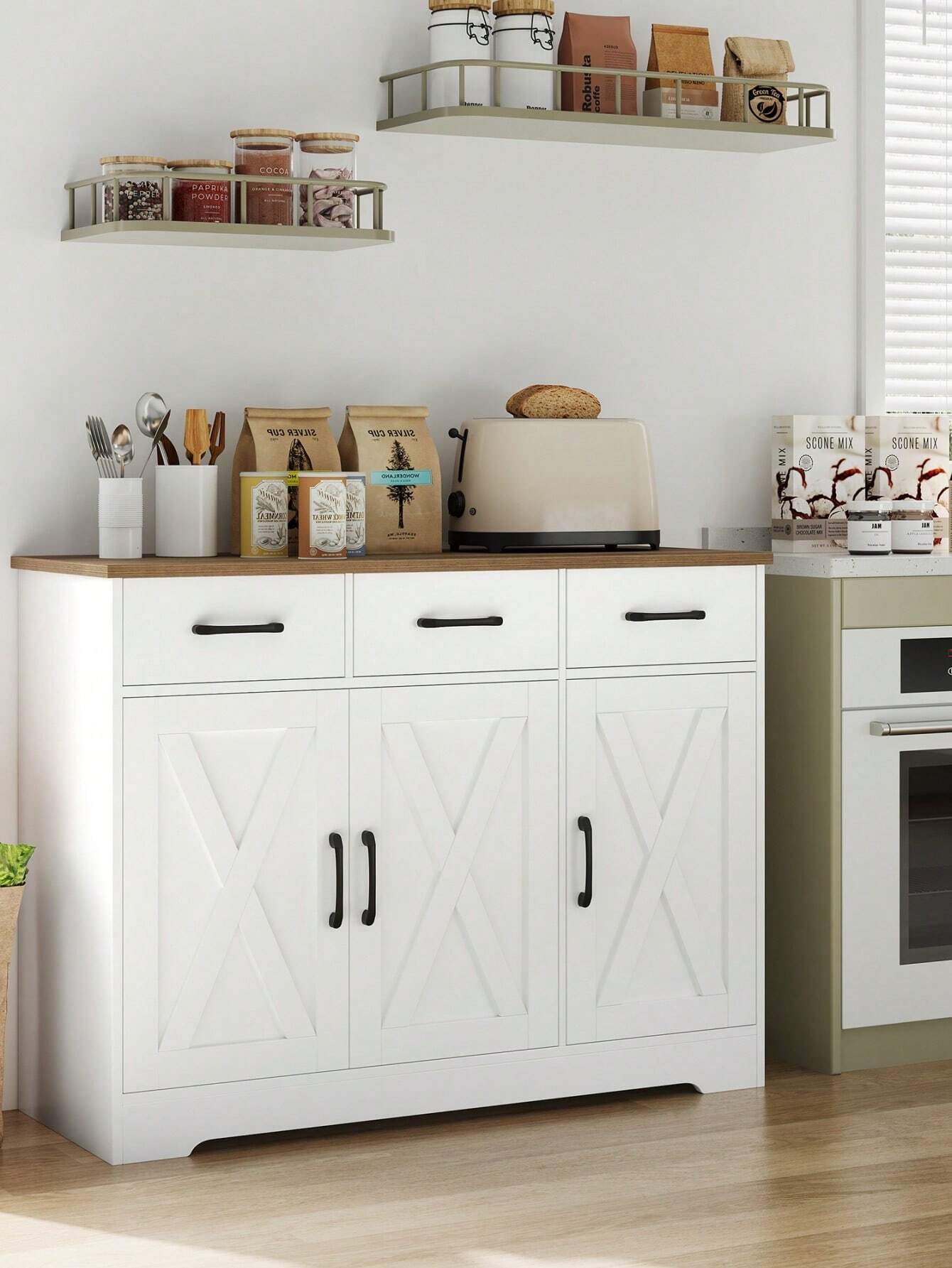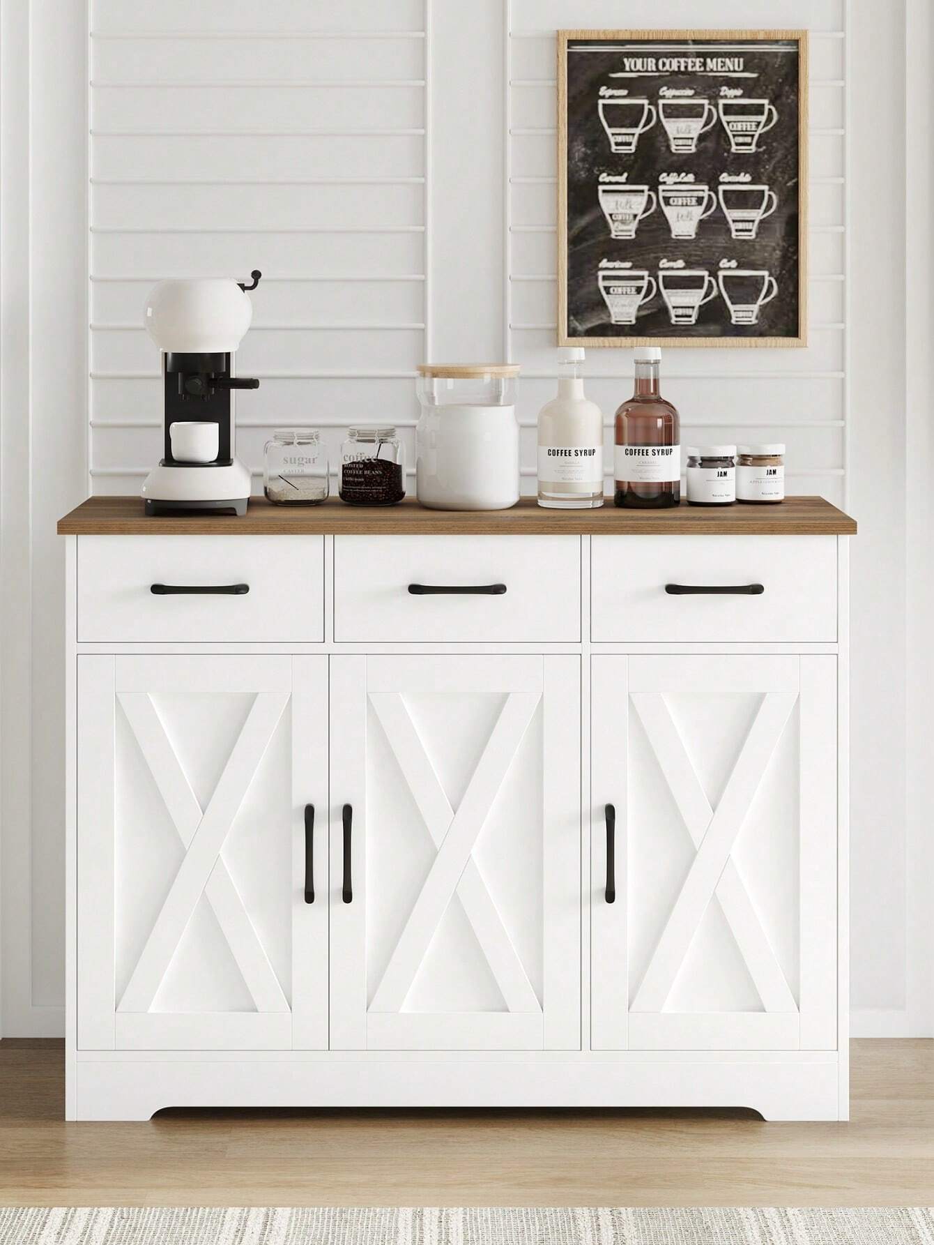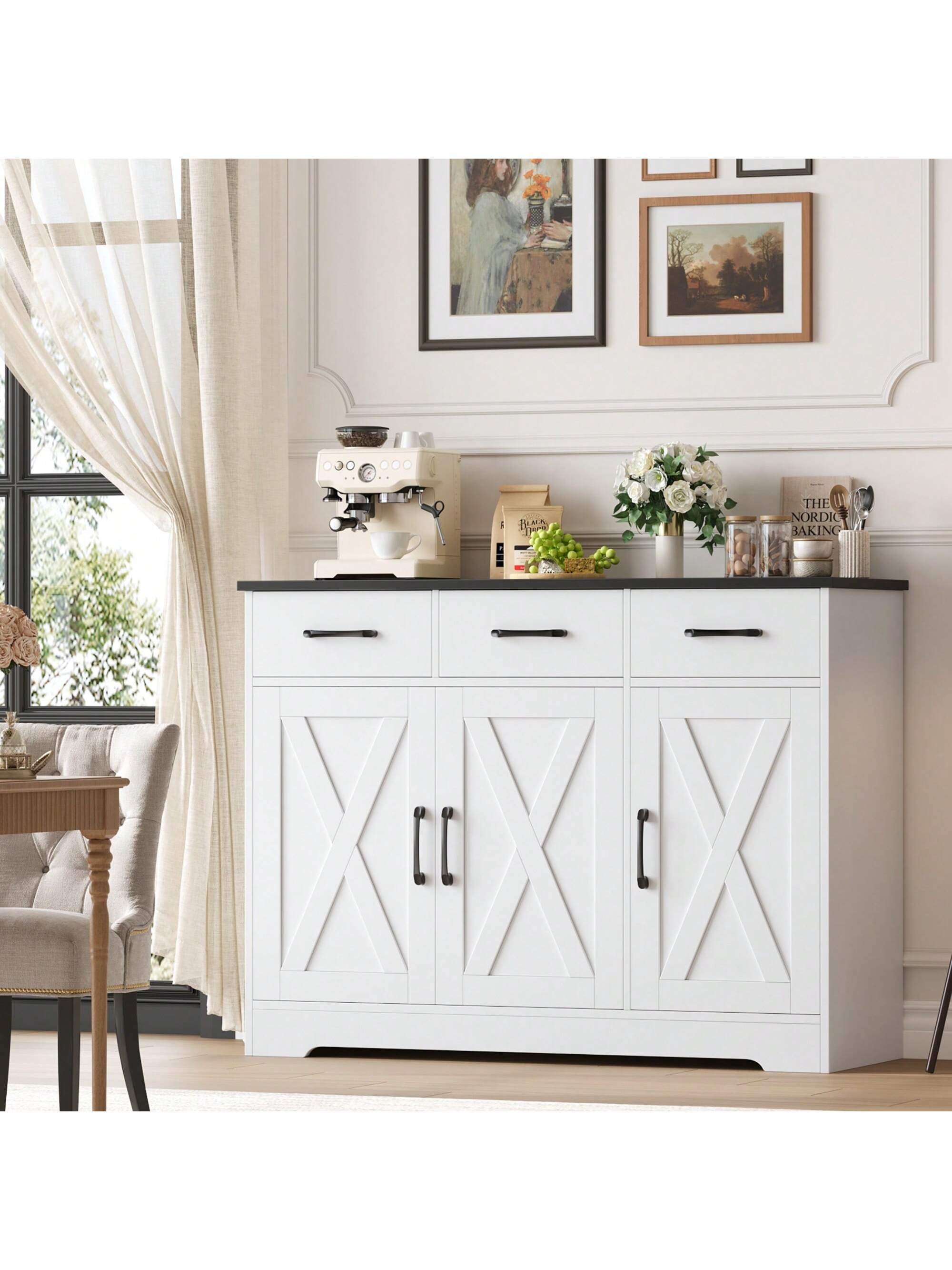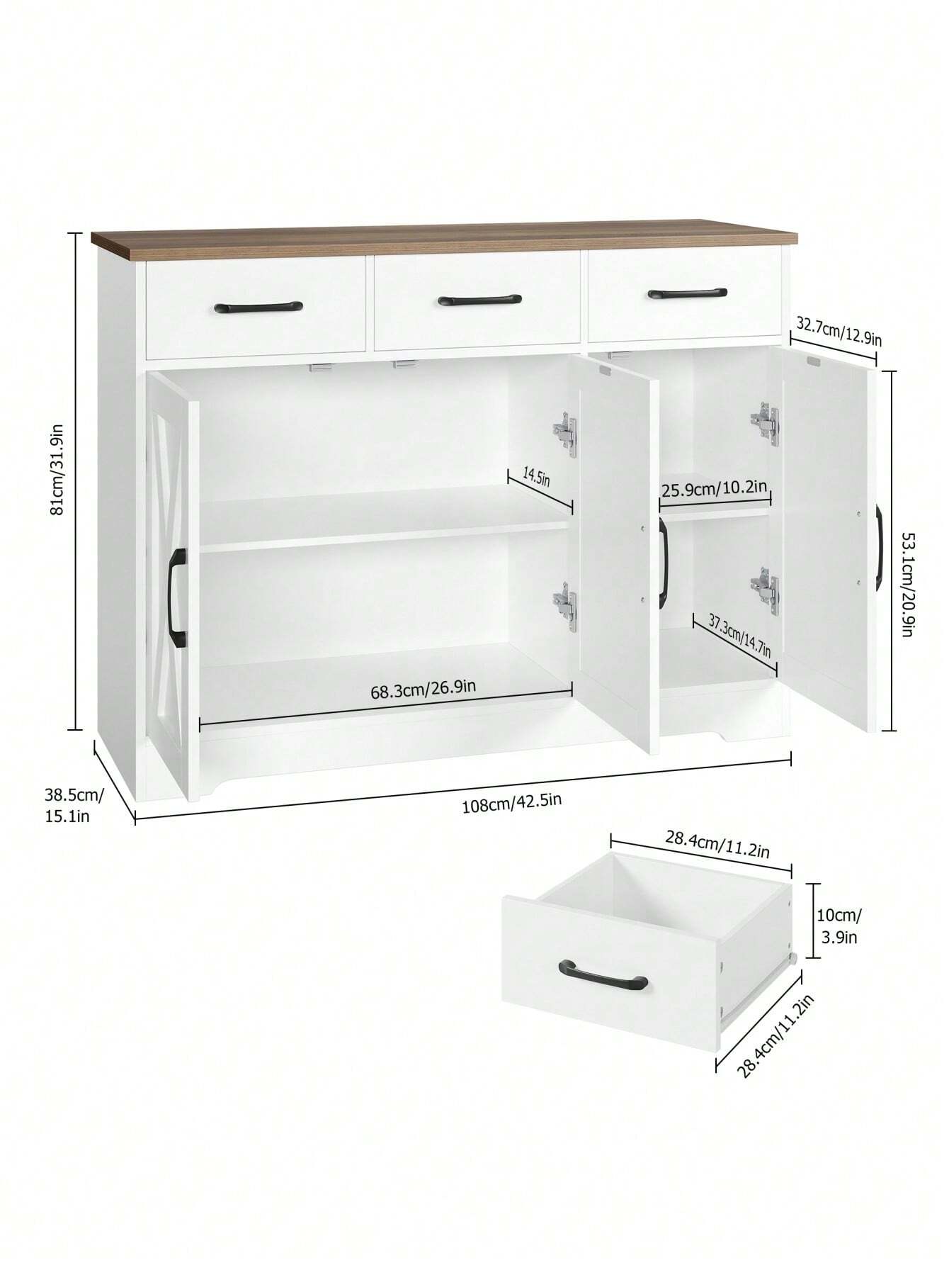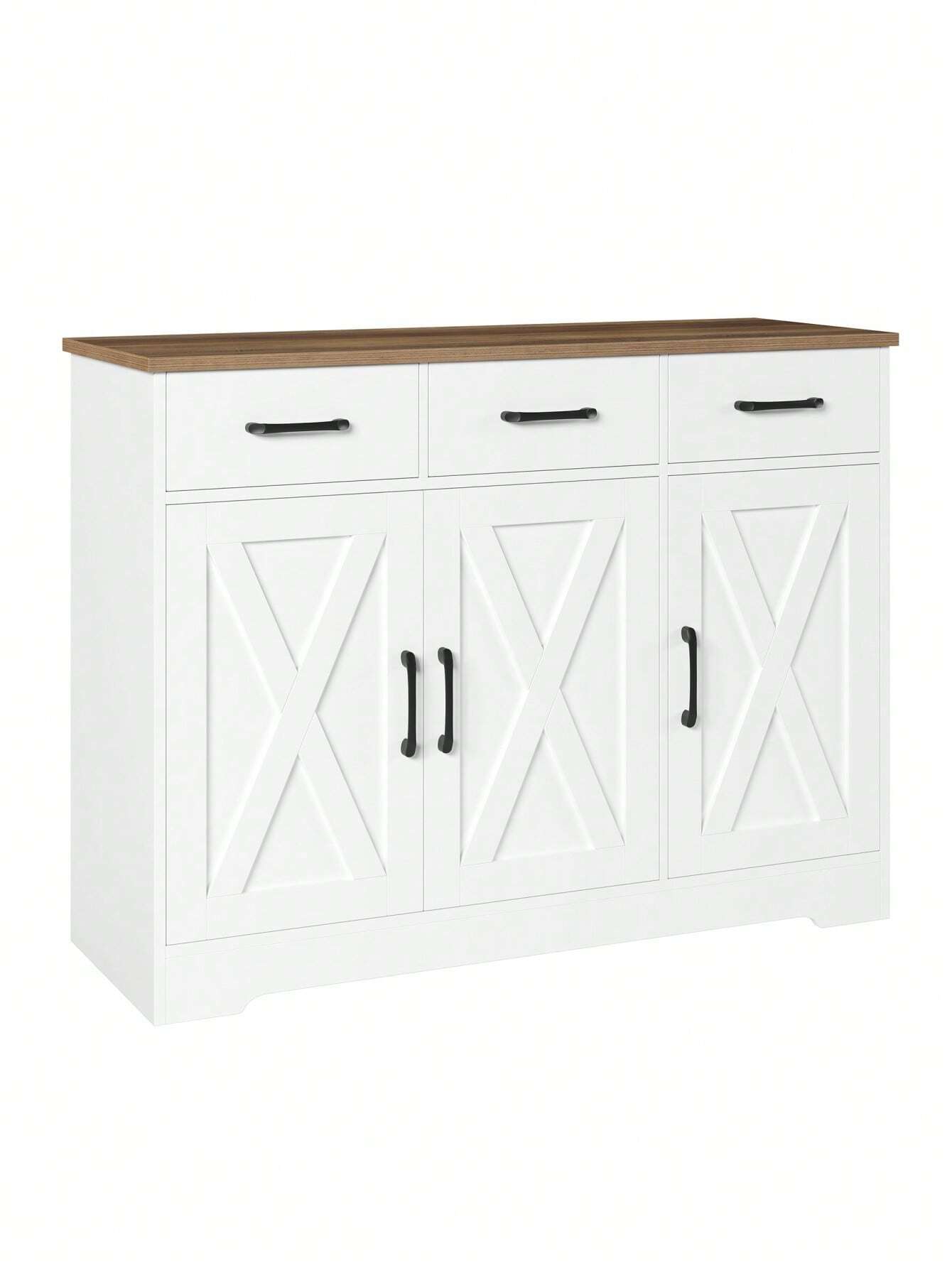 Trasforma il tuo spazio con questa credenza versatile che unisce stile e praticità! Realizzata in legno robusto con una splendida combinazione bianco e marrone, offre ampio spazio di archiviazione con 3 cassetti e 3 ante. Il piano di lavoro  integrato la rende perfetta per la cucina, la sala da pranzo...