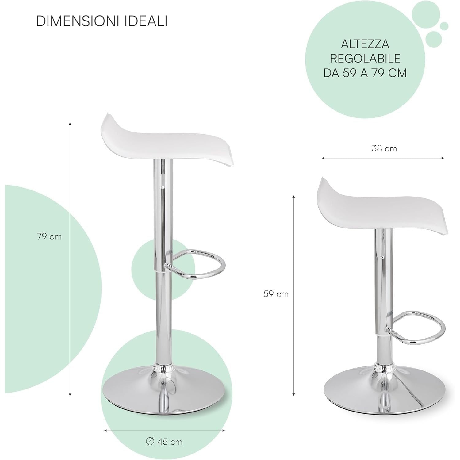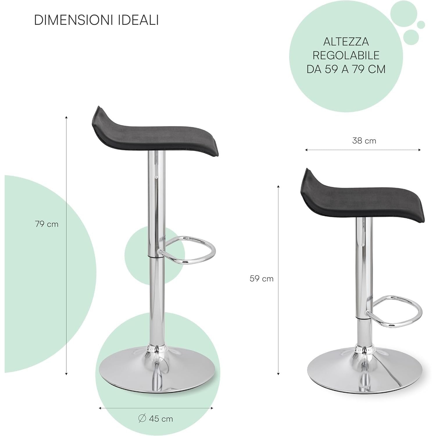- larghezza e 38 cm di profondità. L'altezza totale delo sgabello è regolabile da 59 a