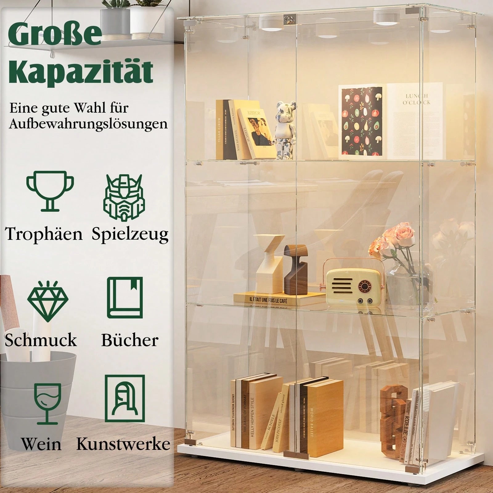 - L'illuminazione LED integrata valorizza gli oggetti esposti, mentre le dimensioni