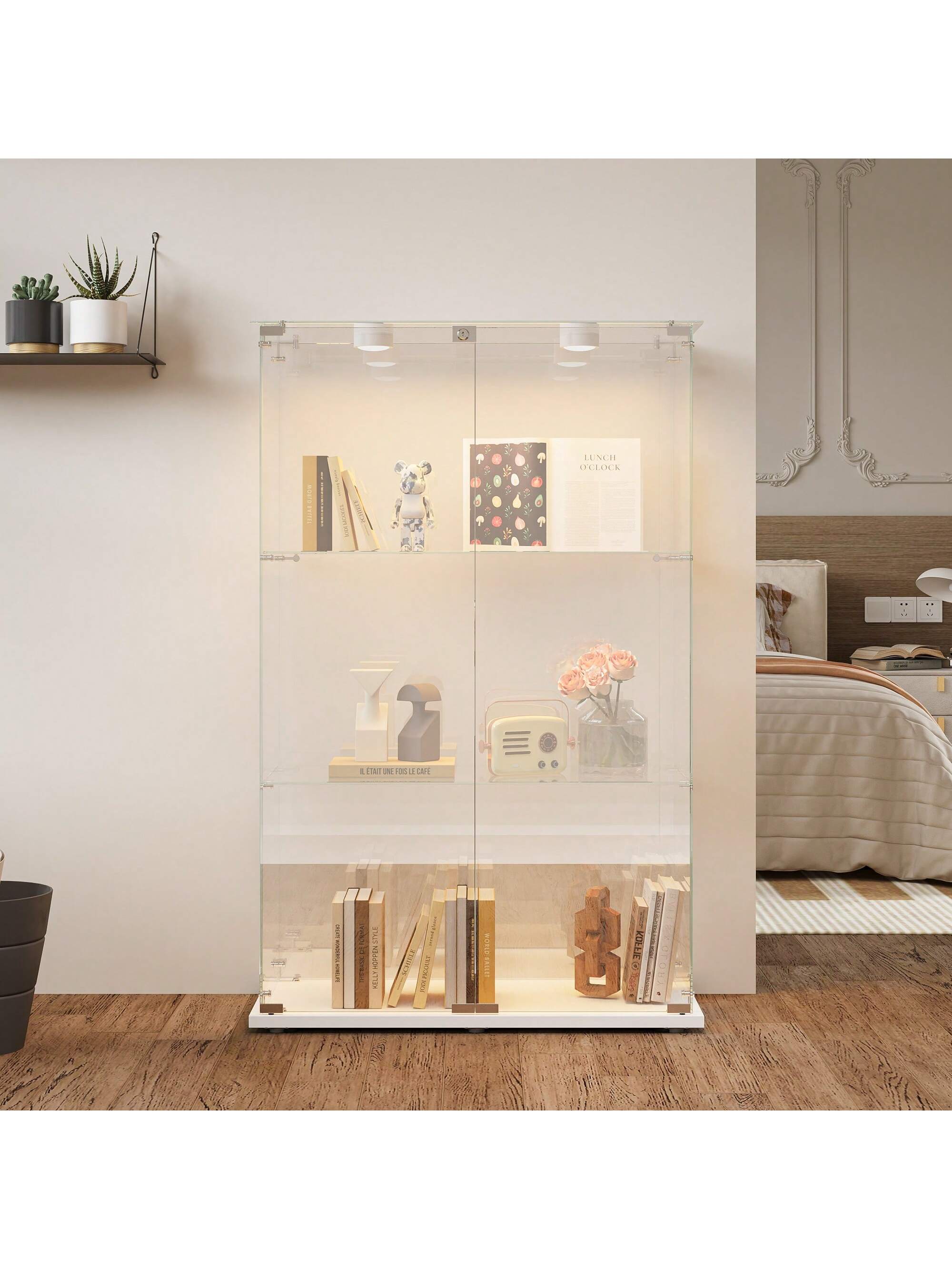 Vetrina elegante e versatile in vetro temperato con struttura autoportante, ideale per esporre collezioni e oggetti di valore.