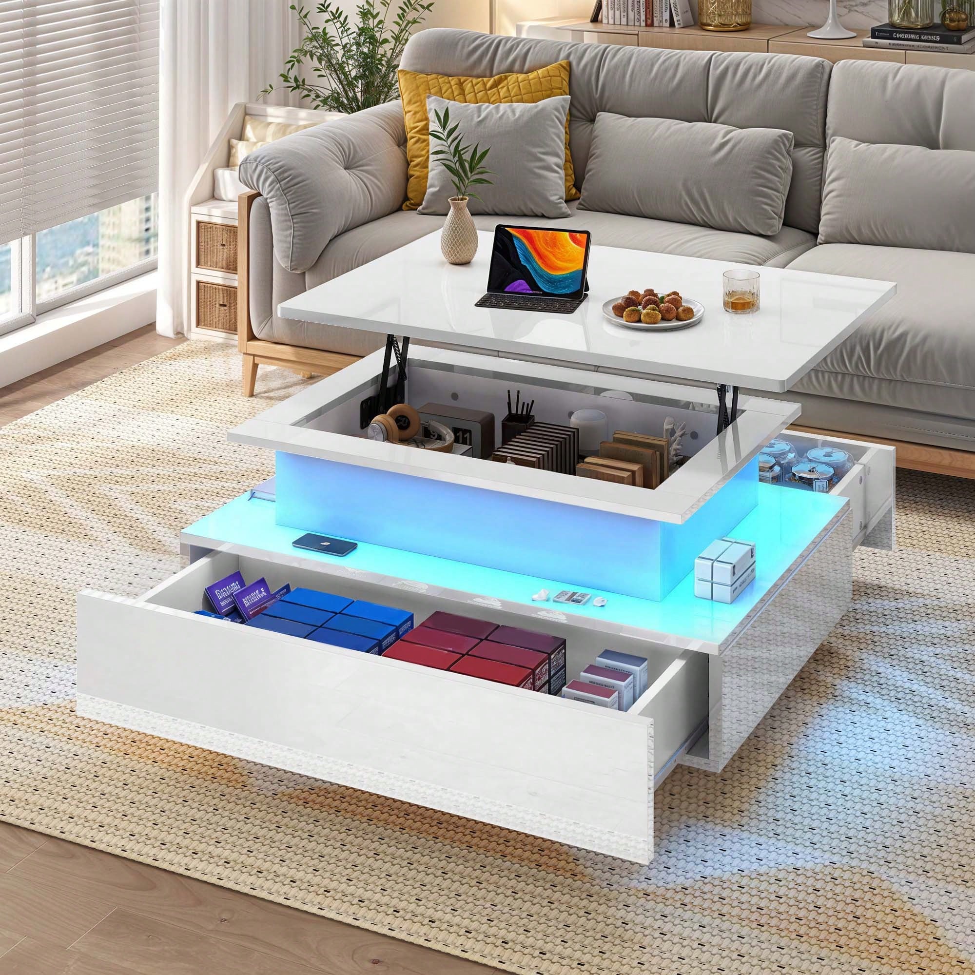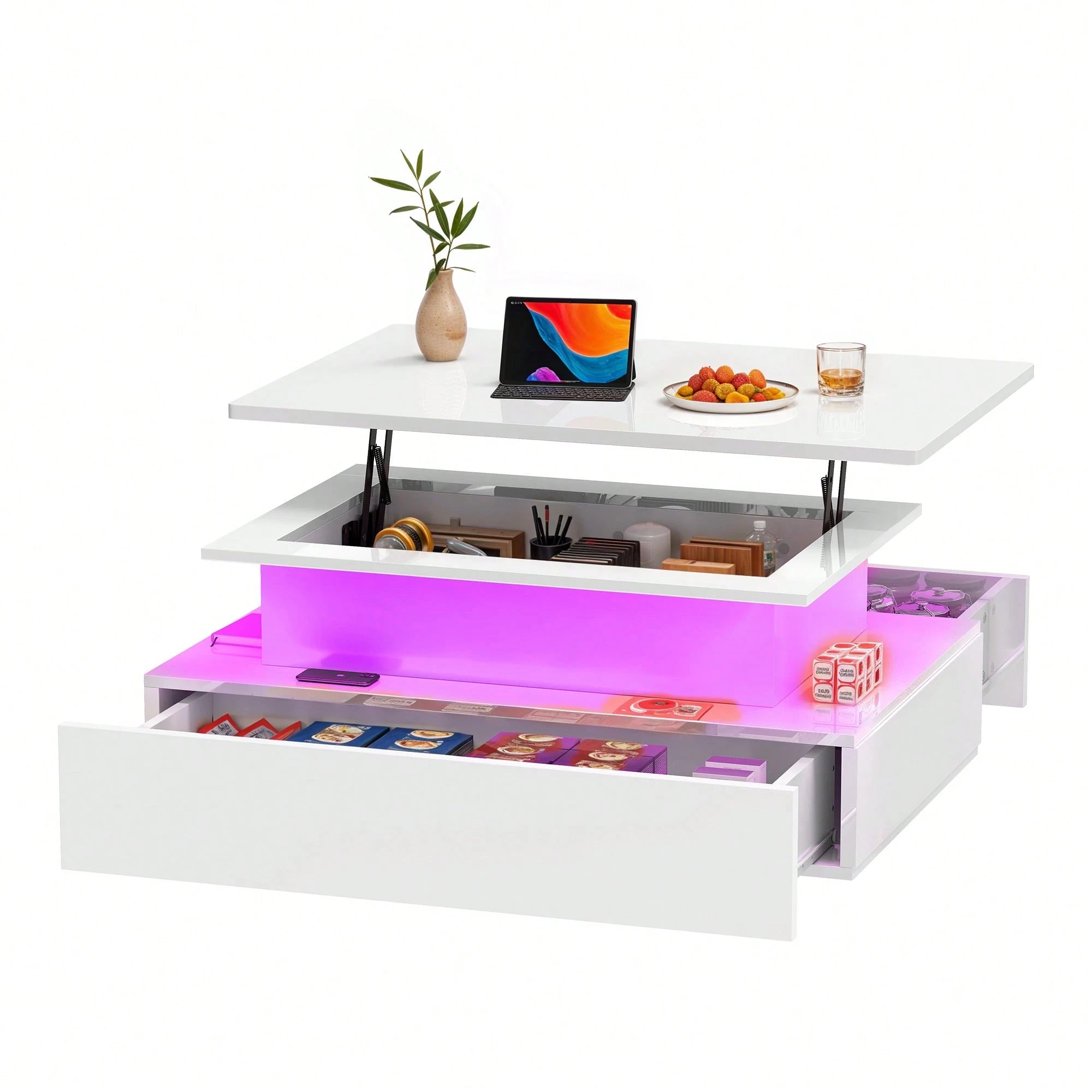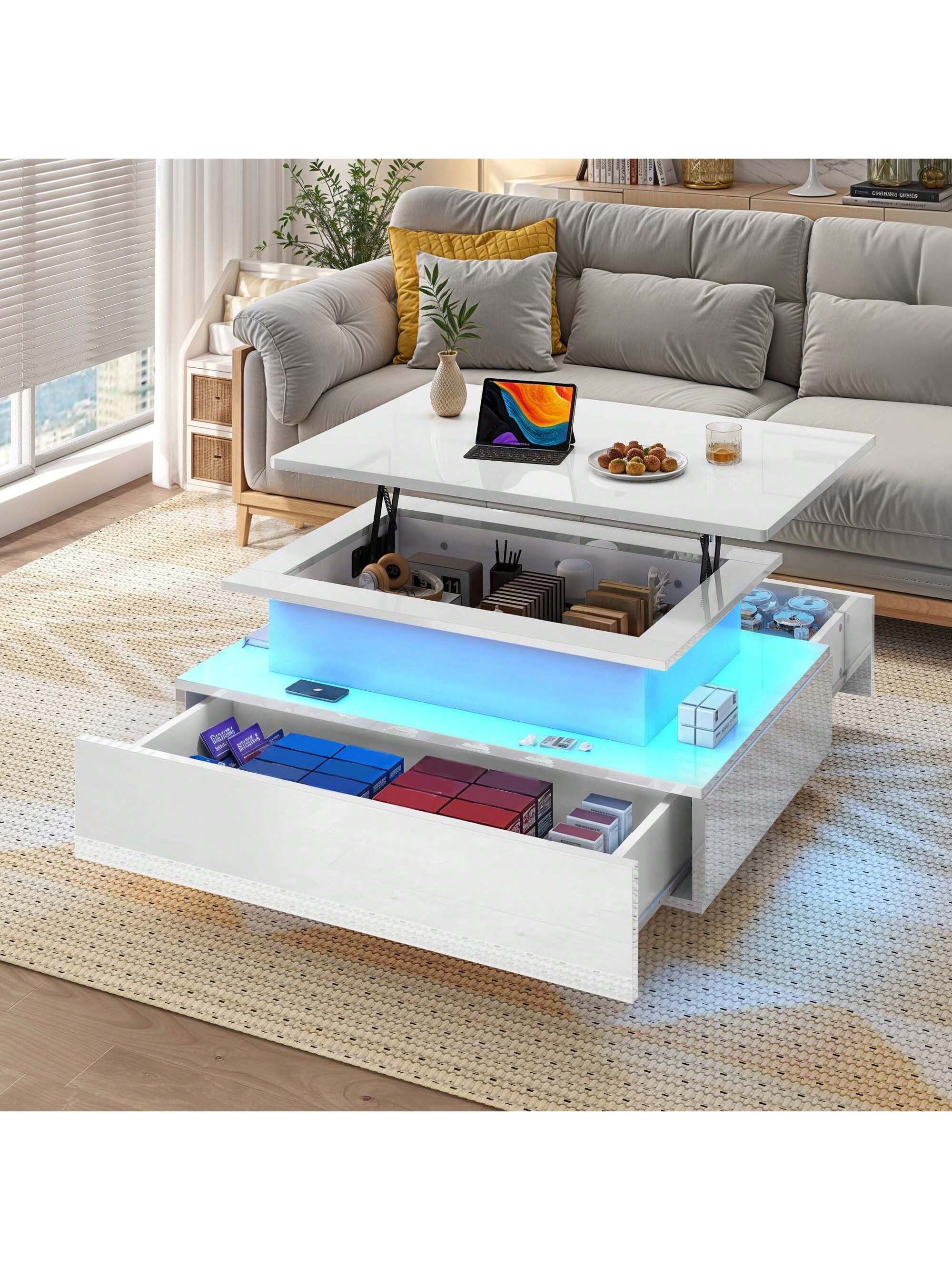 Tavolo da soggiorno lucido con illuminazione LED a 16 colori, ripiano espositivo aperto e 4 cassetti estraibili