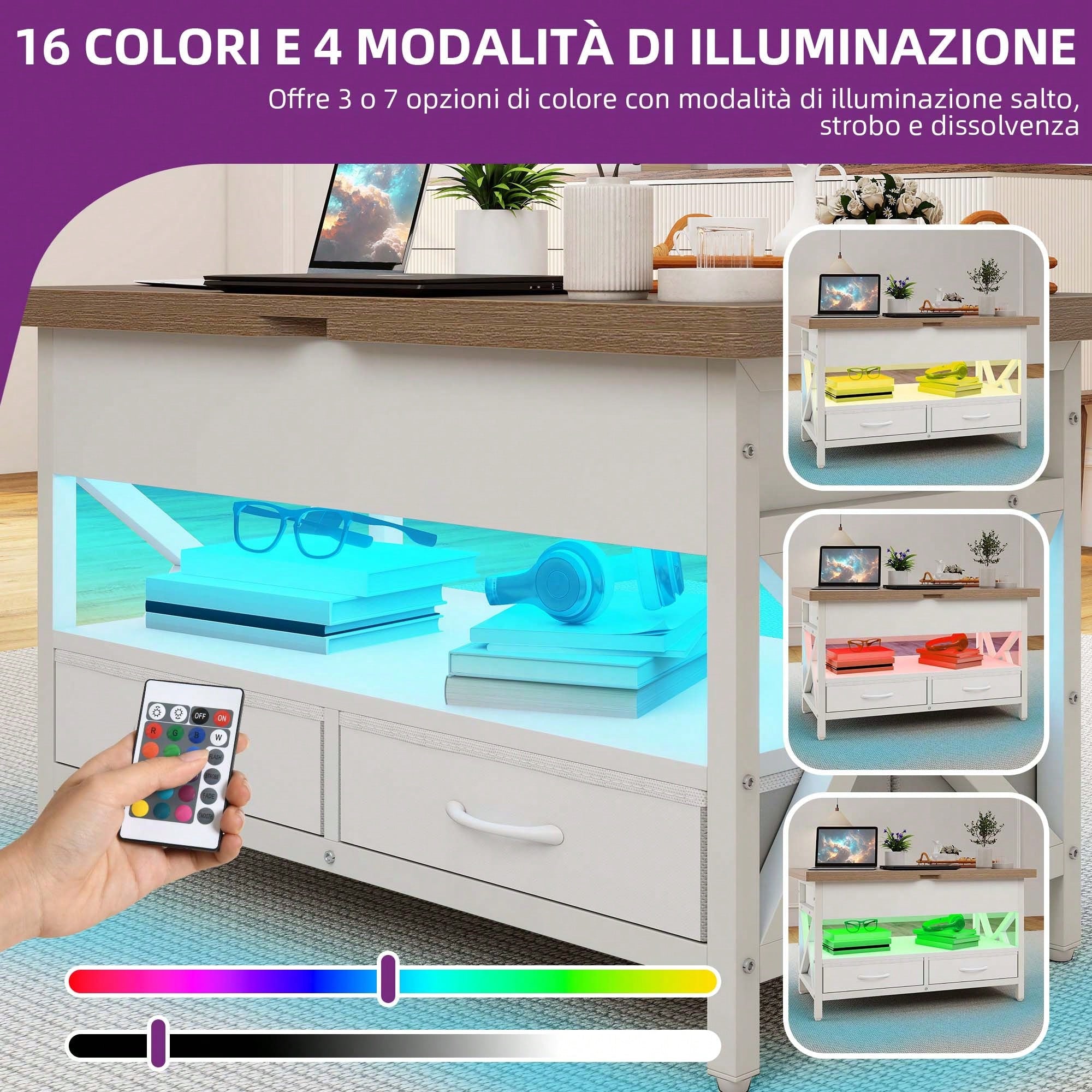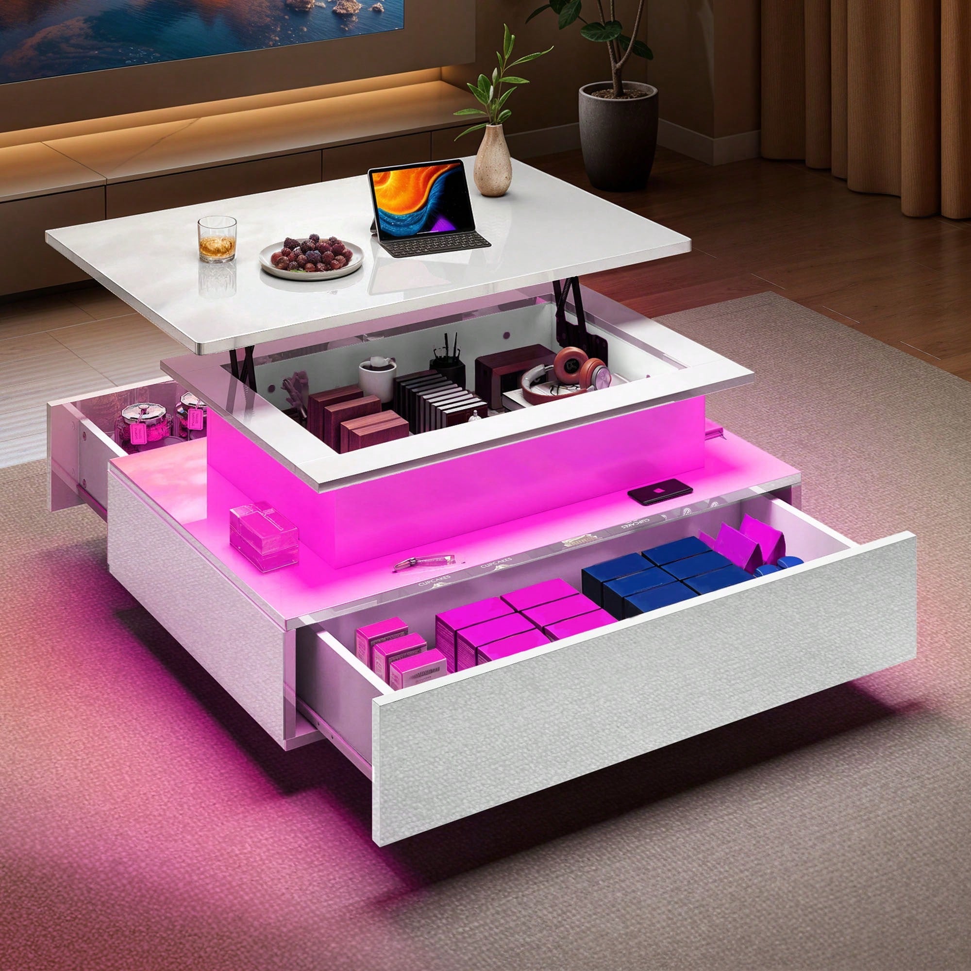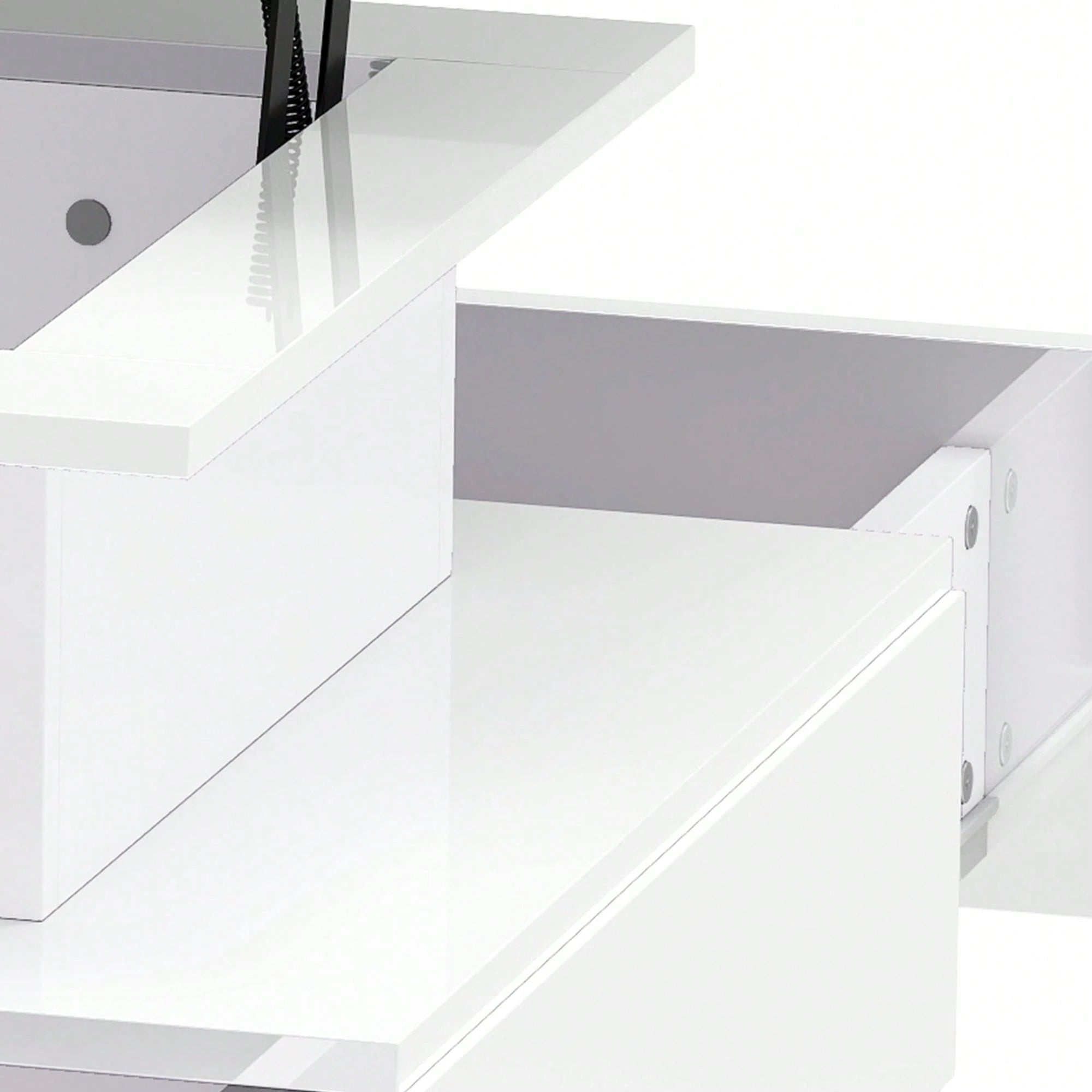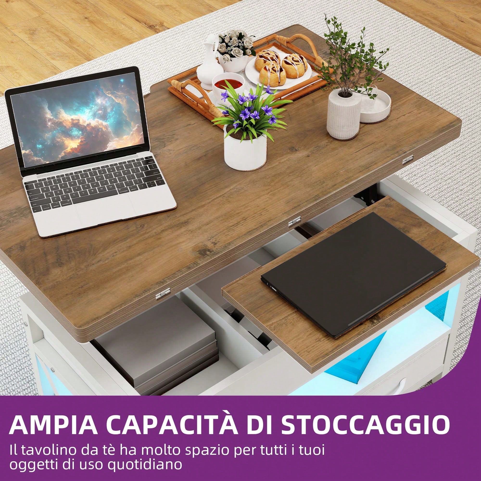 Tavolo da soggiorno lucido con illuminazione LED a 16 colori, ripiano espositivo aperto e 4 cassetti estraibili