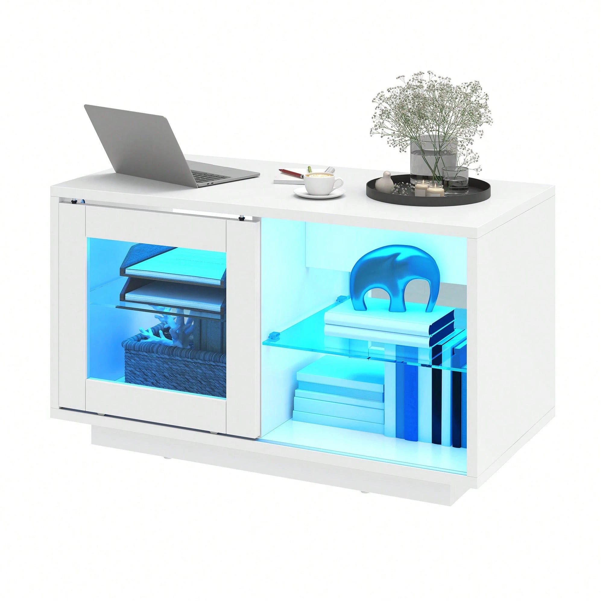 La sua struttura moderna è arricchita da un'illuminazione a LED integrata che crea un'atmosfera sofisticata, mentre il ripiano espositivo regolabile ti permette di personalizzare l'organizzazione dello spazio.
