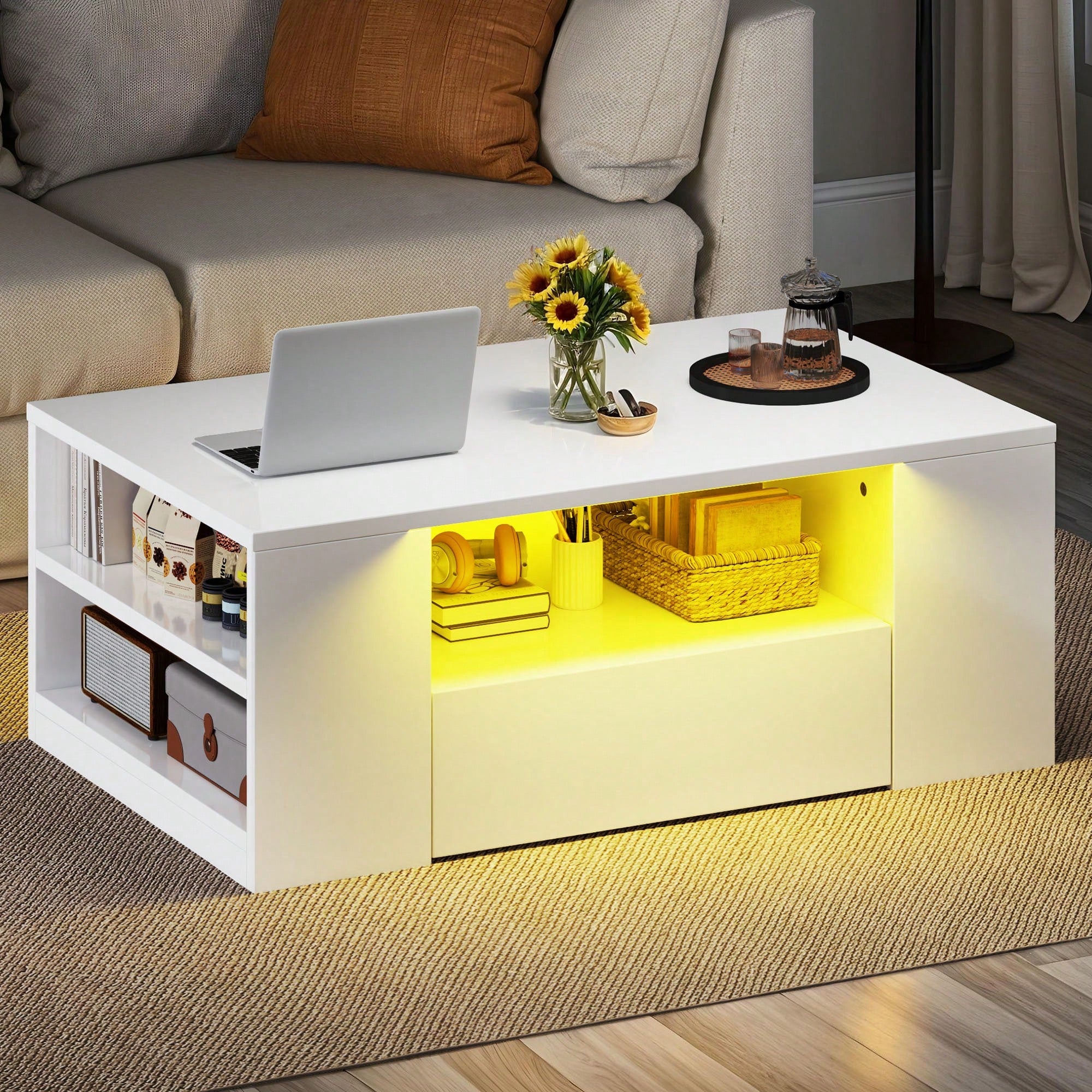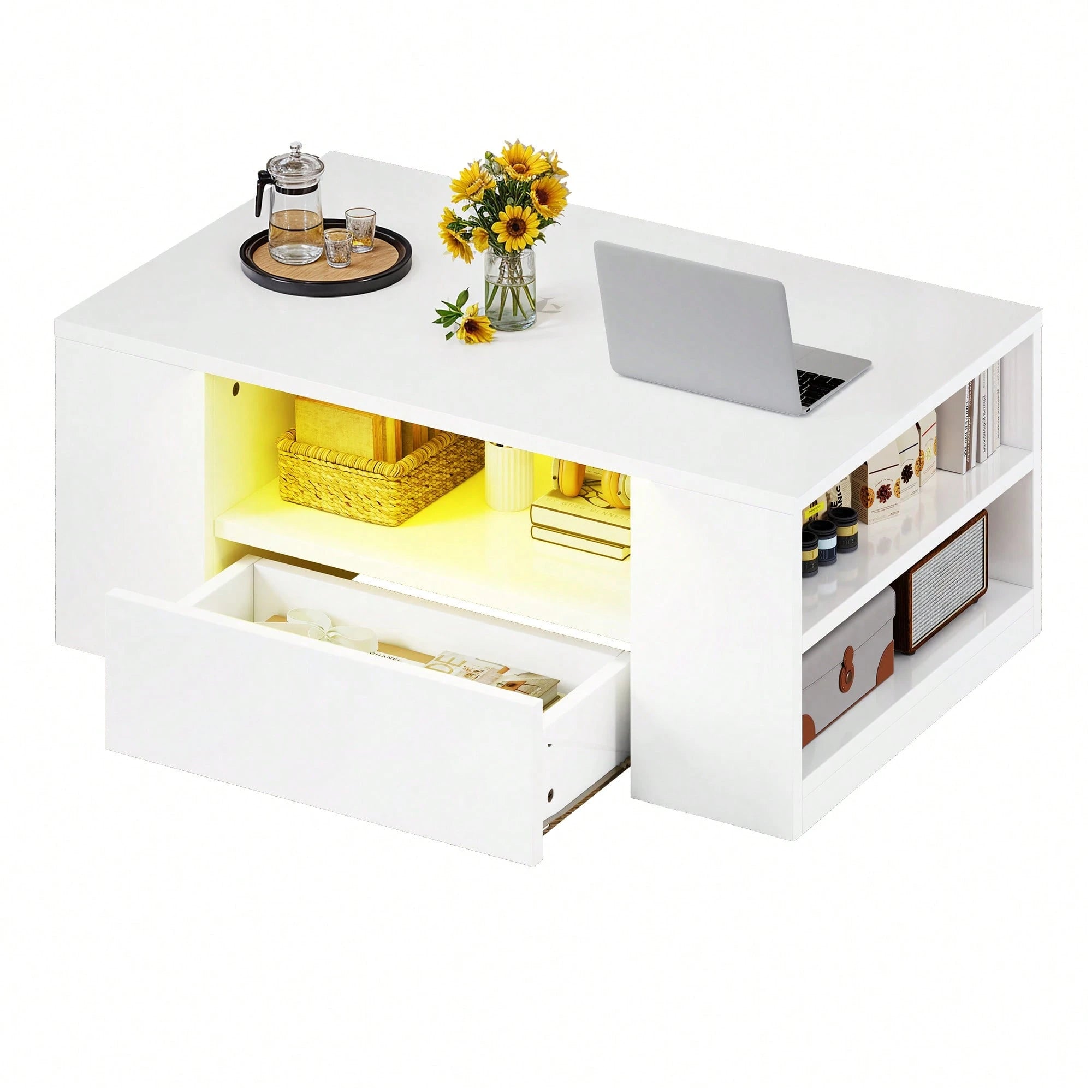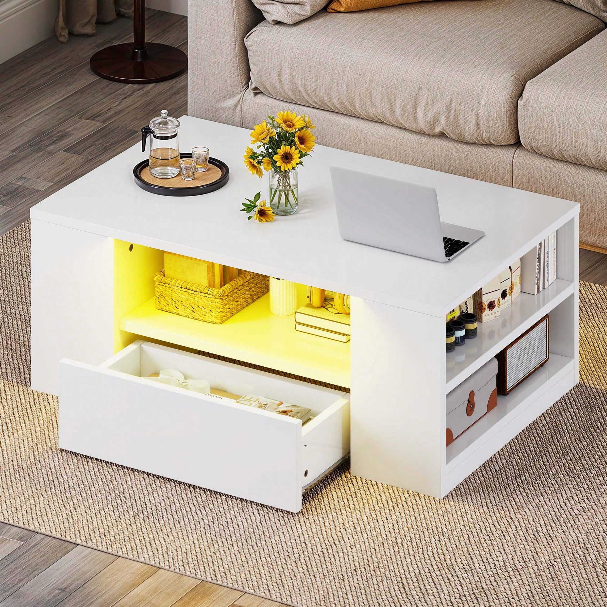 Tavolino da caffè elegante in bianco lucido che combina funzionalità e design contemporaneo.