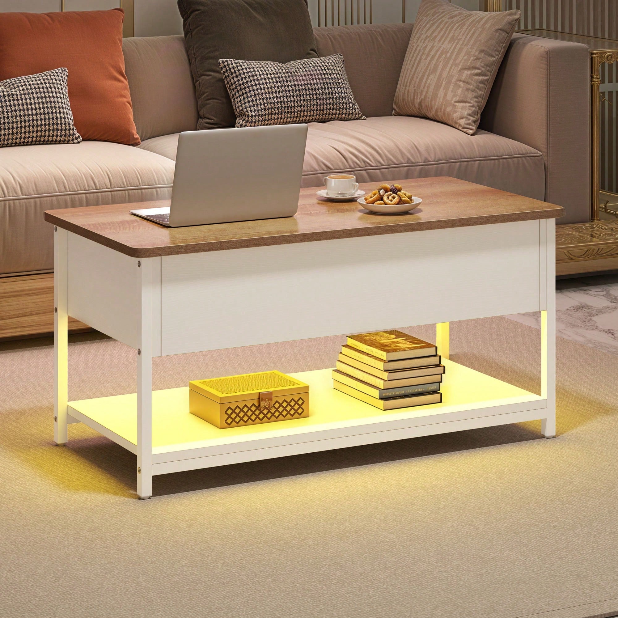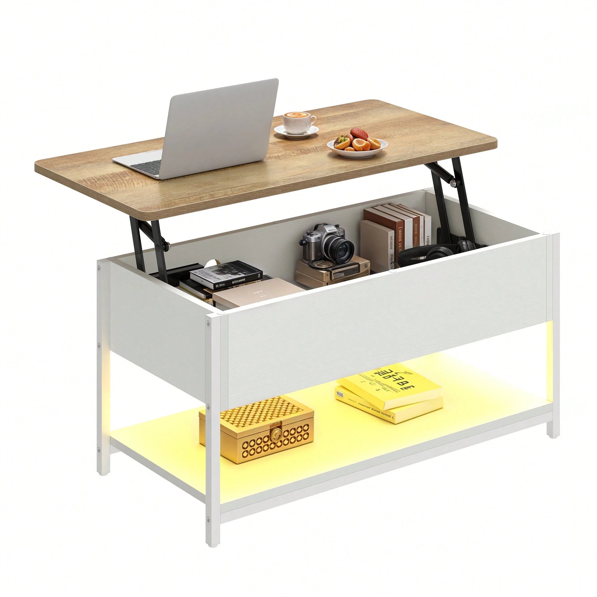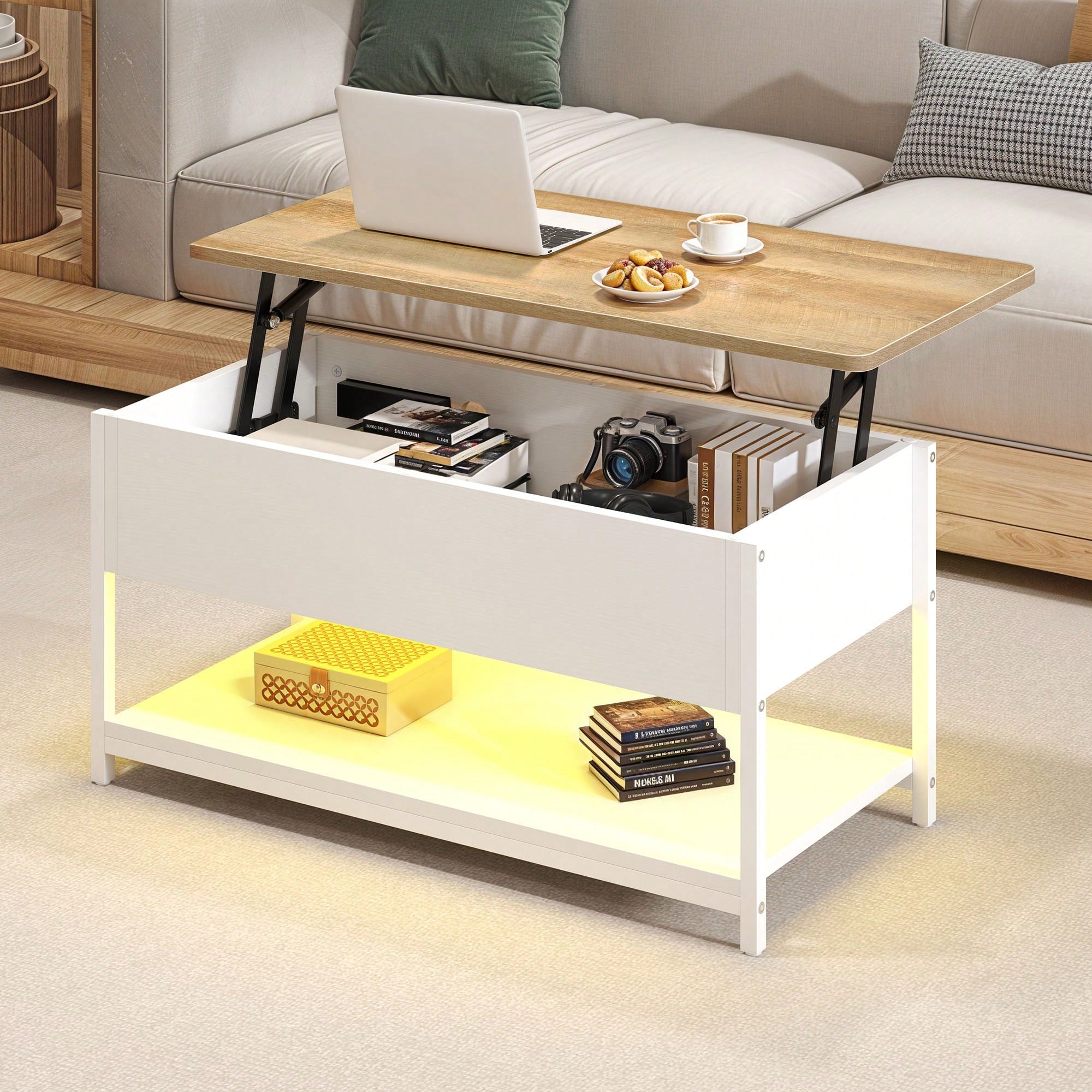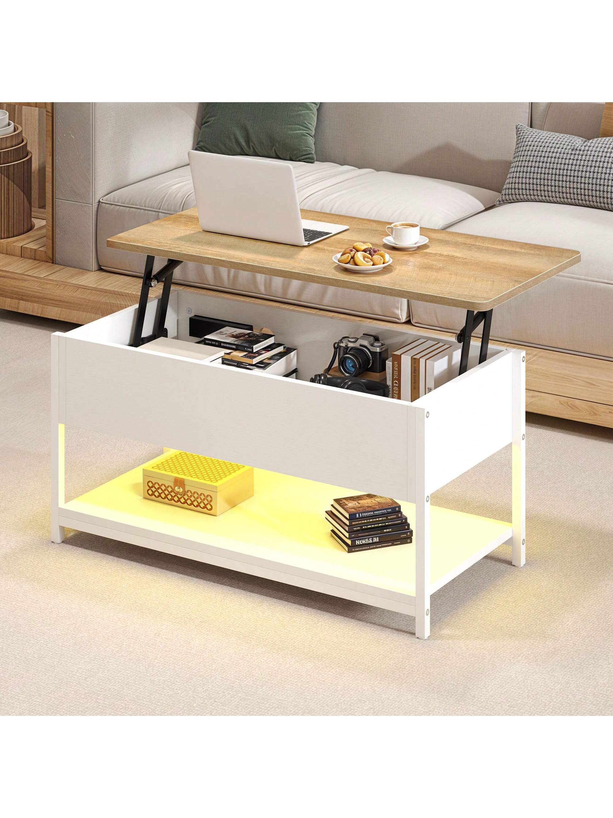 Trasforma il tuo salotto con questo tavolino da caffè intelligente e versatile. Dotato di piano regolabile in altezza e estensibile, si adatta perfettamente a ogni esigenza e spazio.