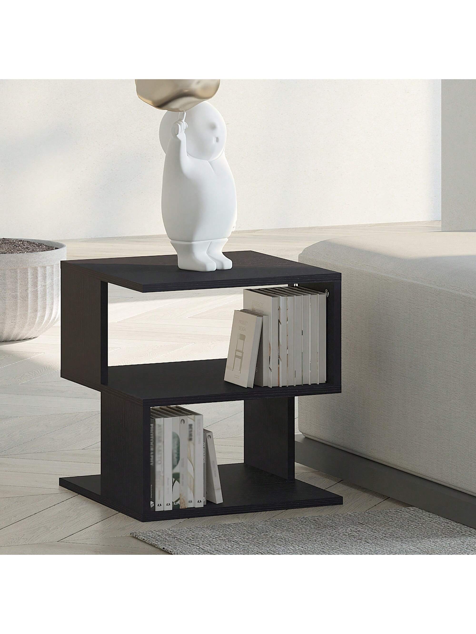 Tavolino da salotto elegante e funzionale con struttura in legno e tre ripiani ben organizzati.