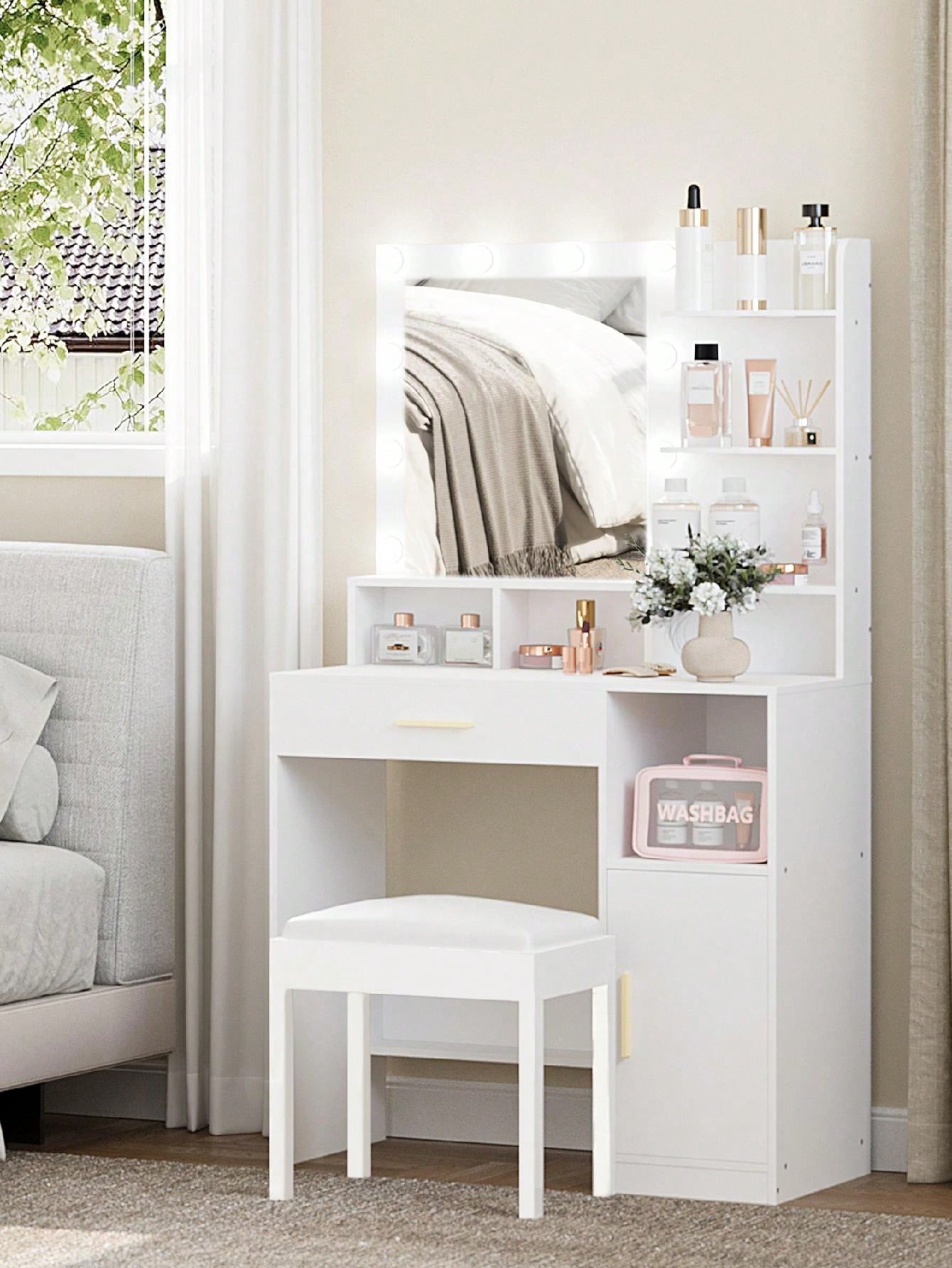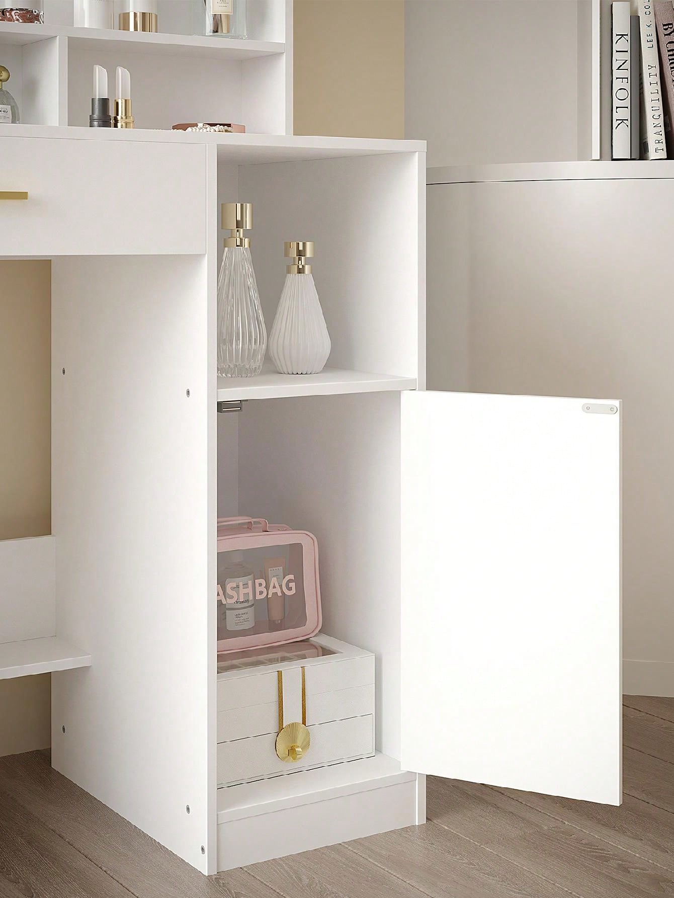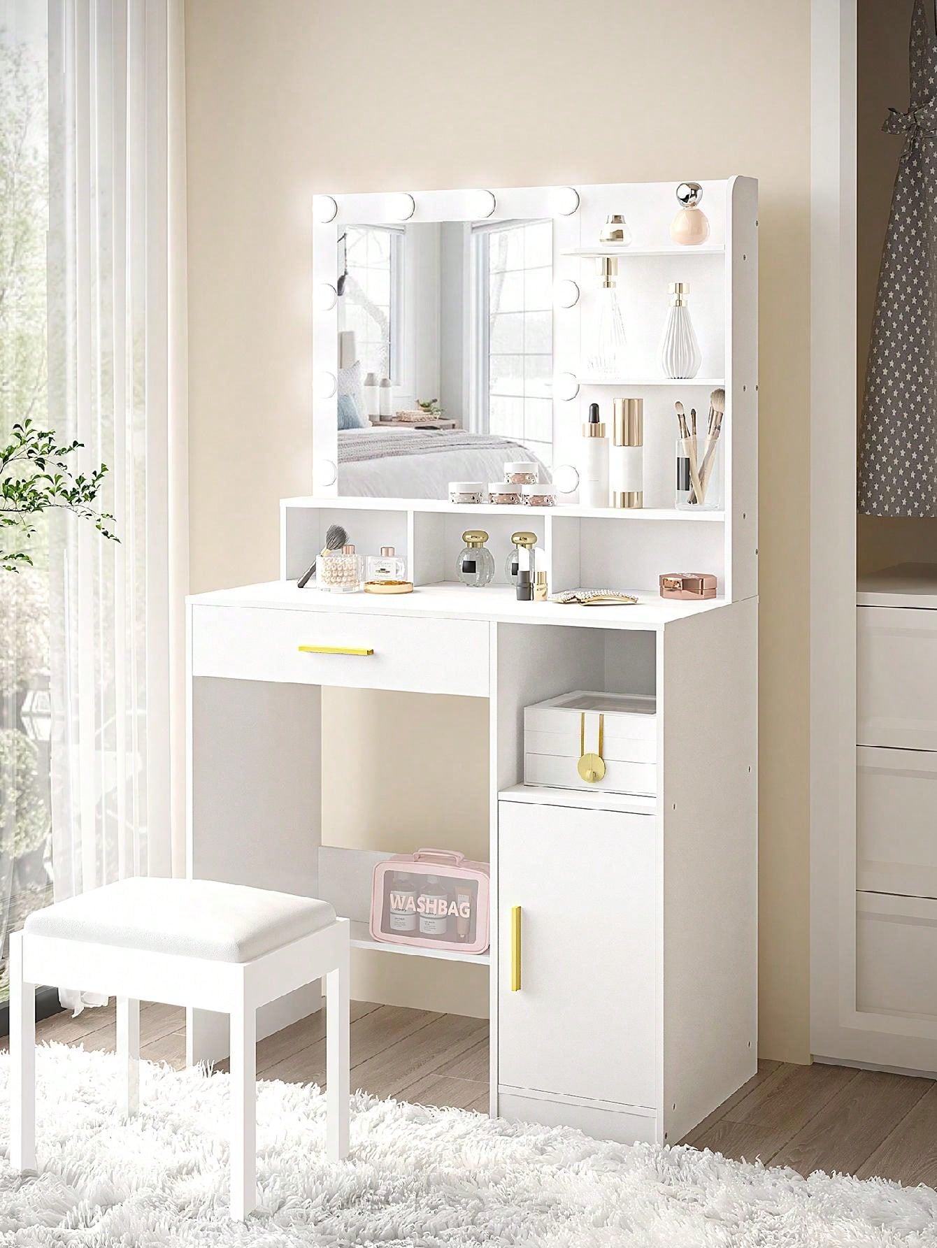 . Grande capacità di stoccaggio: Il set di vanity table per il trucco con 3 ripiani aperti, 4 scomparti, 1 cassetto e armadietto di stoccaggio offre spazio sufficiente per i vostri trucchi, gioielli e altre decorazioni. Inoltre, il pannello di supporto inferiore della cassettiera aggiunge divisori per riporre le borse.