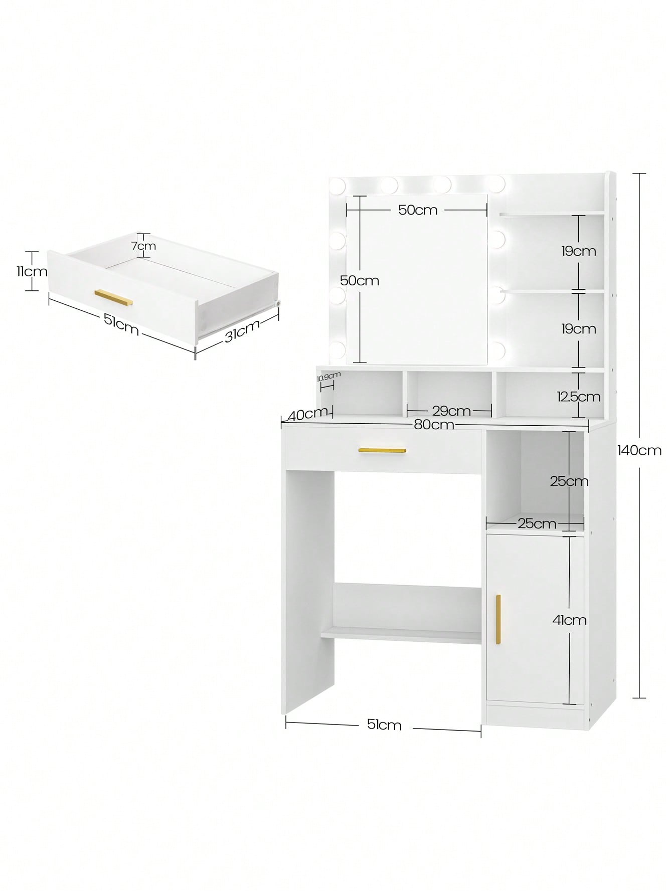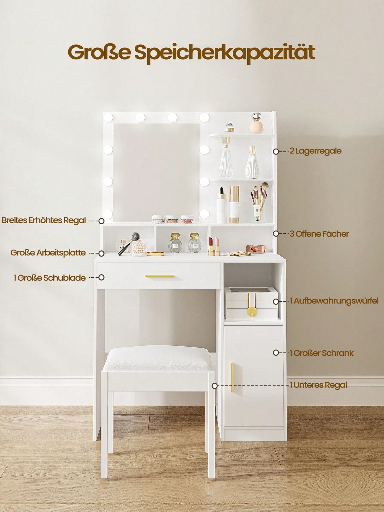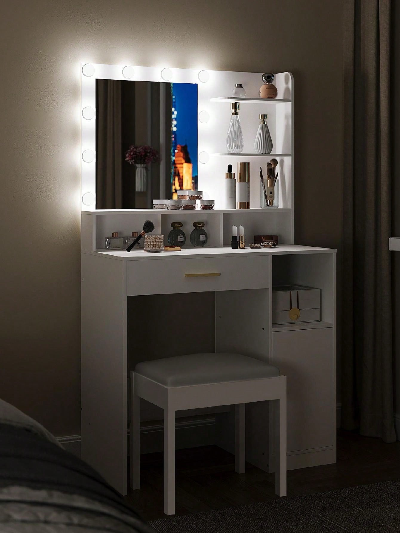 . Grande capacità di stoccaggio: Il set di vanity table per il trucco con 3 ripiani aperti, 4 scomparti, 1 cassetto e armadietto di stoccaggio offre spazio sufficiente per i vostri trucchi, gioielli e altre decorazioni. Inoltre, il pannello di supporto inferiore della cassettiera aggiunge divisori per riporre le borse.