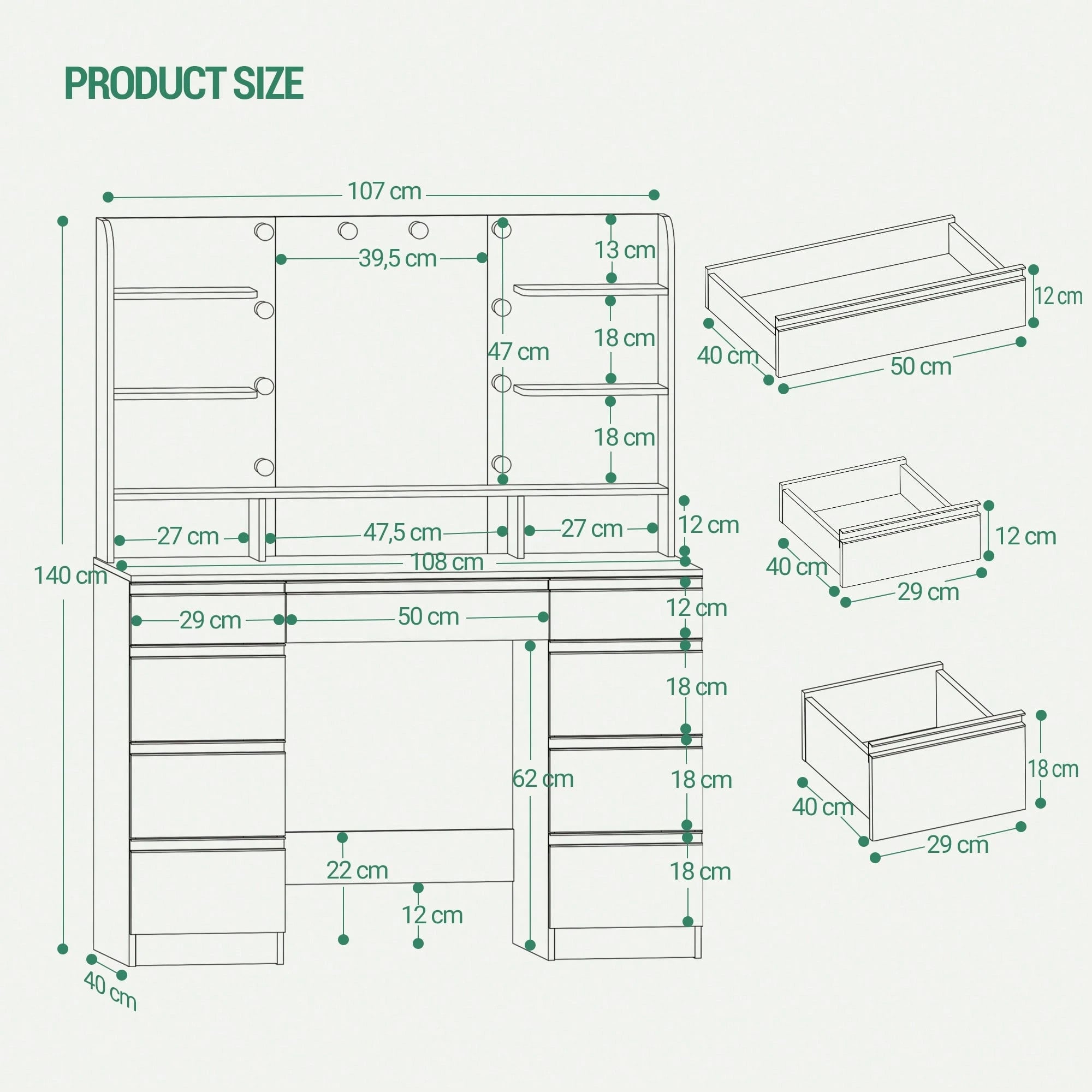 Con 1 ampio cassetto, 8 piccoli cassettini e 9 scomparti aperti, avrai spazio organizzato per tutti i tuoi prodotti cosmetici e accessori.
