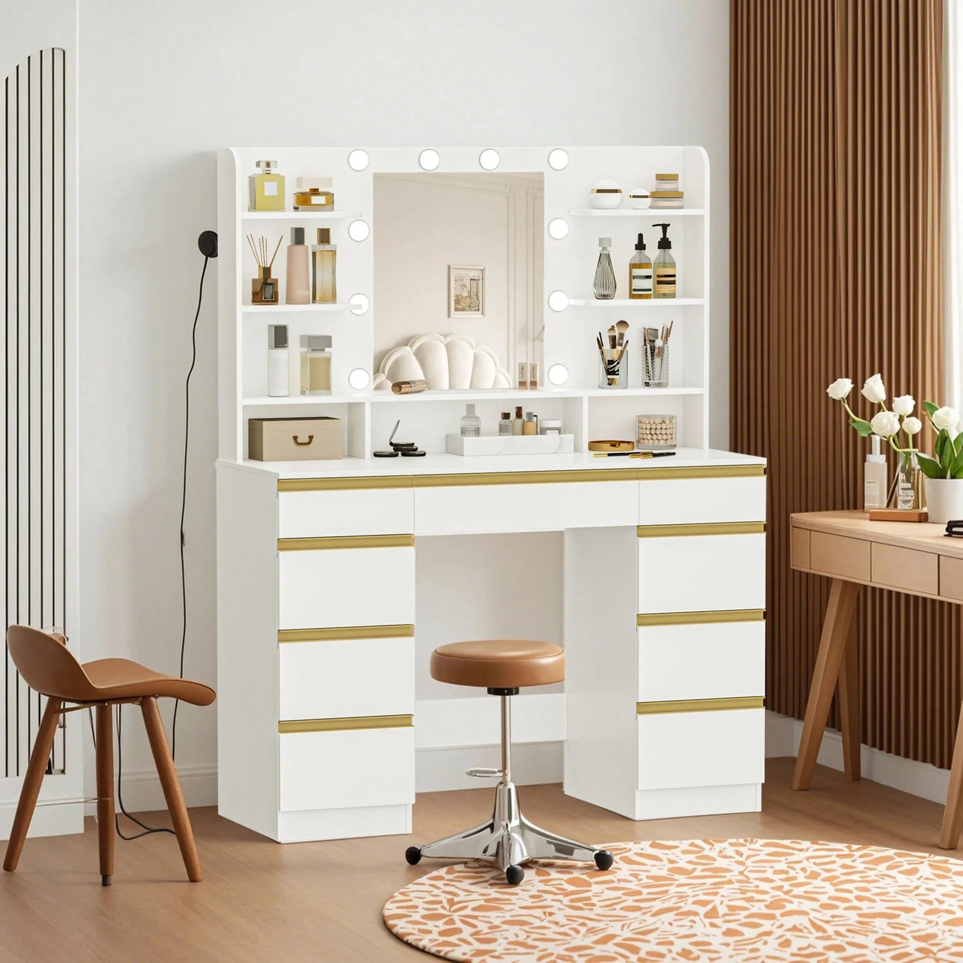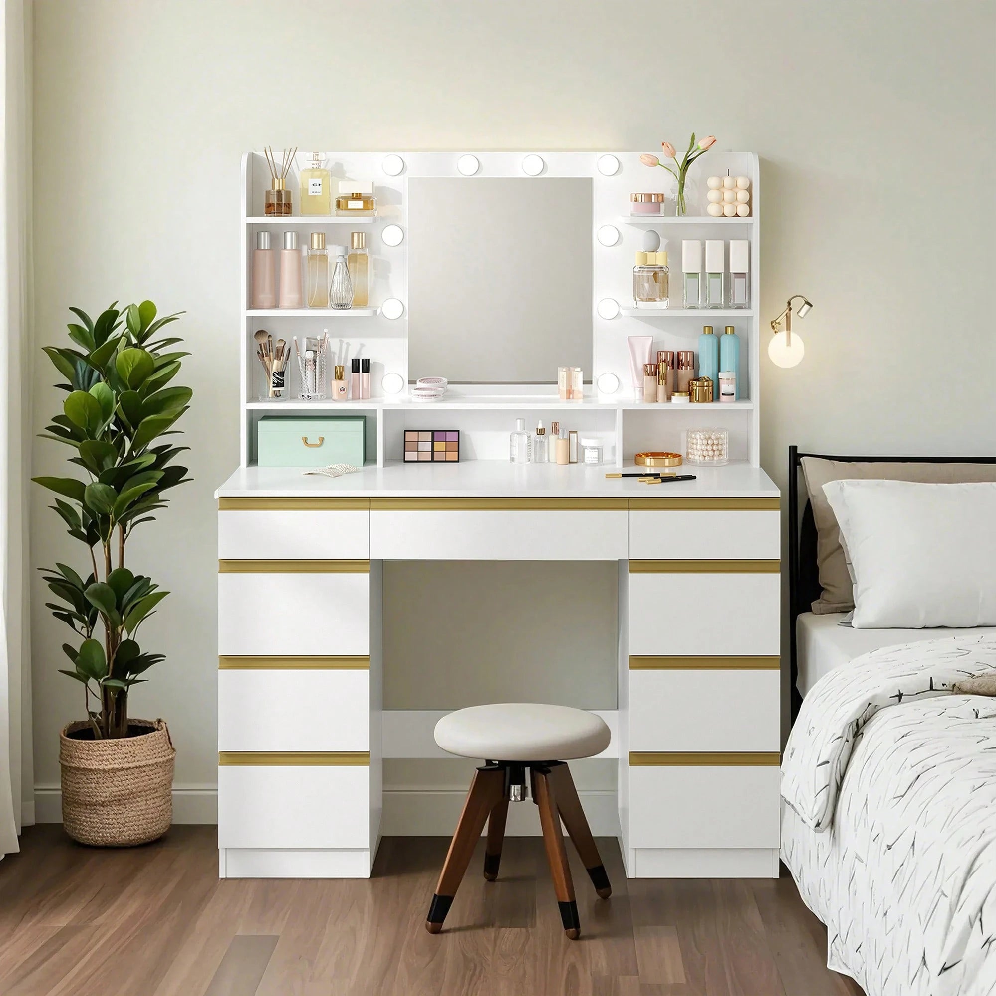 Trasforma la tua routine di bellezza con questa toeletta professionale dotata di 10 luci LED regolabili in 3 temperature di colore,