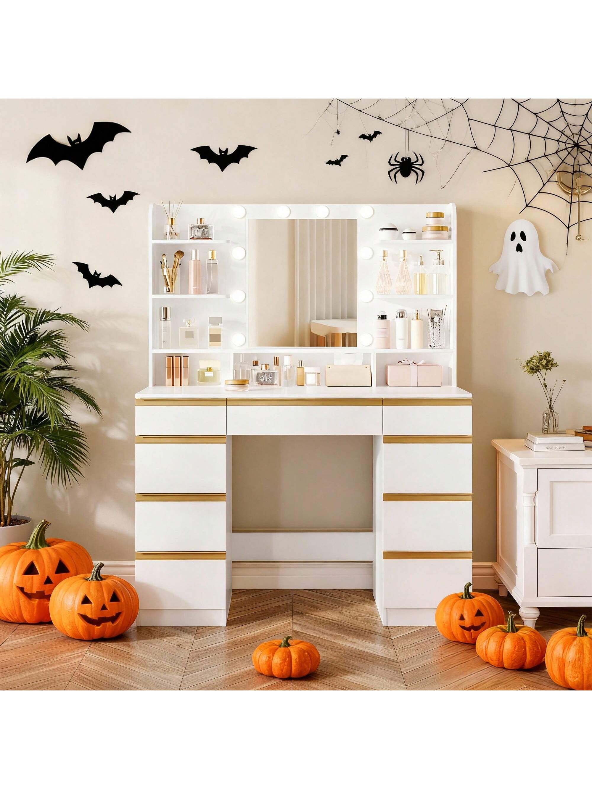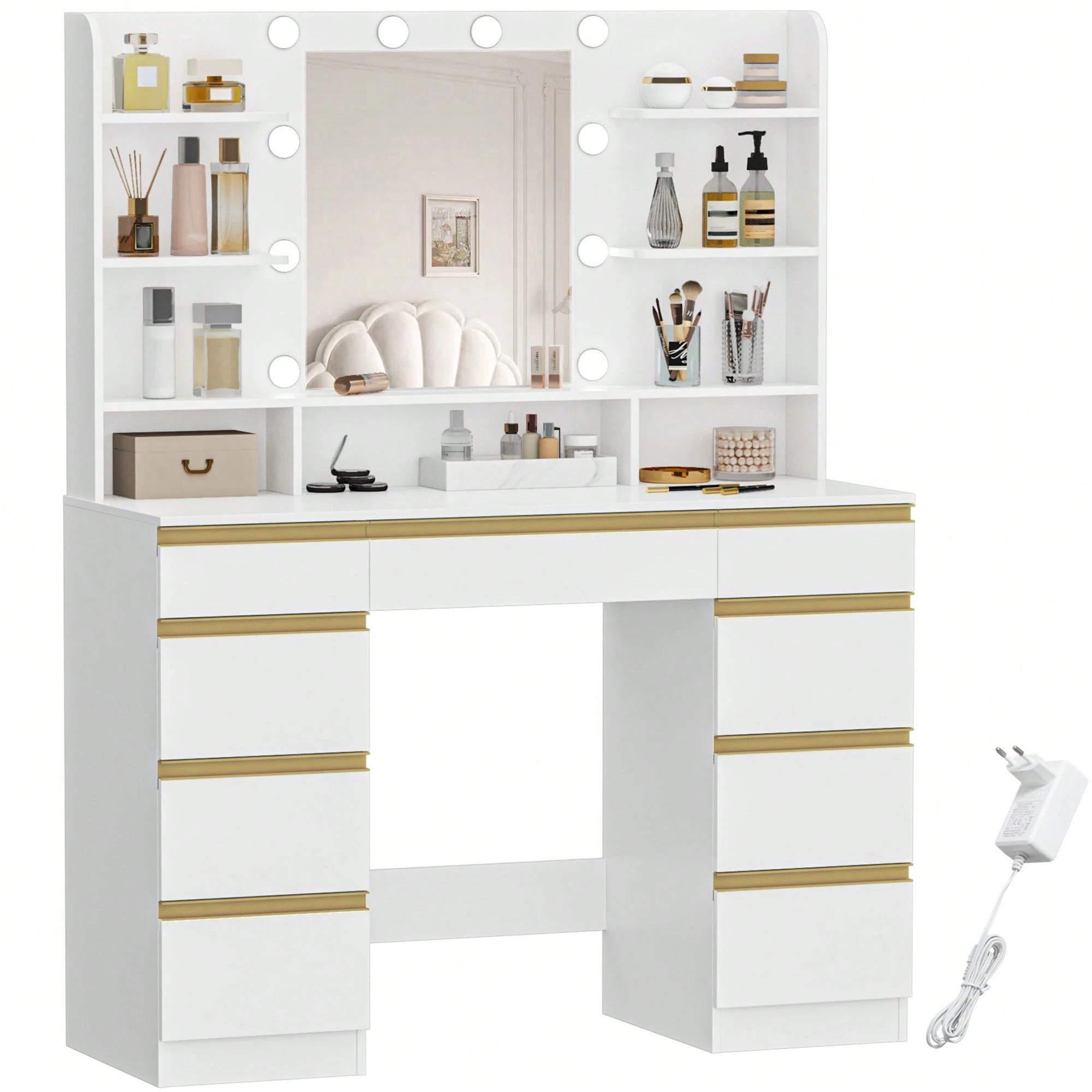 Toeletta da Trucco con 10 Luce LED, 3 Colori, Luminosità Regolabile, Grande Specchio HD, 1 Cassetto Grande e 8 Cassettiere Piccole, 9 Vani Portaoggetti Aperti