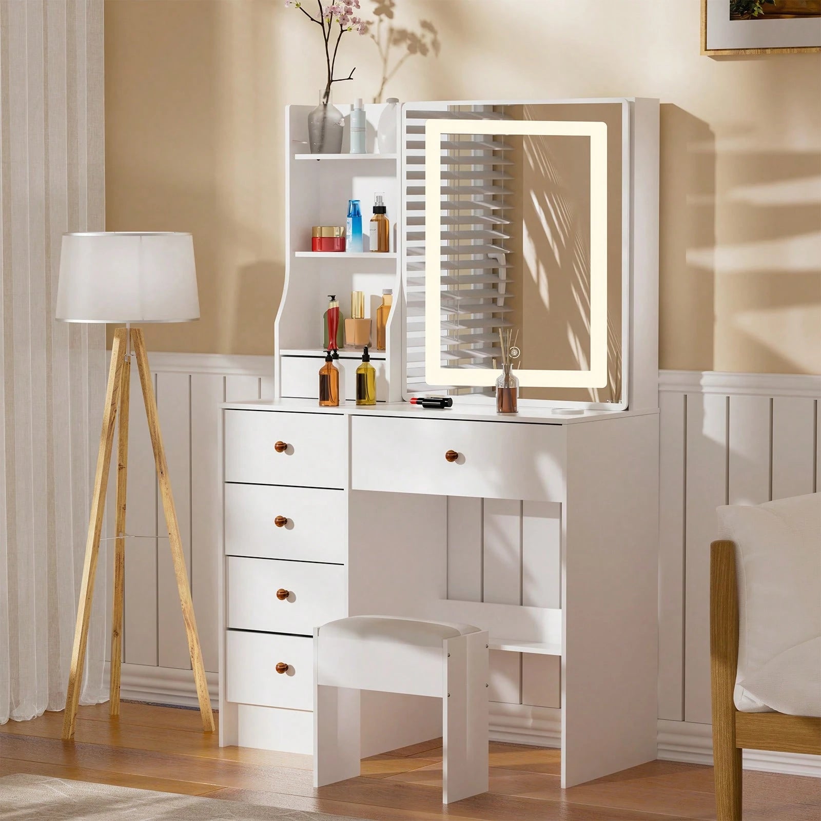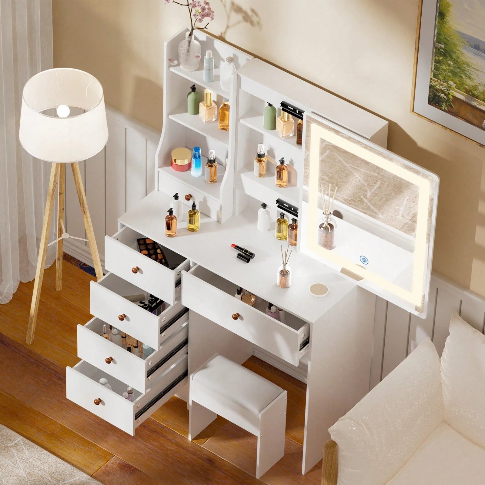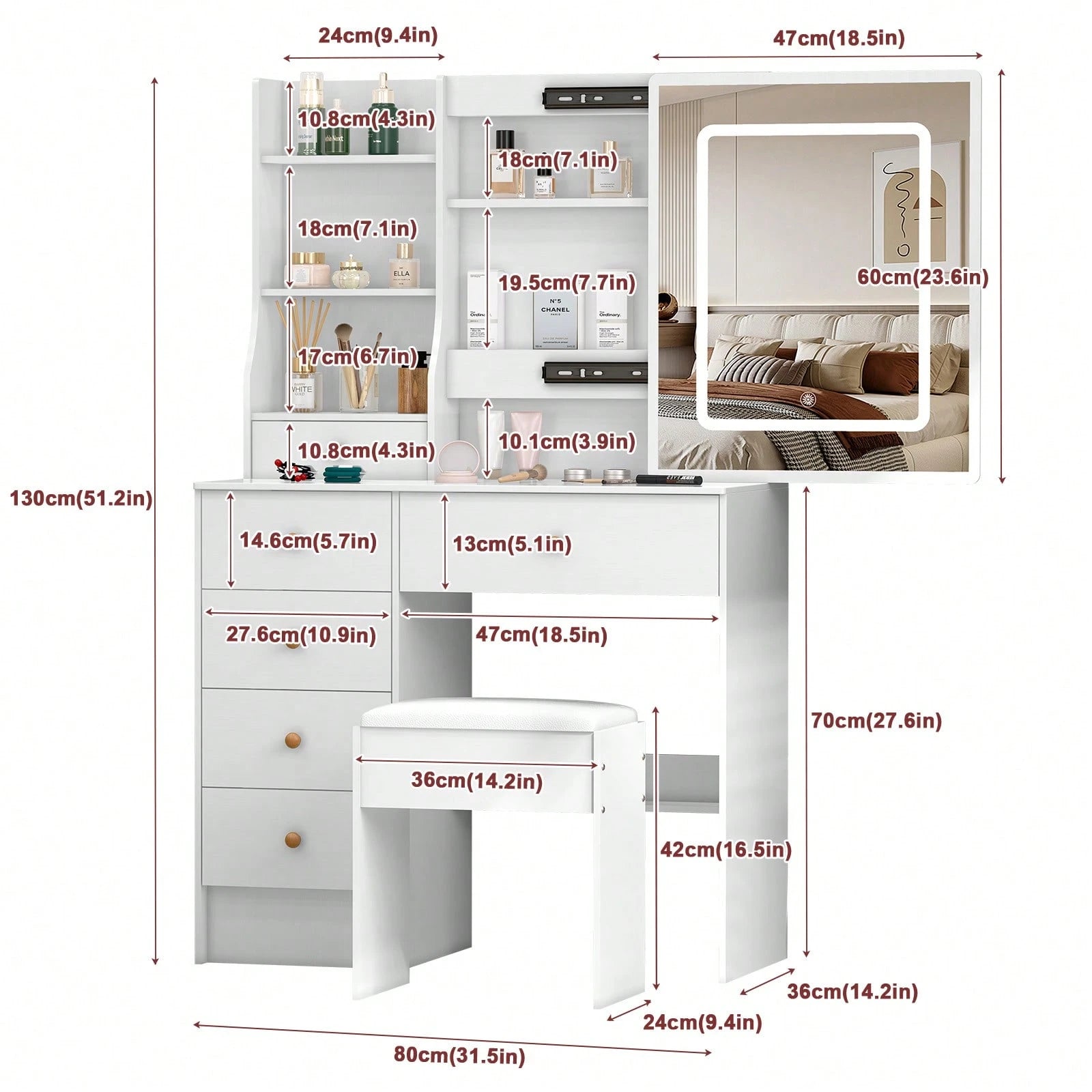 Mobiletto da toeletta da 80 cm con specchio LED, sgabello, 6 cassetti, ripiani aperti multilivello