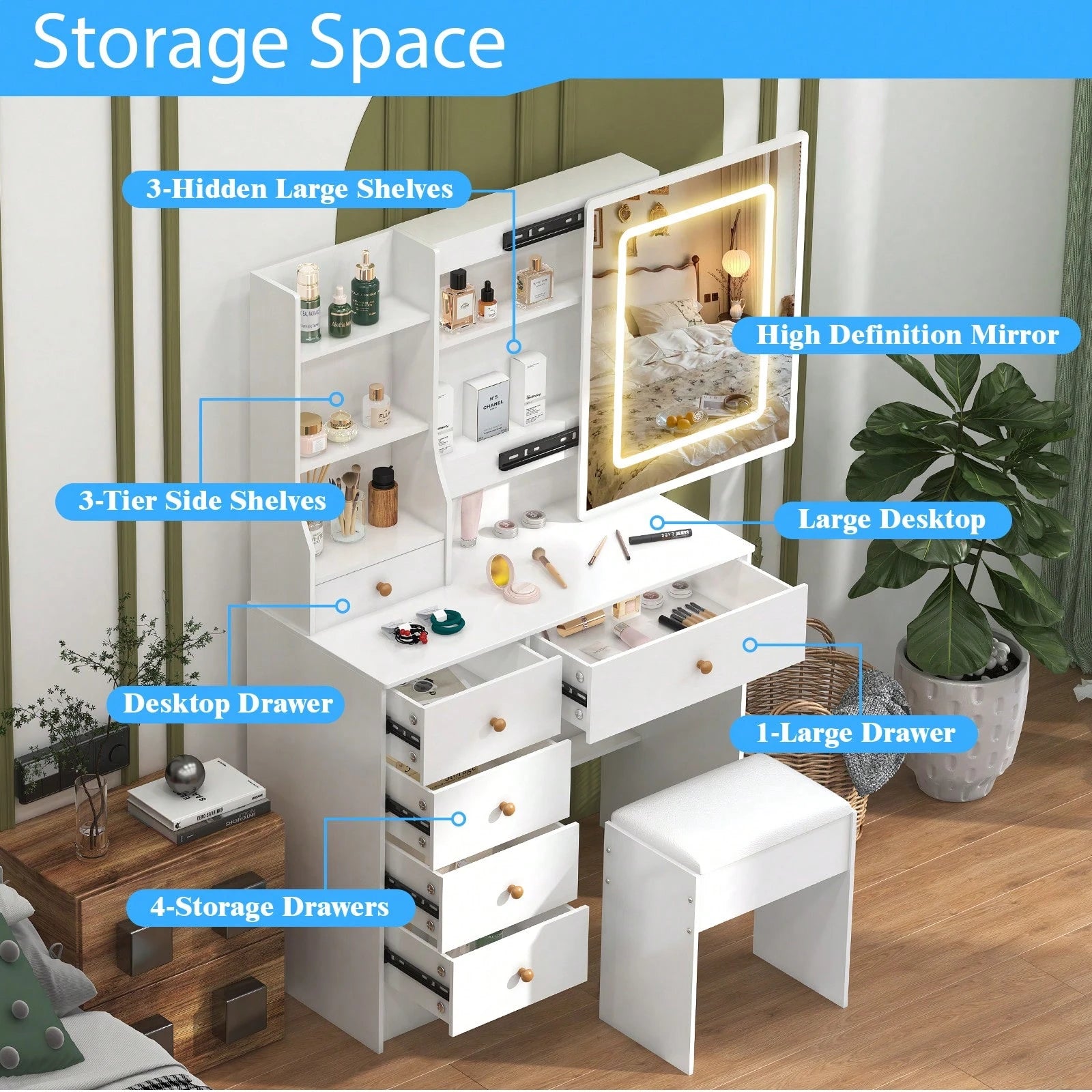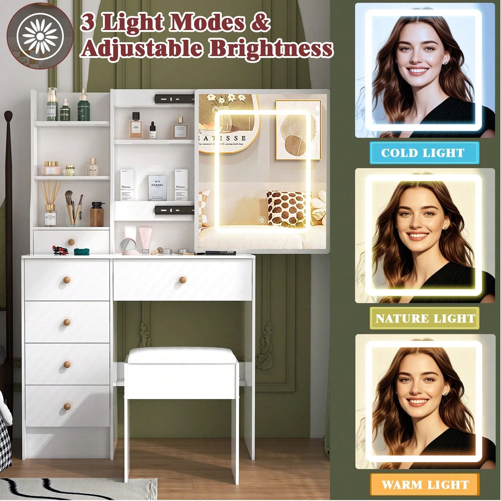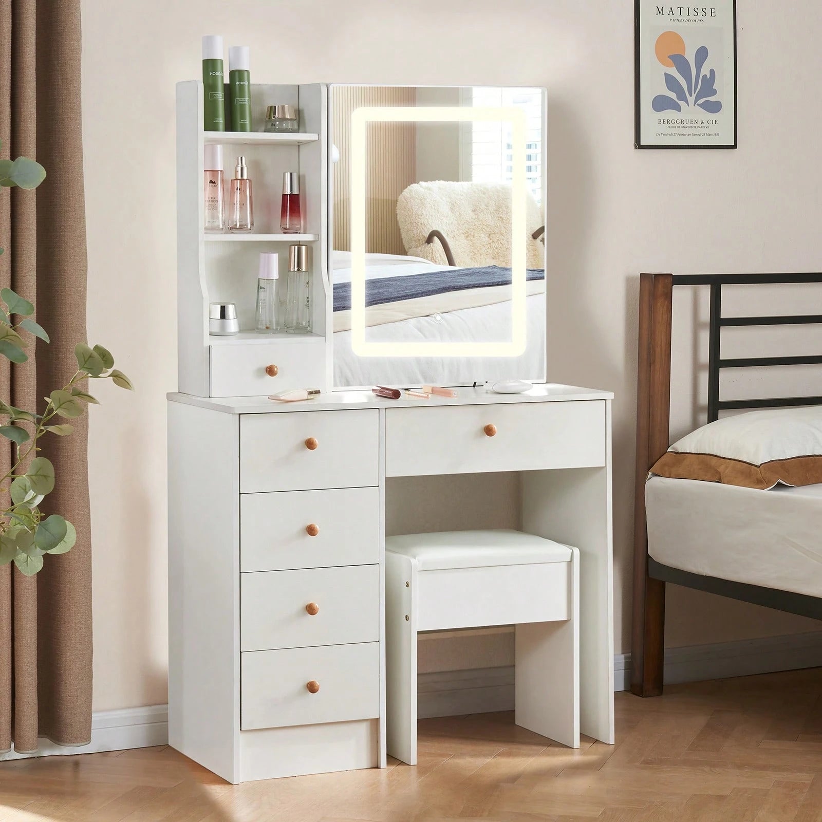 Mobiletto da toeletta da 80 cm con specchio LED, sgabello, 6 cassetti, ripiani aperti multilivello