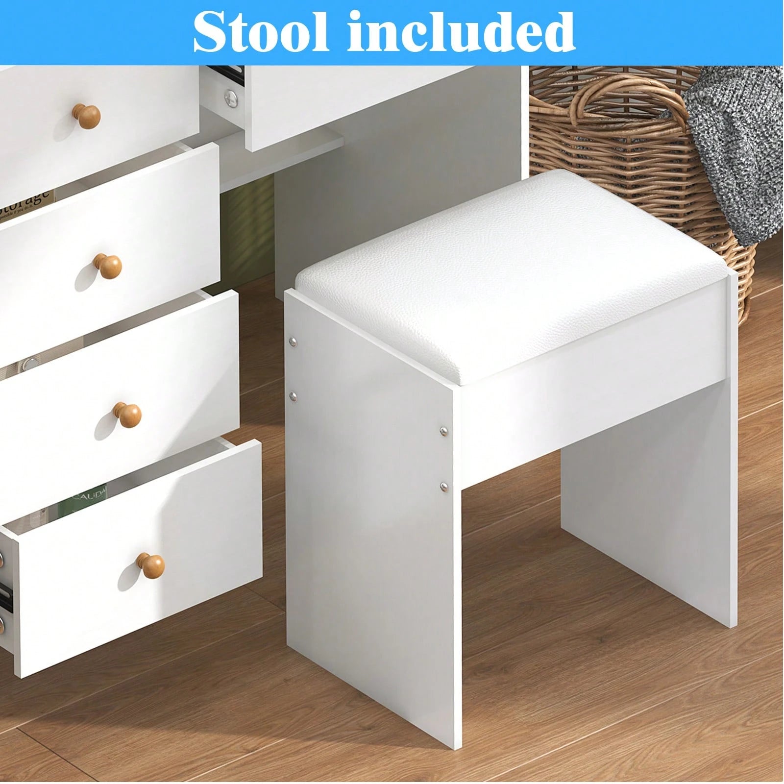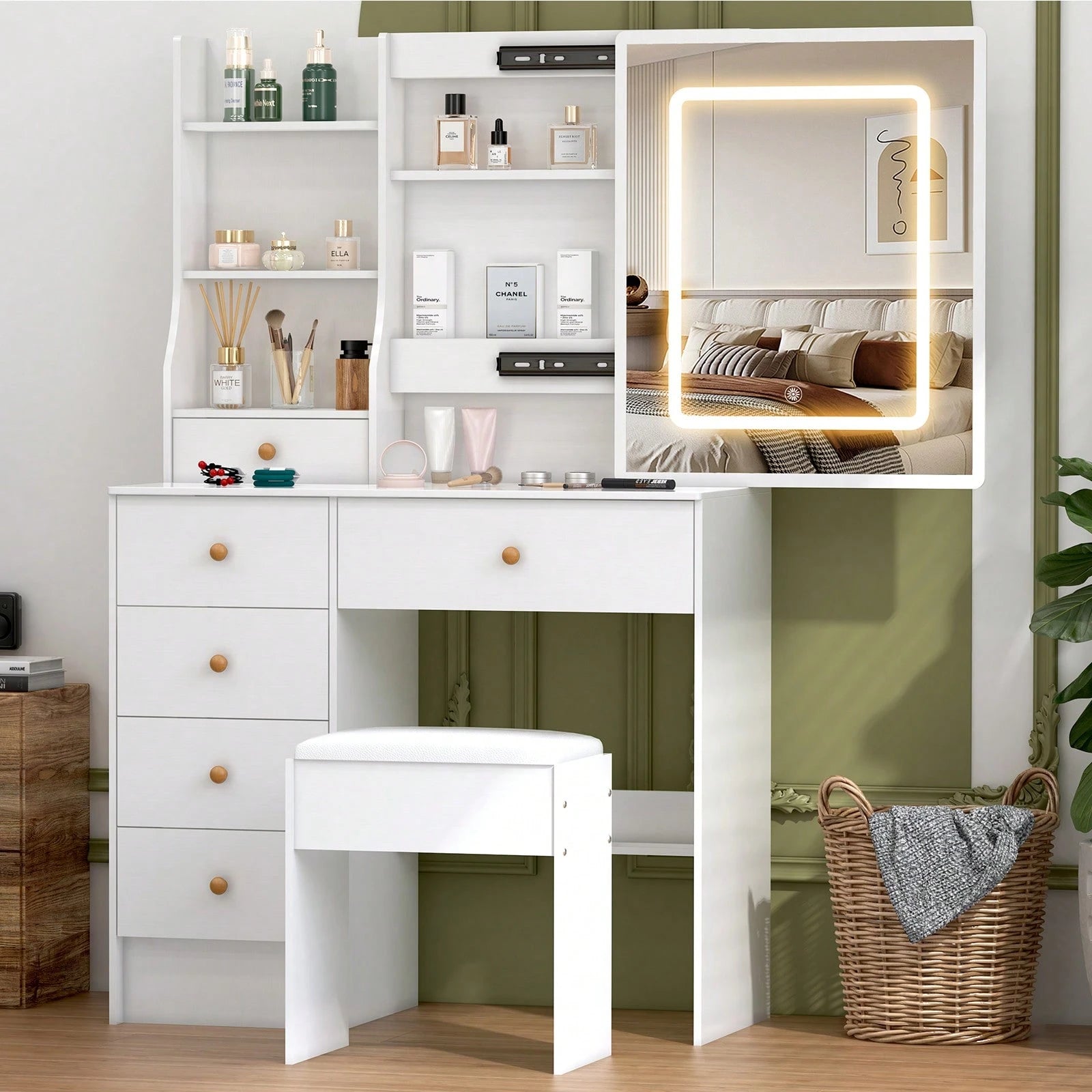 Lo specchio LED offre illuminazione uniforme ideale per la skincare e il trucco. Completo di sgabello coordinato, questo mobile combina praticità e design moderno, trasformando la routine quotidiana in un'esperienza più confortevole e ordinata.