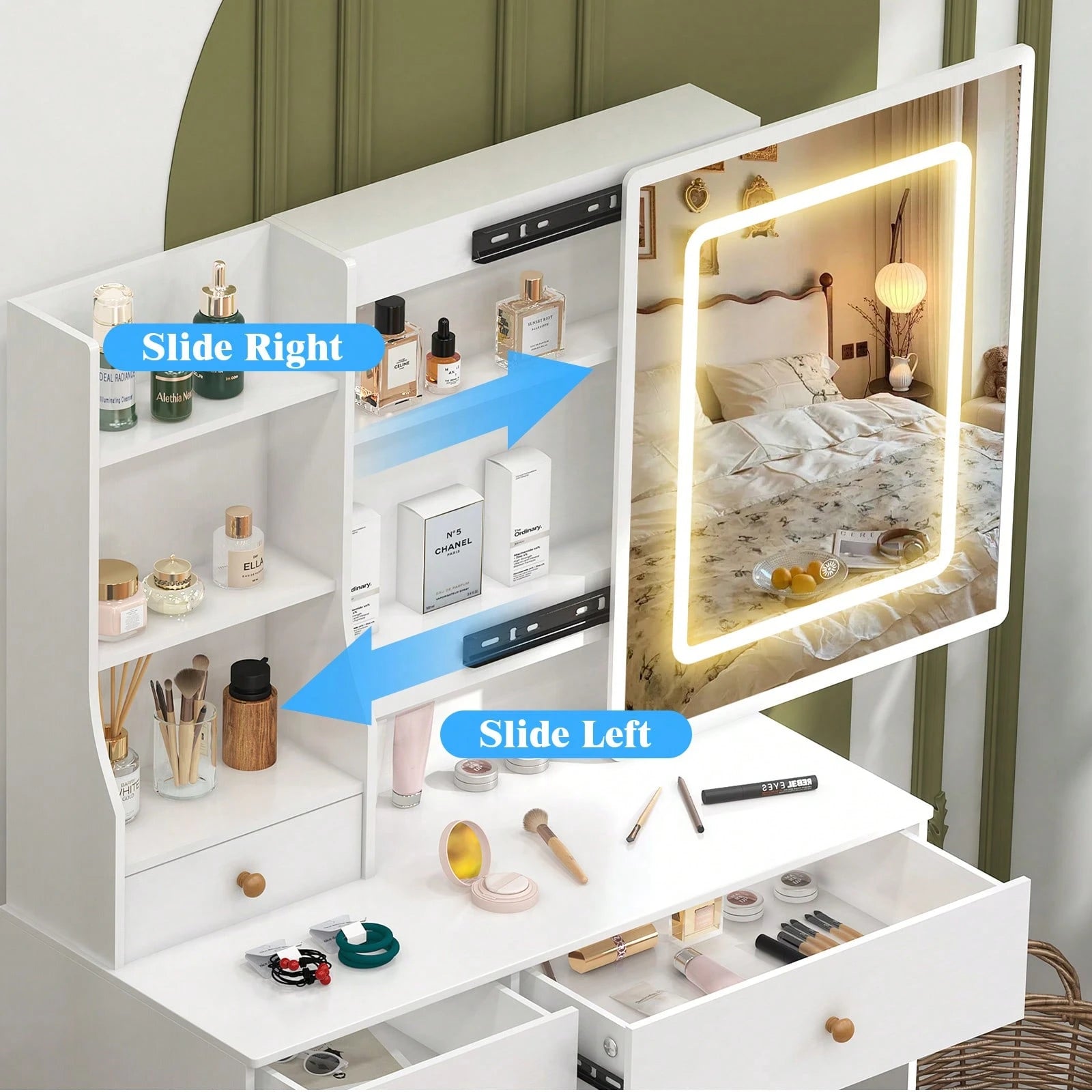 Dotato di 6 cassetti funzionali per l'organizzazione dei cosmetici e degli accessori, oltre a ripiani aperti multilivello che garantiscono accesso immediato agli articoli di uso frequente.