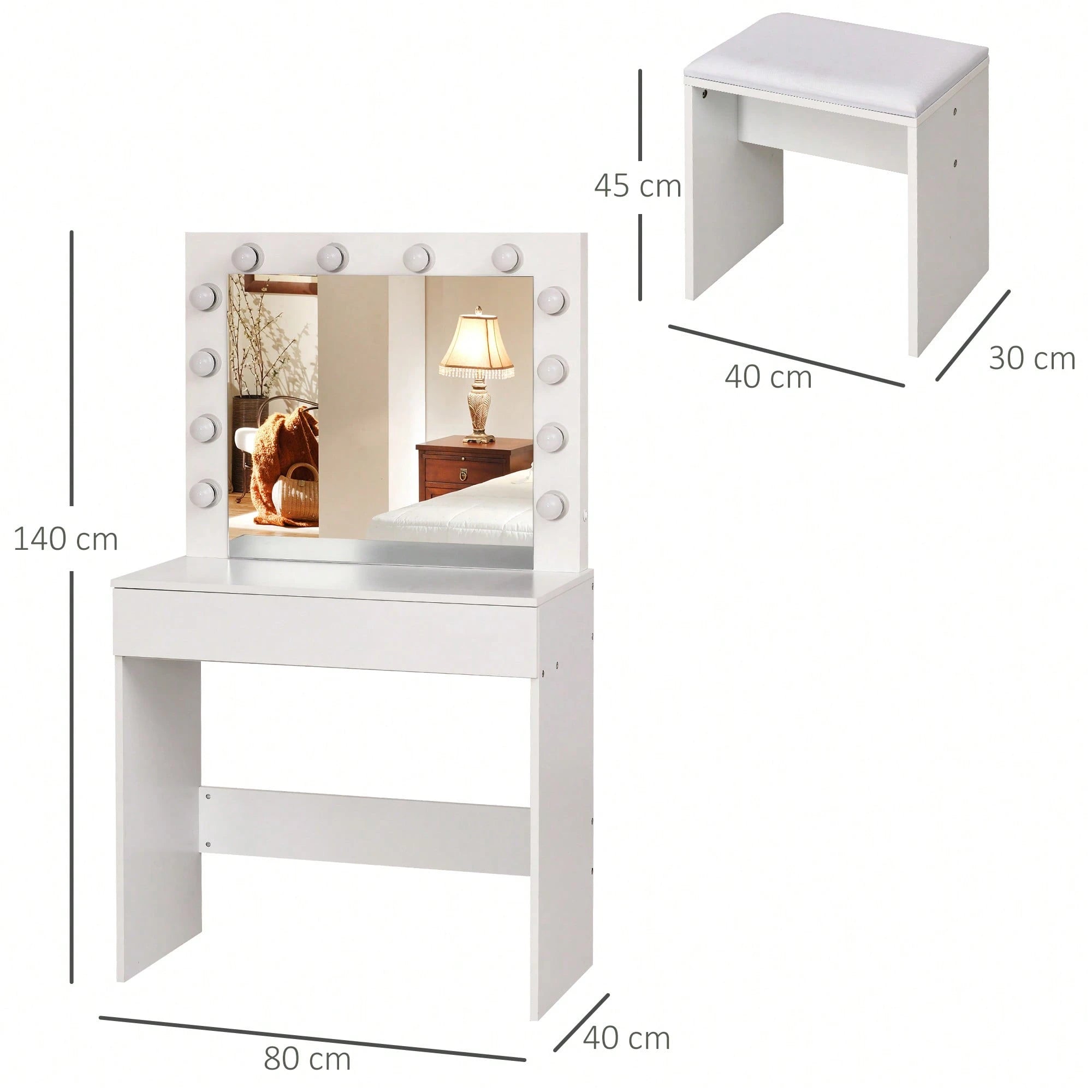 Set Tavolo da Trucco Toeletta con Specchio Sgabello 80x40x140 cm, Bianco