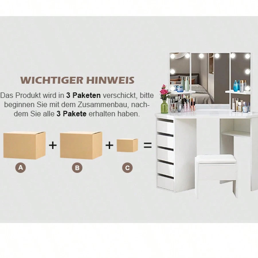 Trasforma la tua routine di bellezza con questo elegante tavolo da toeletta angolare, progettato per massimizzare lo spazio senza compromessi. Lo specchio generoso riflette ogni dettaglio, mentre l'illuminazione LED a 3 colori regolabili (bianca fredda, naturale e calda) garantisce un'applicazione del trucco impeccabile in qualsiasi condizione di luce. I 5...