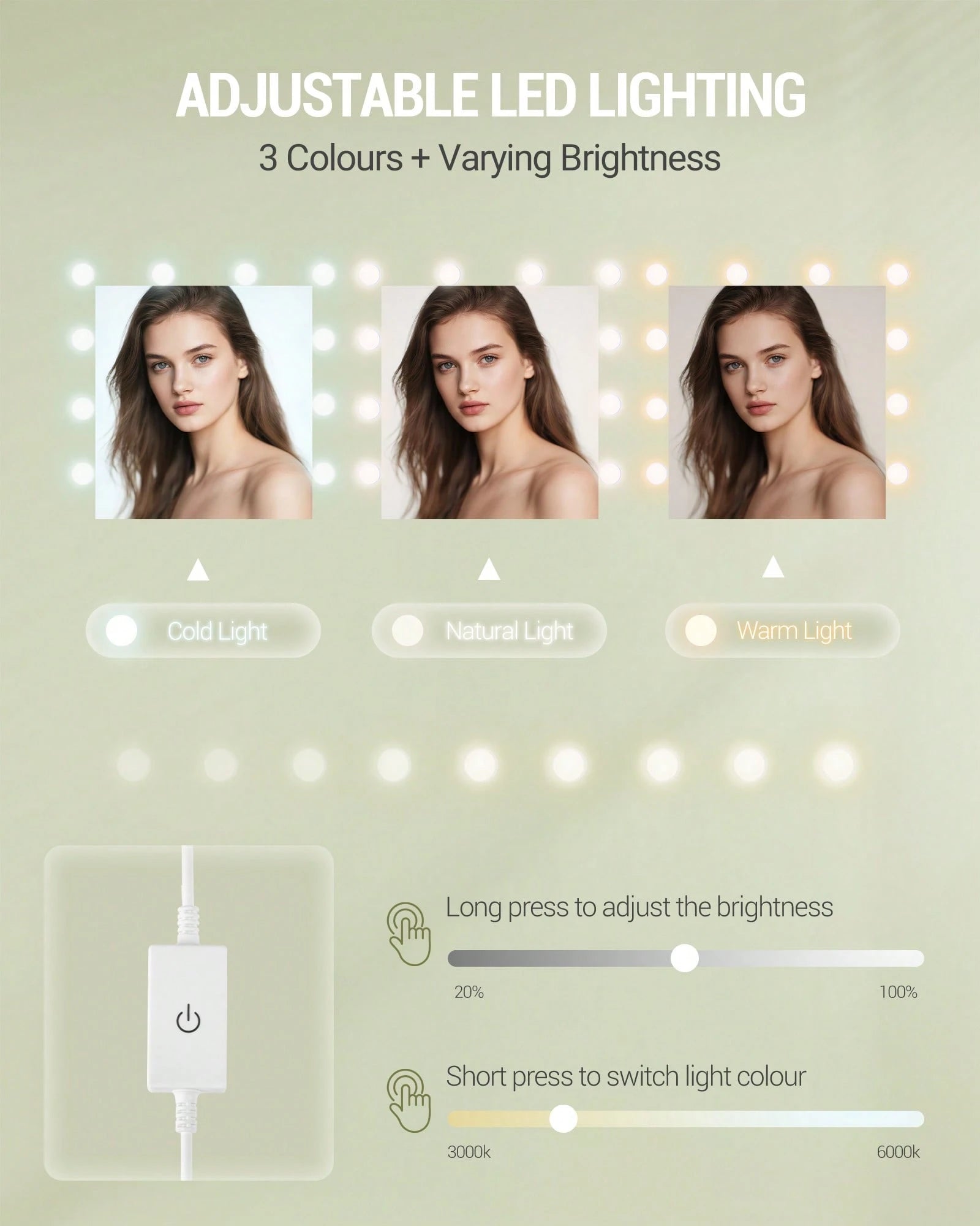 Lo specchio HD di grandi dimensioni con illuminazione LED integrata garantisce una visibilità perfetta per trucco e skincare di precisione.