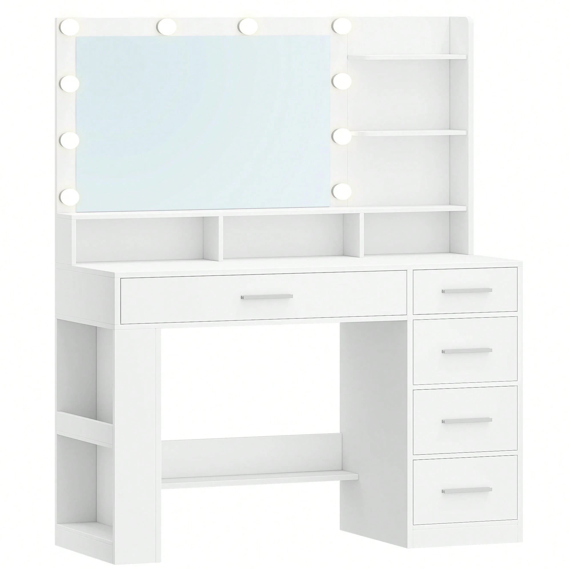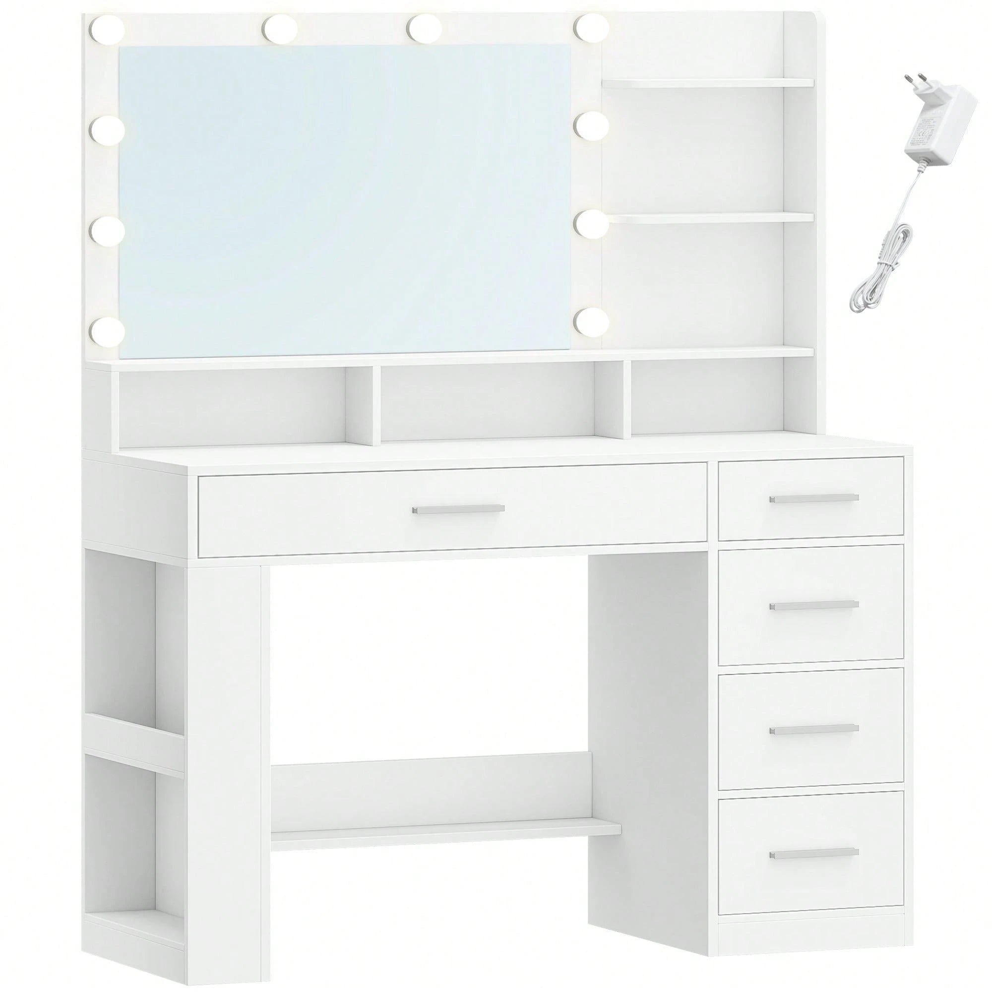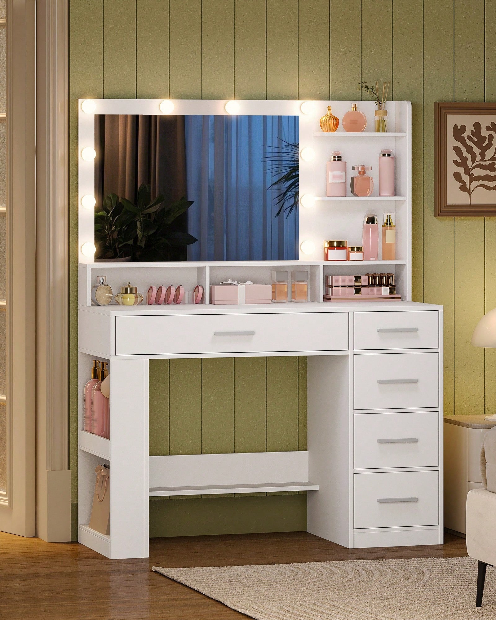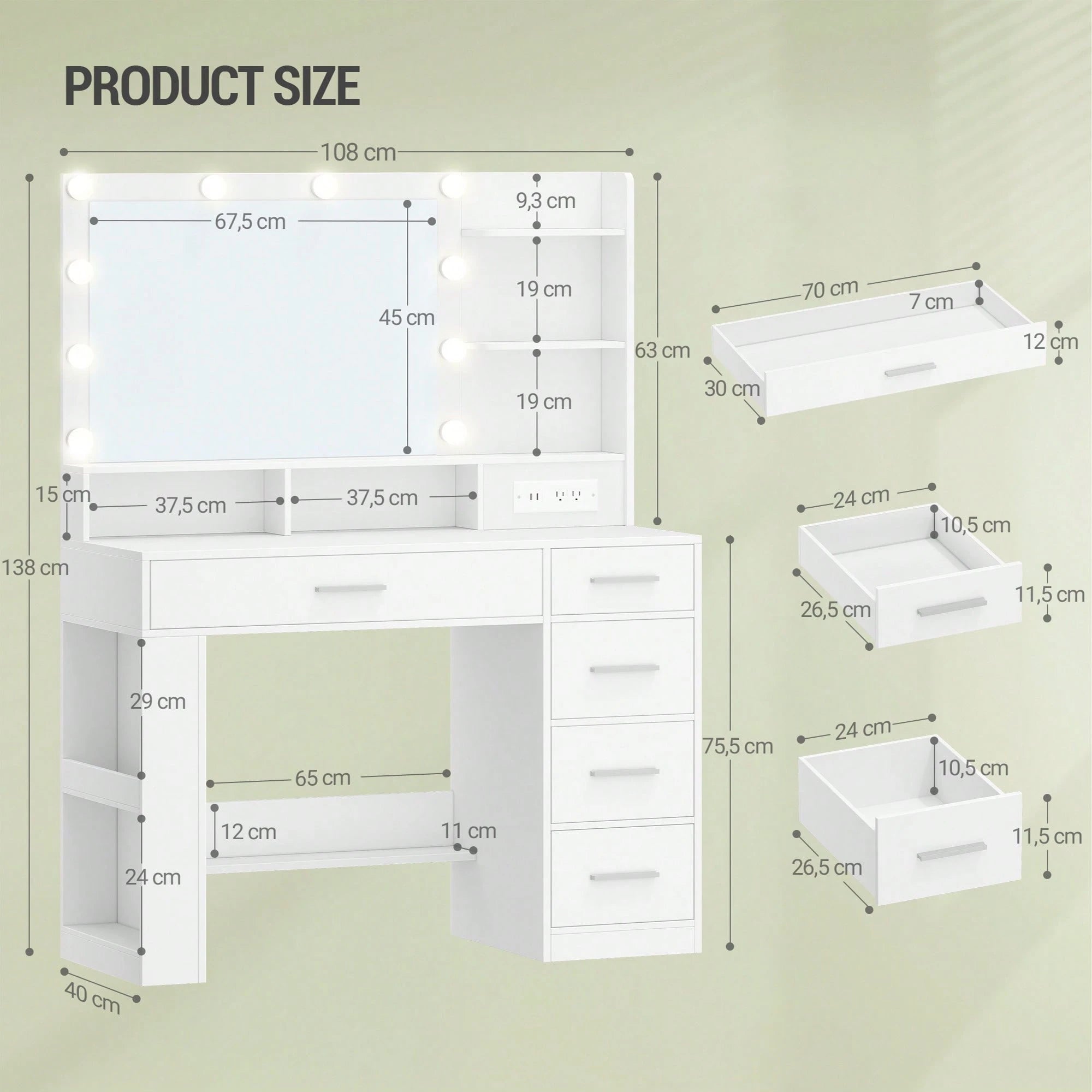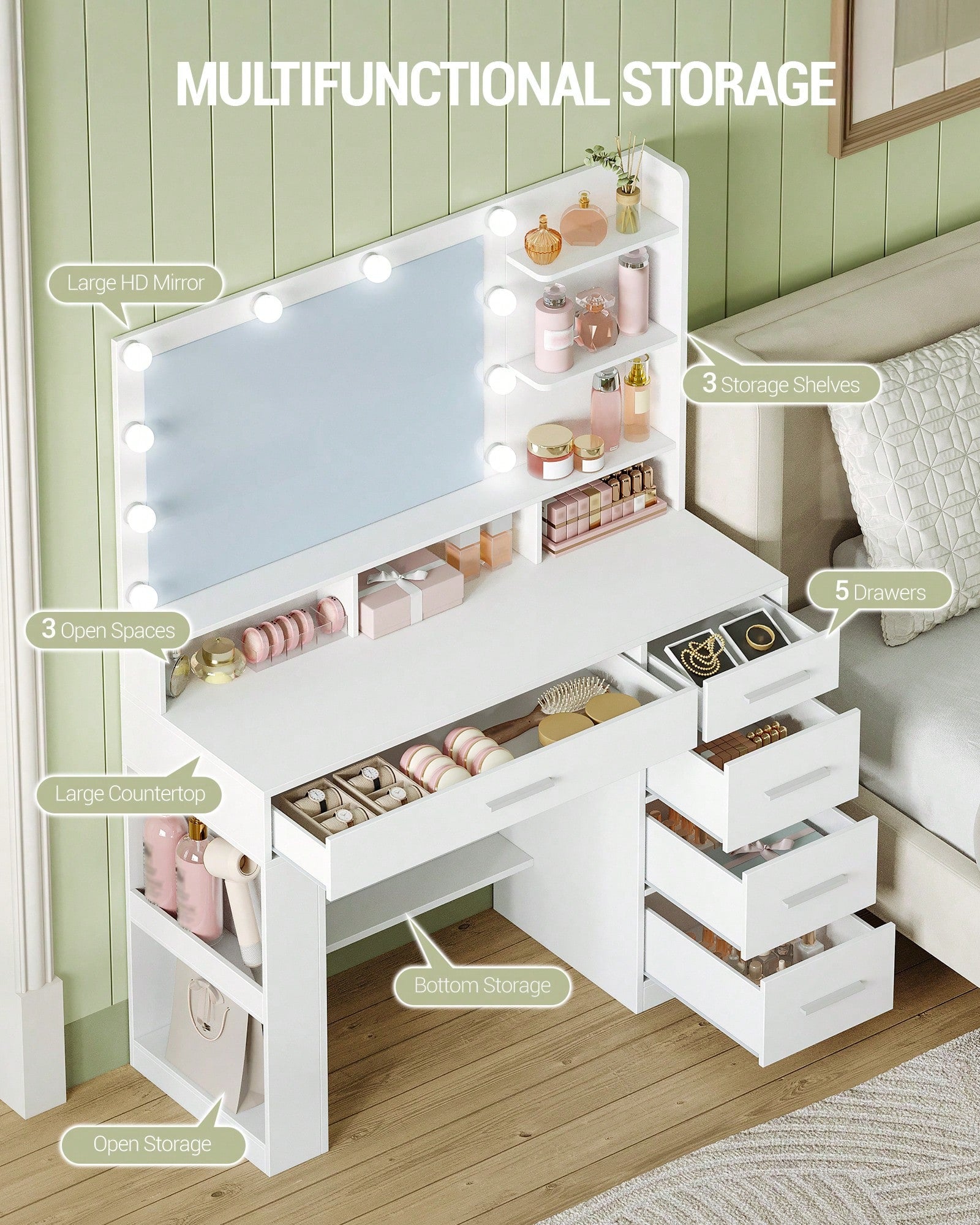 Tavolo da toeletta con grande specchio HD, tavolo da trucco con luce LED, 6 scomparti aperti, 5 cassetti