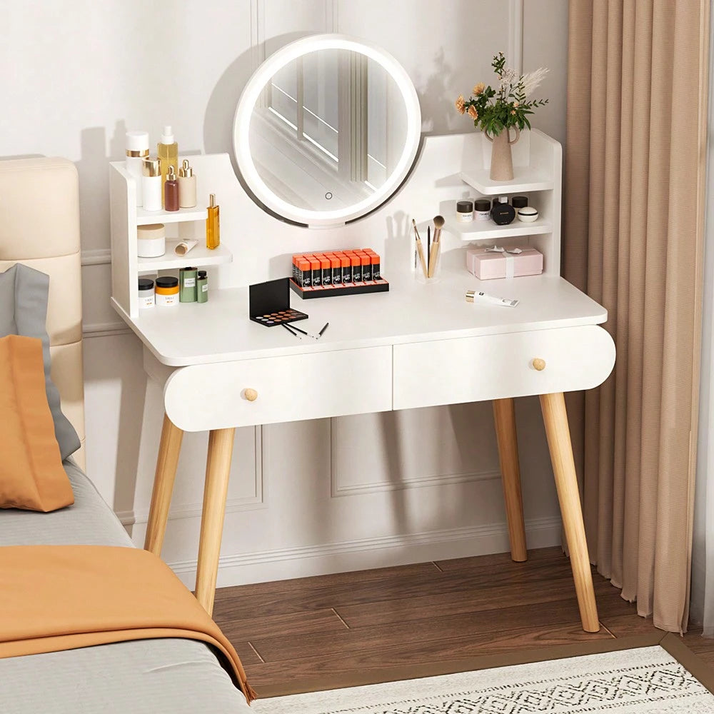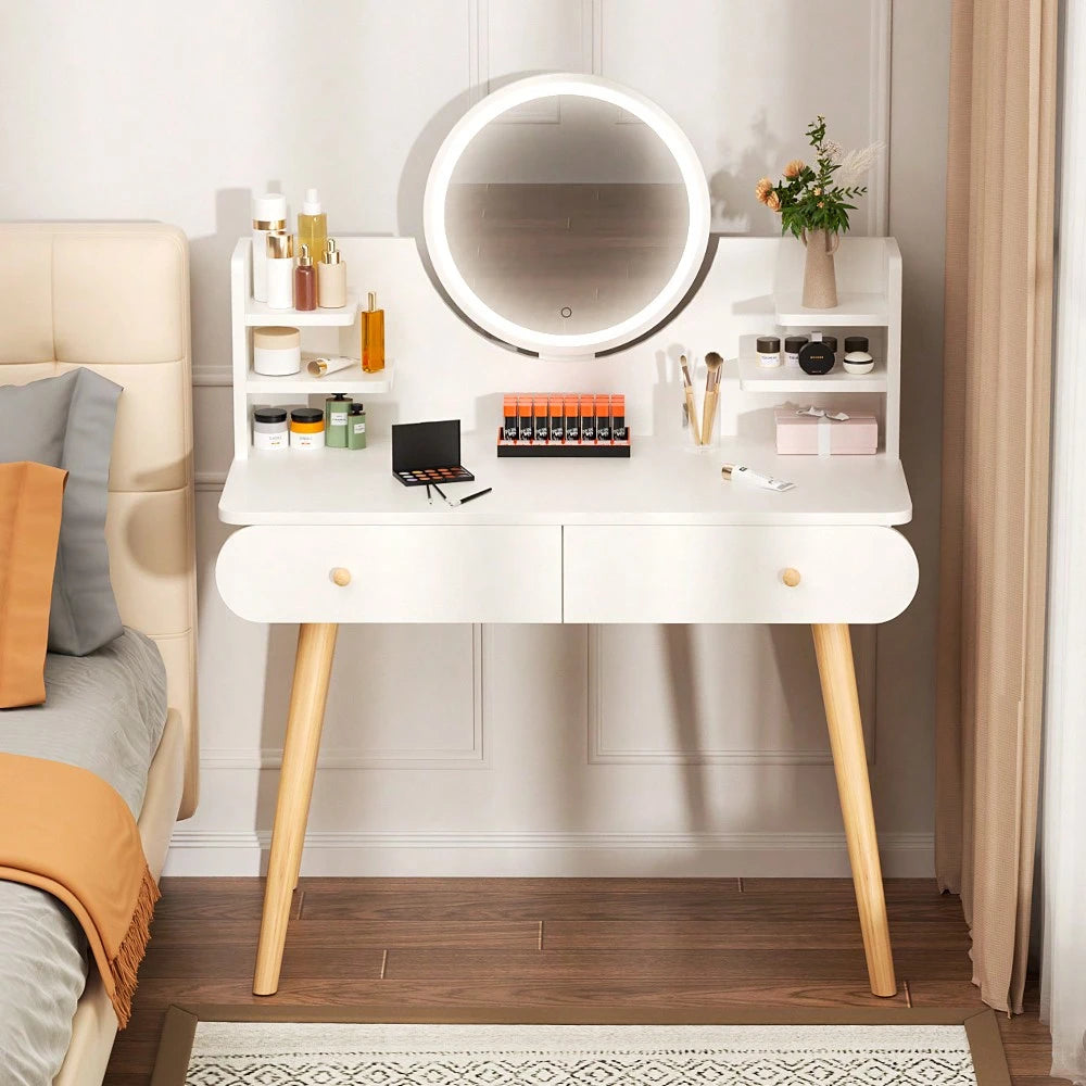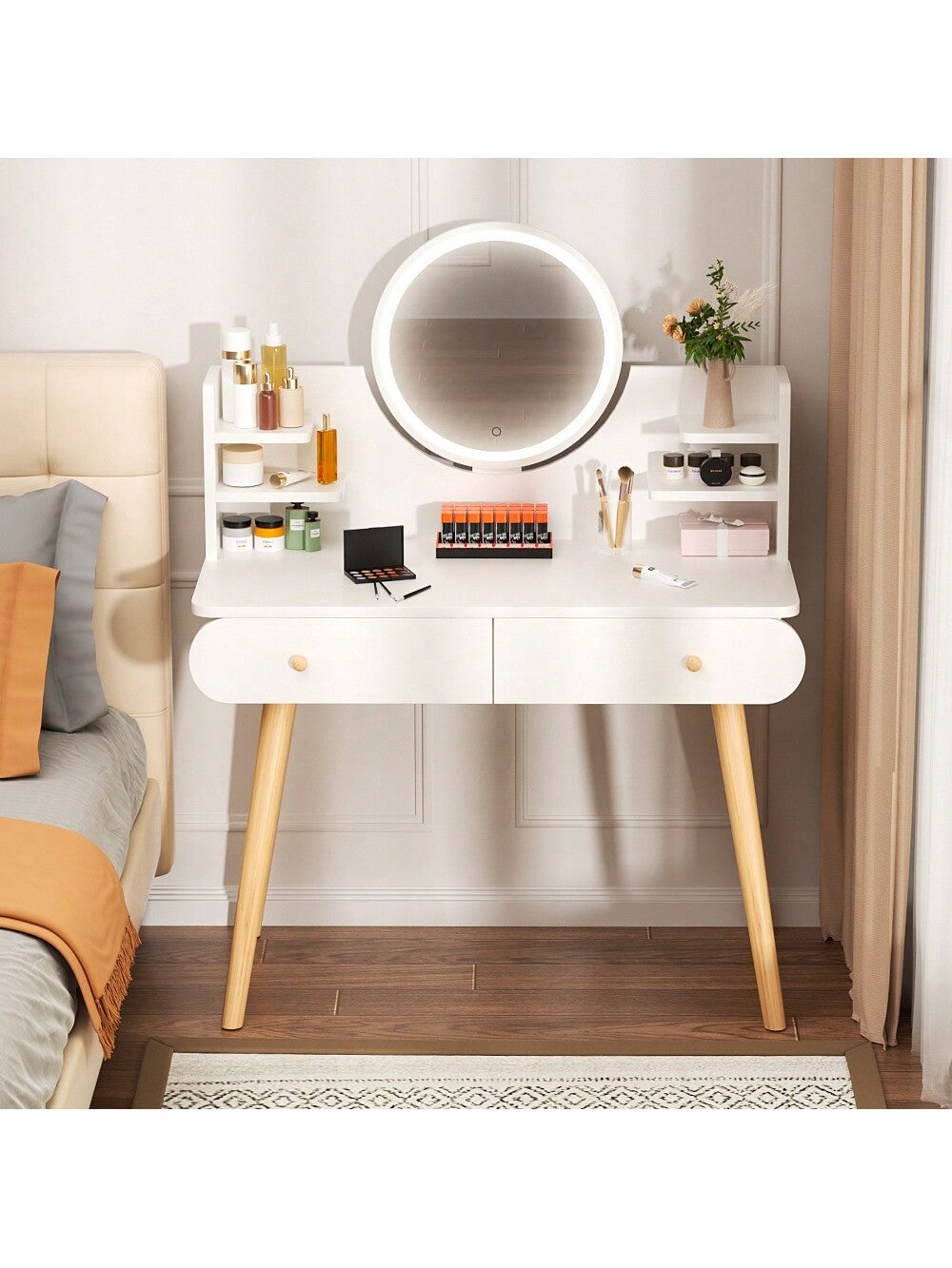 Tavolo Trucco in Legno, Con Specchio LED Regolabile, 2 Cassetti, Mensole Multistrato, Top Tavolo Rinforzato e Spesso, Facile da Montare