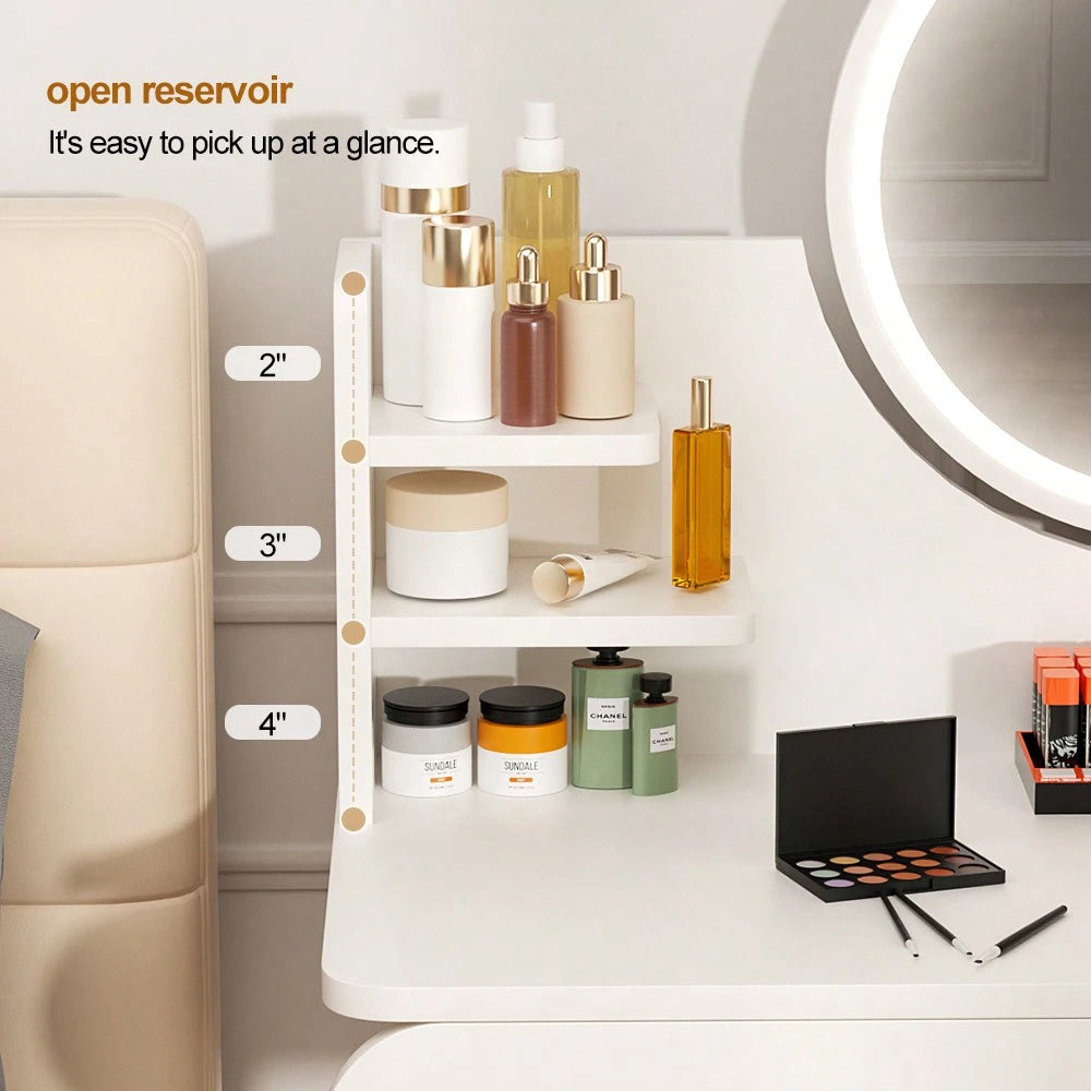 Dotato di 2 cassetti capienti per organizzare cosmetici e accessori, mensole multistrato che garantiscono stabilità e capacità di carico.