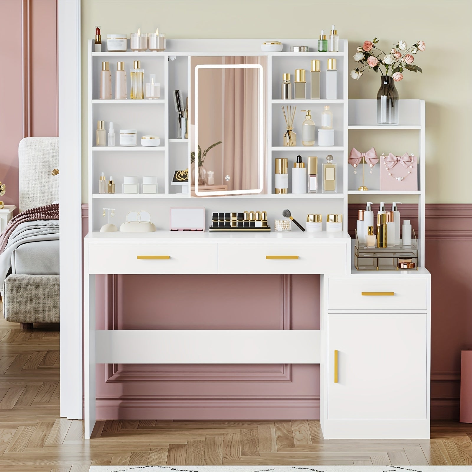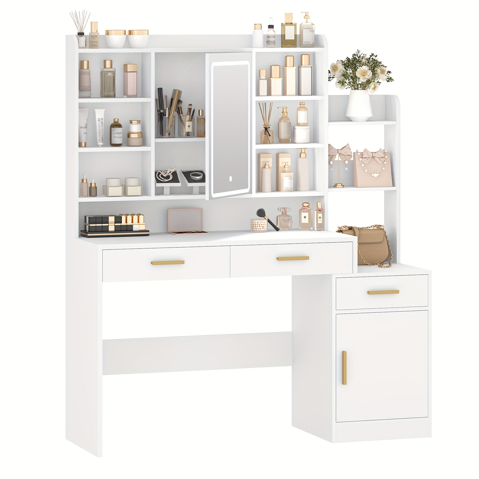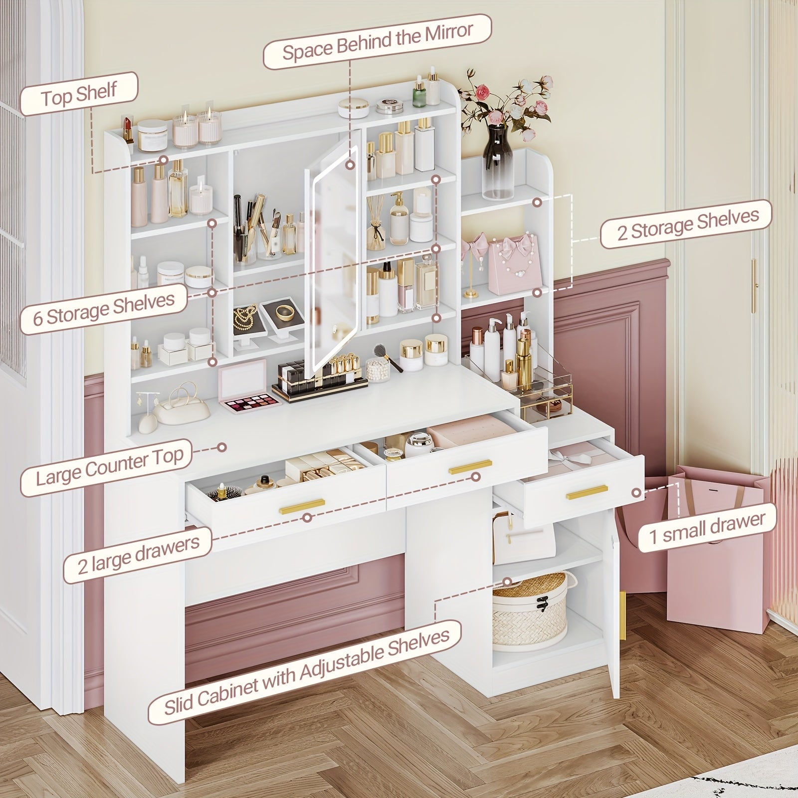 Toeletta Ampio Piano con Specchio, 3 Cassetti e 1 Armadio, Scaffali Multiplani Aperti