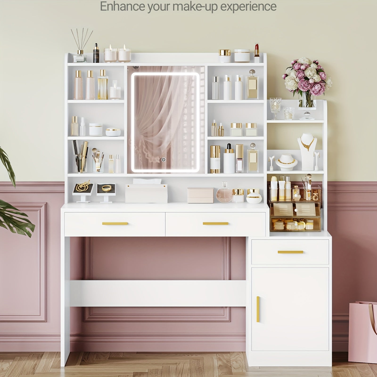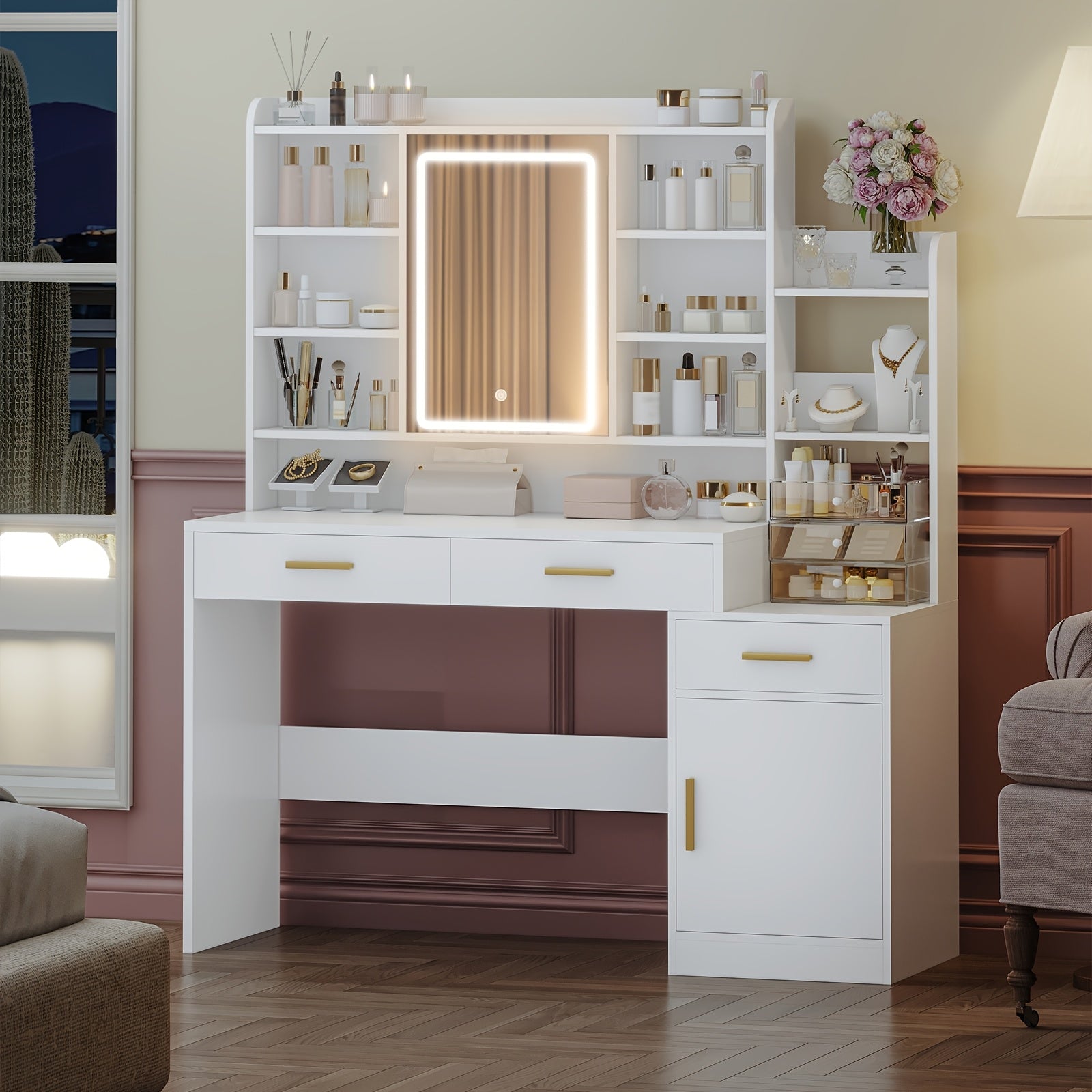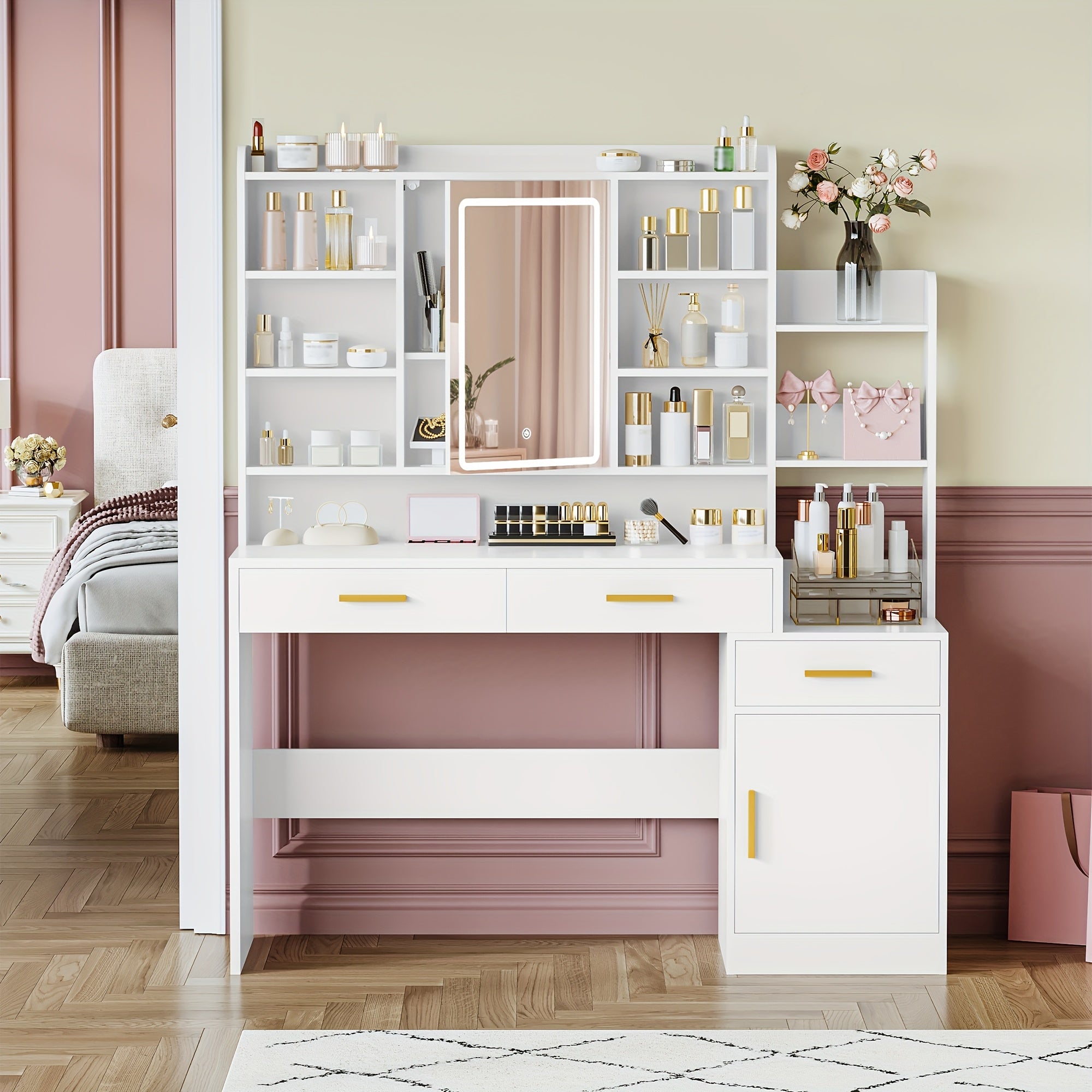 Toeletta Ampio Piano con Specchio, 3 Cassetti e 1 Armadio, Scaffali Multiplani Aperti