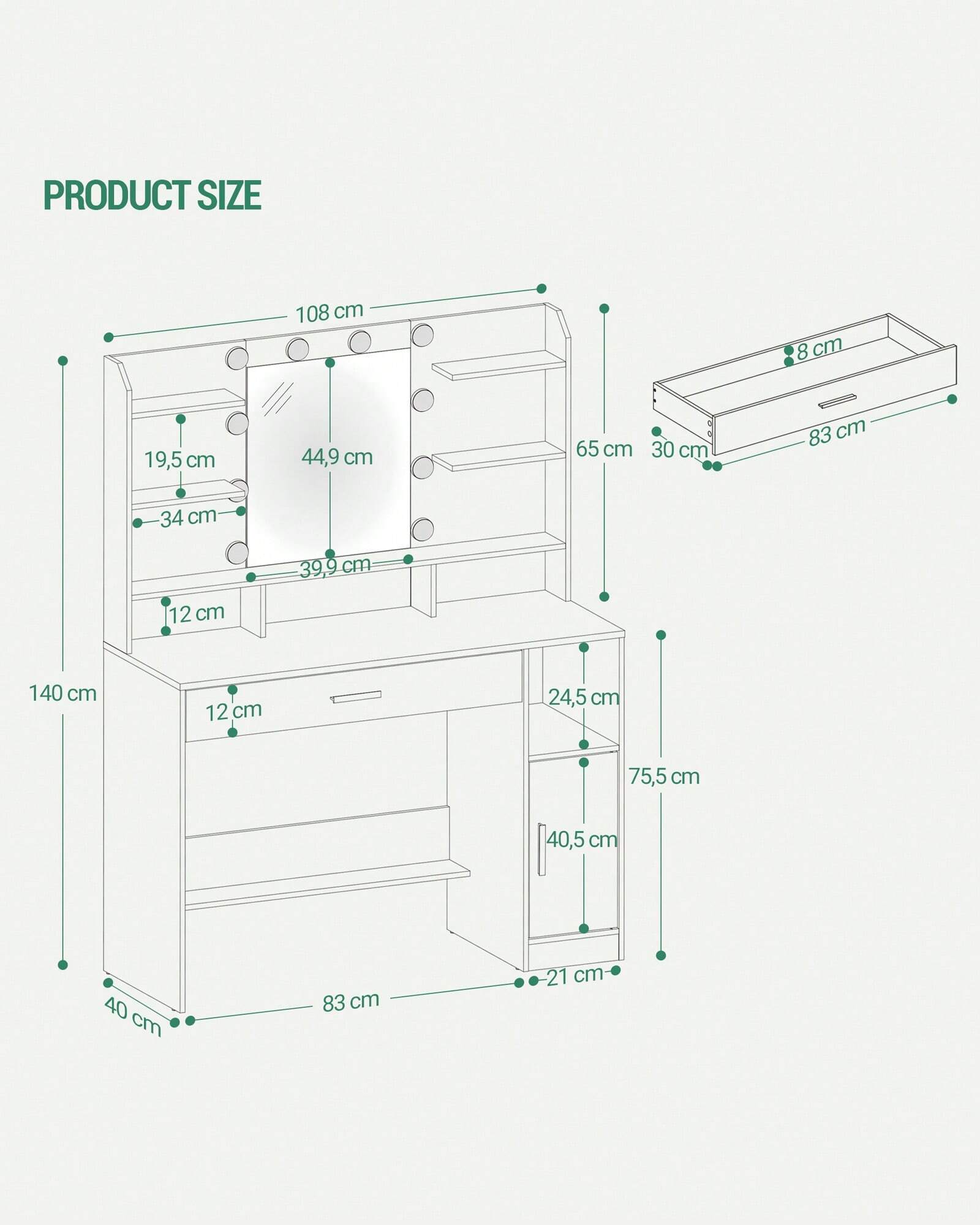 Realizzata con materiali di qualità, questa toeletta combina praticità e design contemporaneo, trasformando il bagno o la camera da letto in un'area wellness personale.