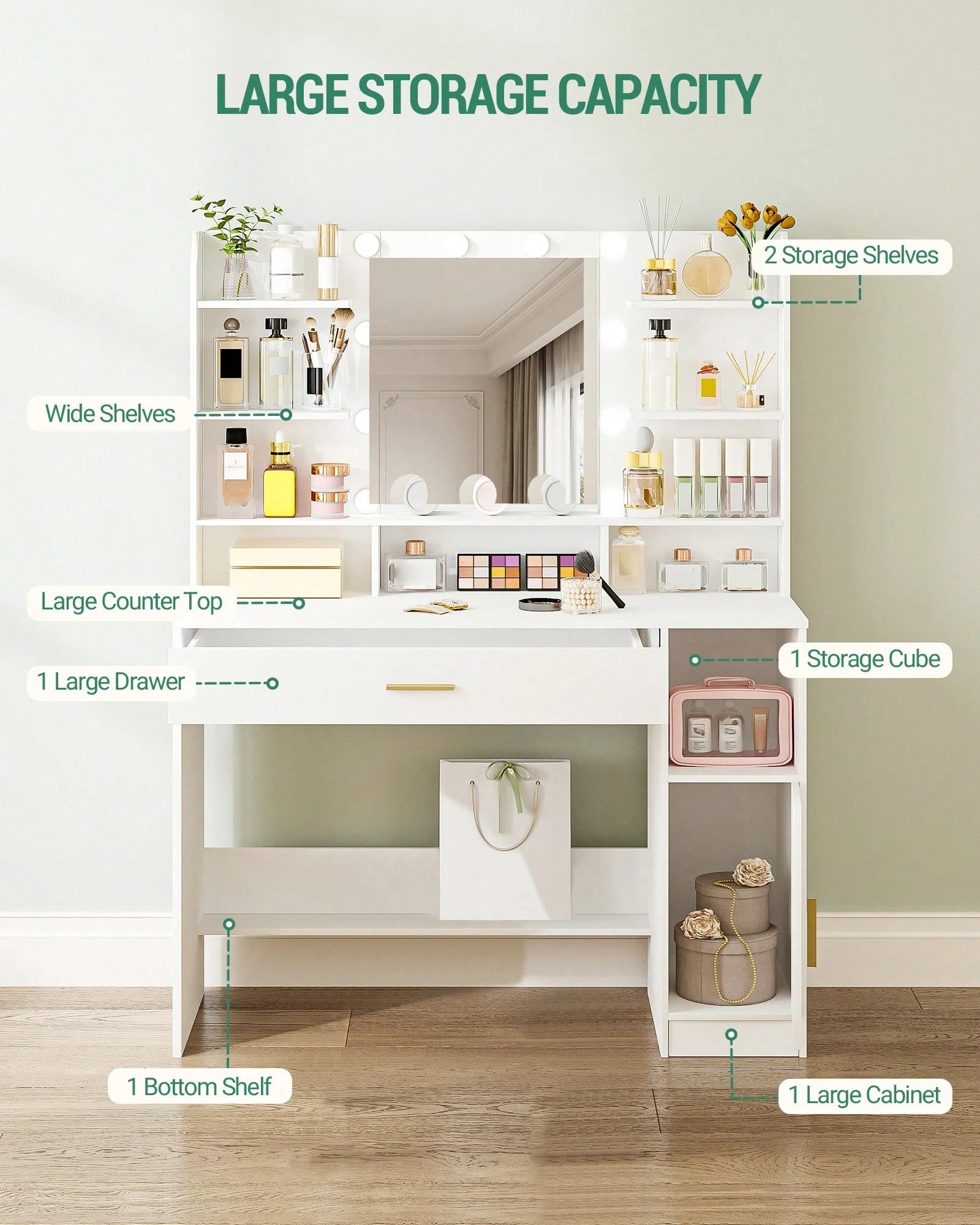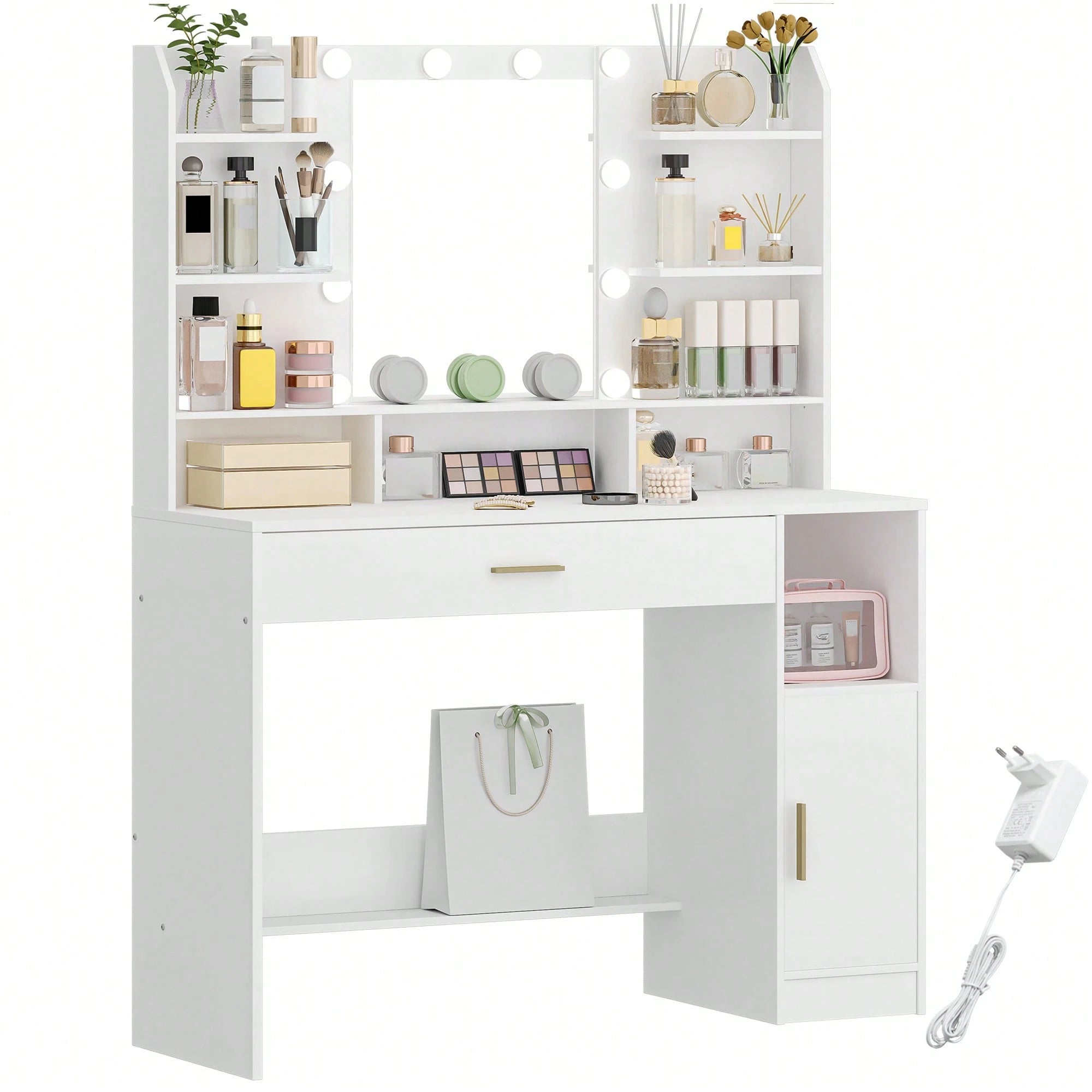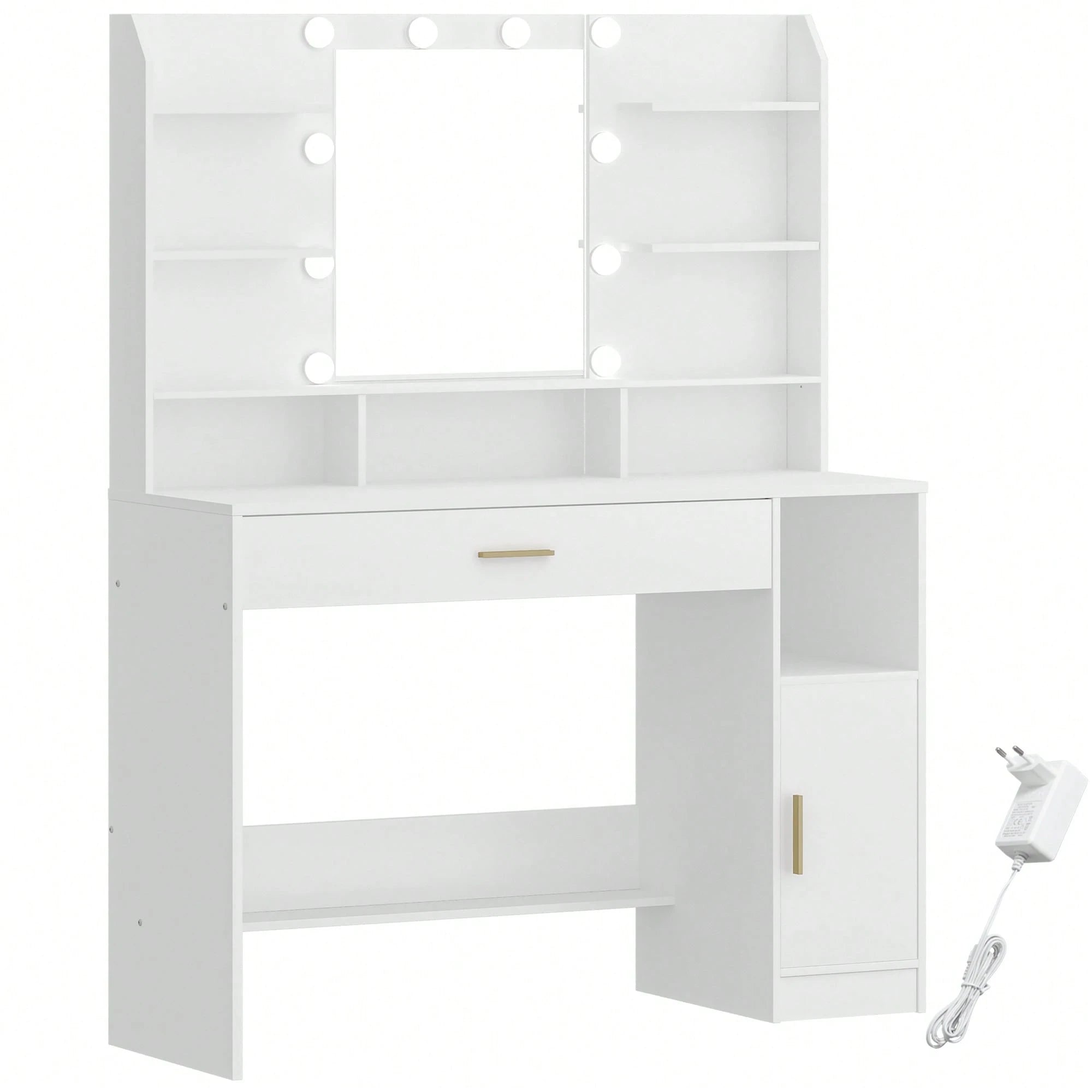 Toeletta Ampio Piano d'appoggio con Specchio Luminosità Regolabile con Cassetti e Armadietti