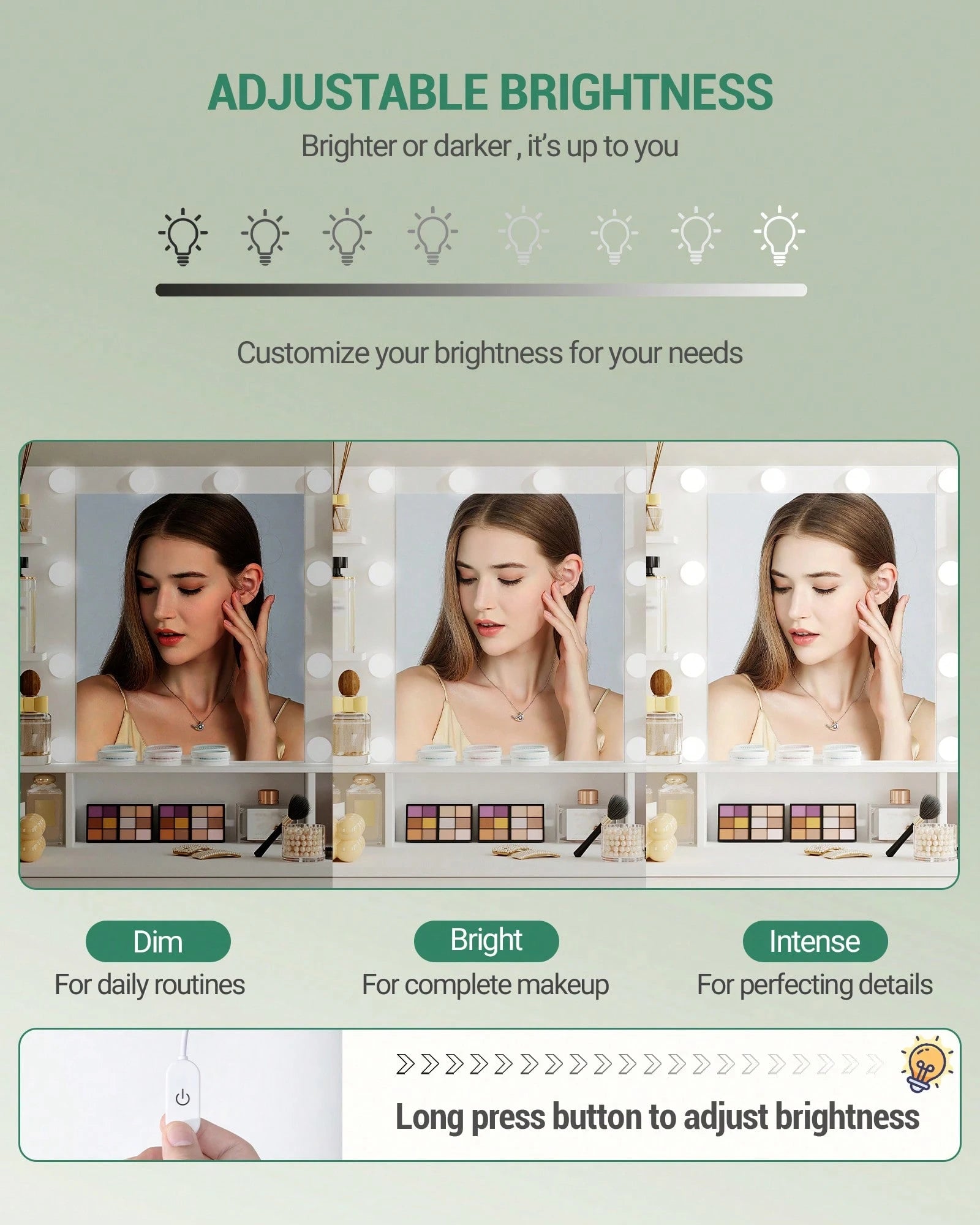 Lo specchio integrato con luminosità regolabile garantisce un'illuminazione ottimale per trucco e skincare adattandosi alle diverse condizioni di luce.