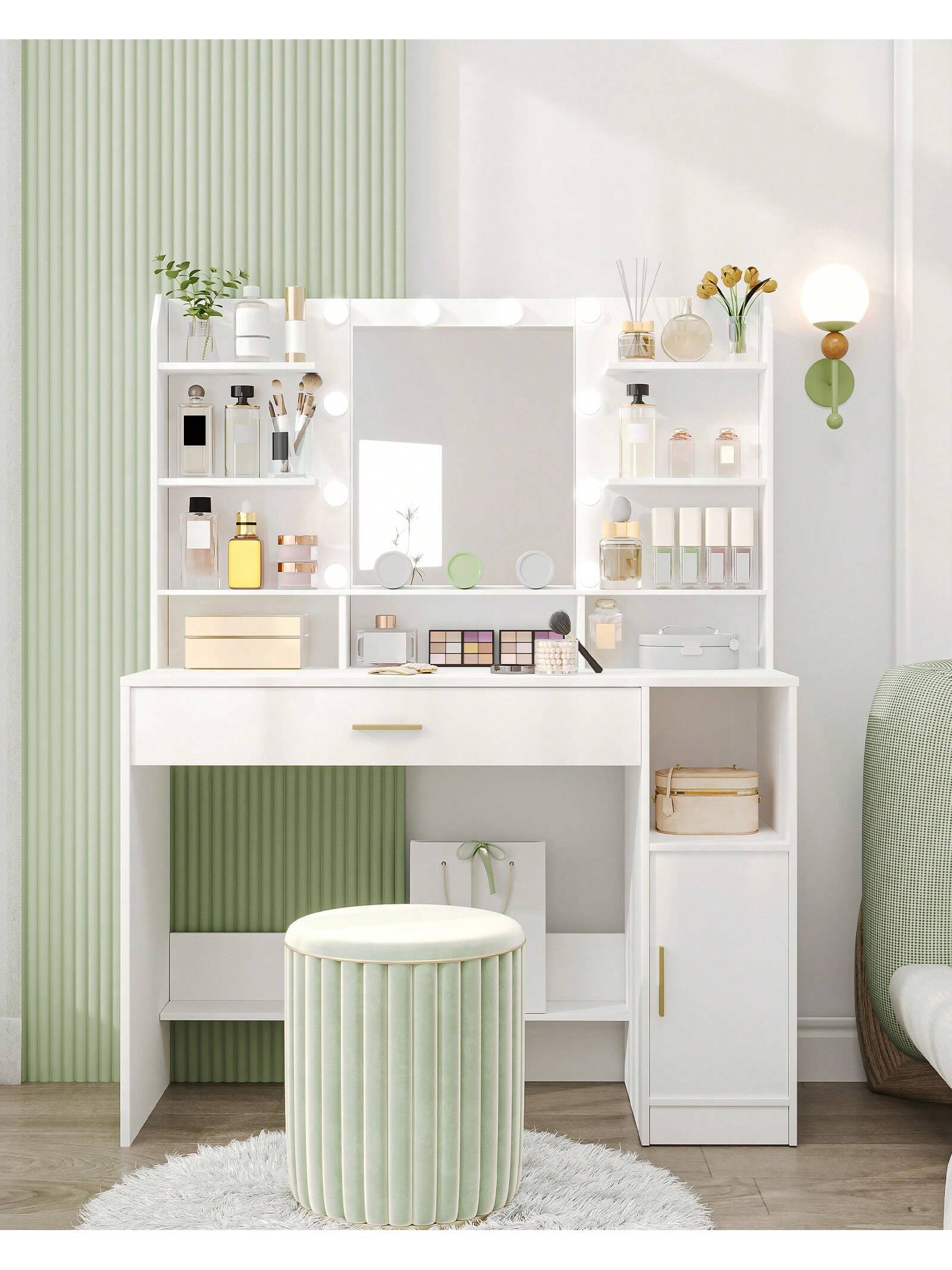 Toeletta elegante e funzionale con ampio piano d'appoggio, ideale per creare uno spazio dedicato alla cura personale. Lo specchio integrato con luminosità regolabile garantisce un'illuminazione ottimale per trucco e skincare adattandosi alle diverse condizioni di luce. I cassetti e gli armadietti offrono soluzioni di stoccaggio intelligenti per organizzare cosmetici, accessori...