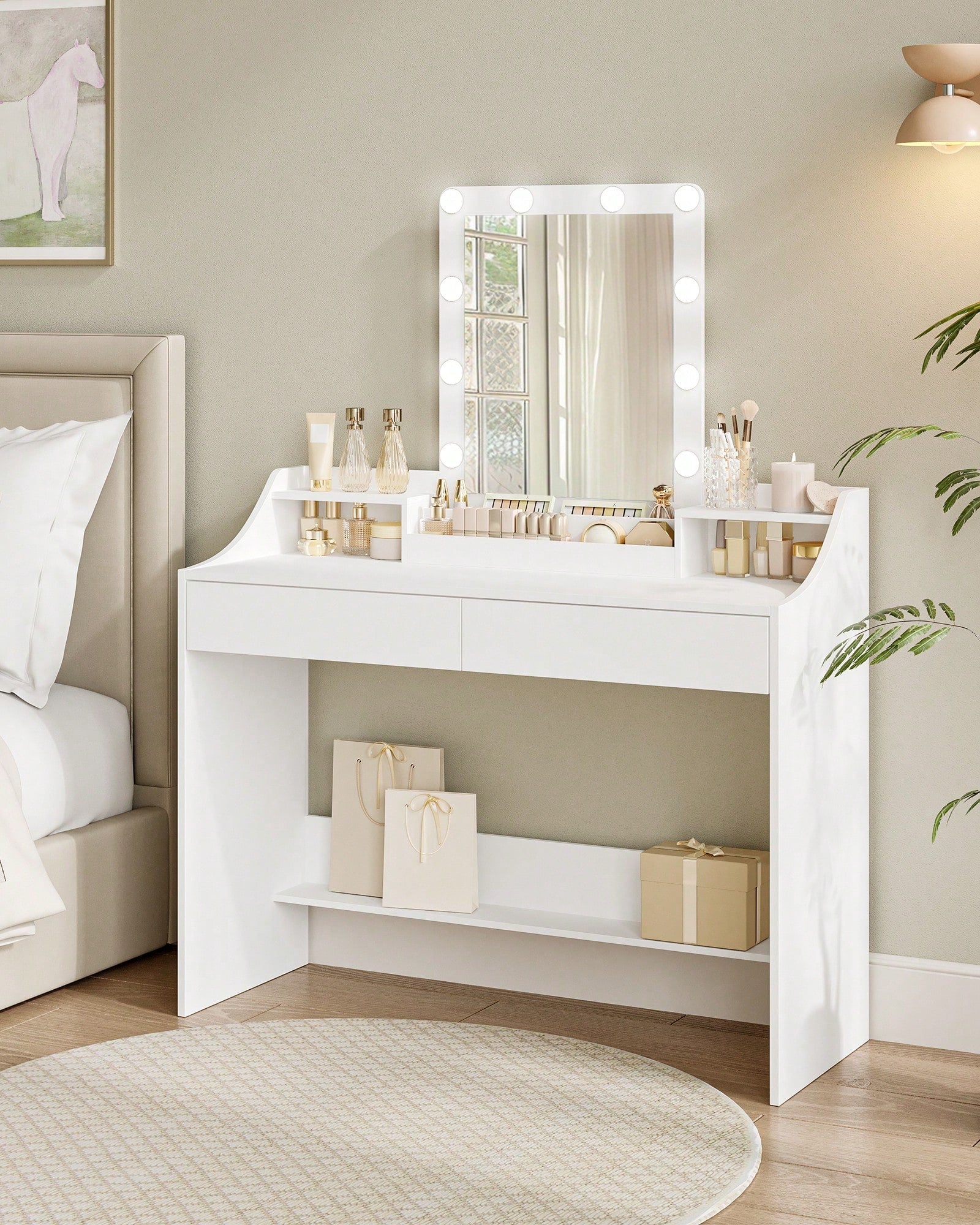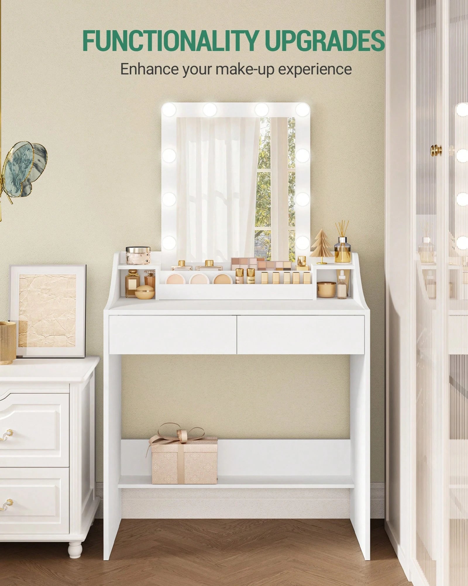 Questa toeletta con specchio e illuminazione a LED regolabile ti offre la luce perfetta per ogni momento della giornata.