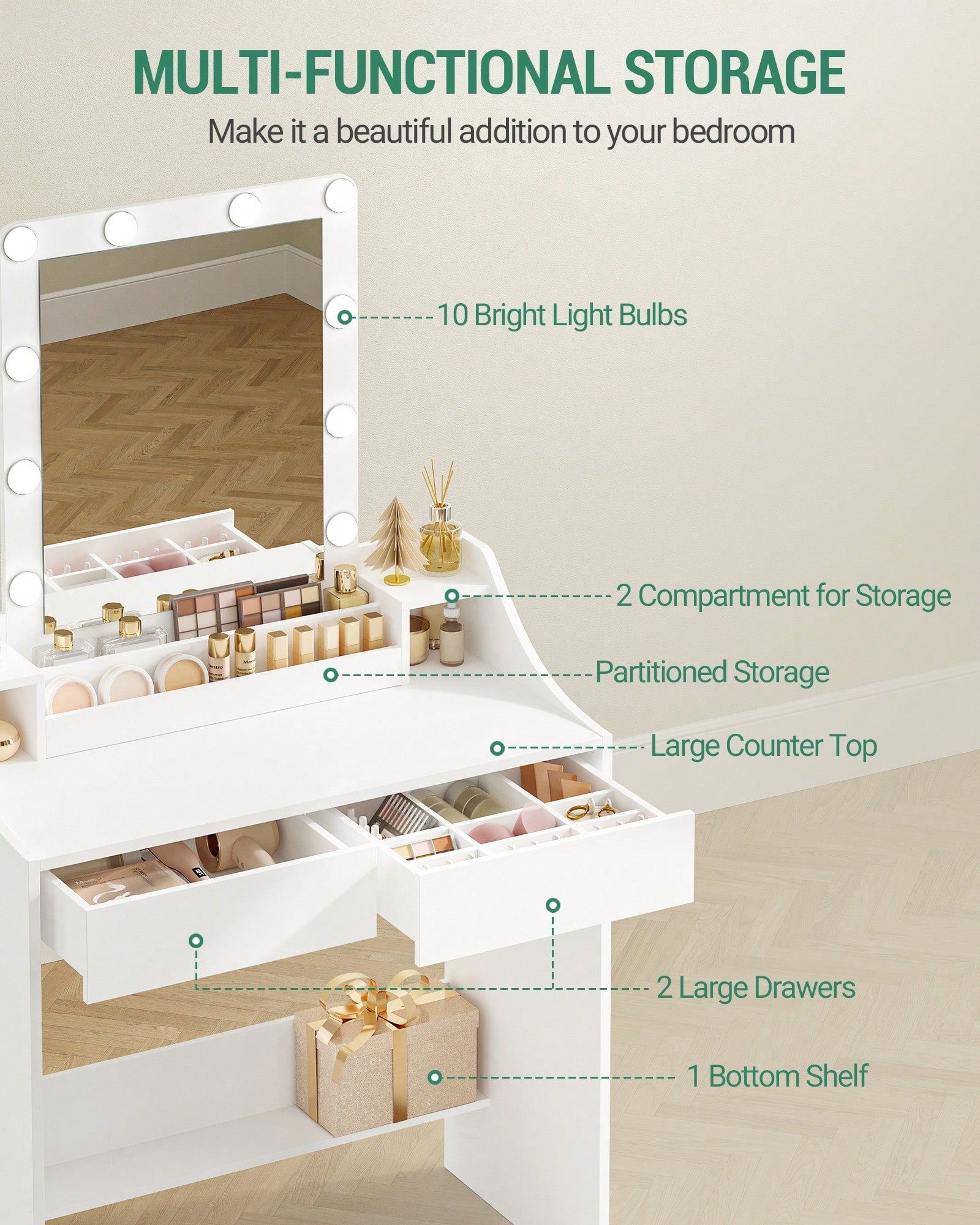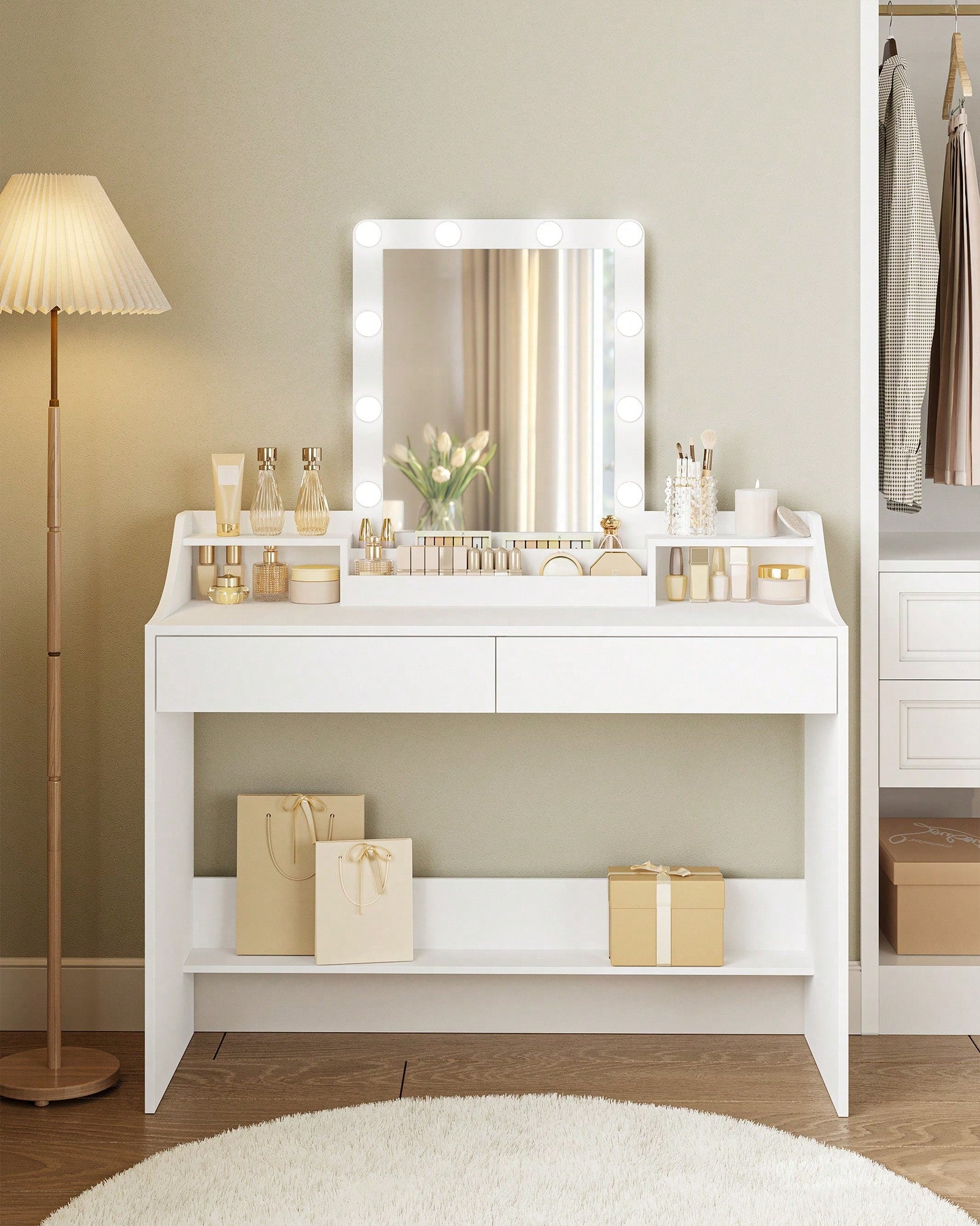 Trasforma la tua routine di bellezza in un'esperienza da star! Questa toeletta con specchio e illuminazione a LED regolabile ti offre la luce perfetta per ogni momento della giornata. Che tu stia preparandoti per una serata speciale o semplicemente ritoccando il trucco, potrai regolare la luminosità secondo le tue preferenze....