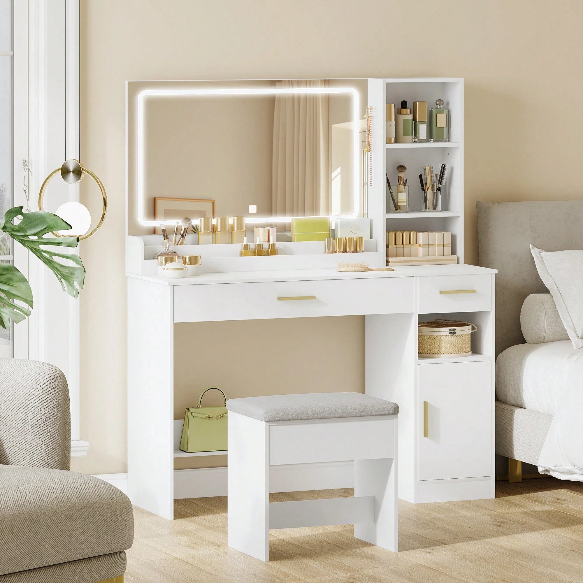 Toeletta con Sgabello Tavolo da Trucco con Specchio Grande e Luce LED Postazione Trucco