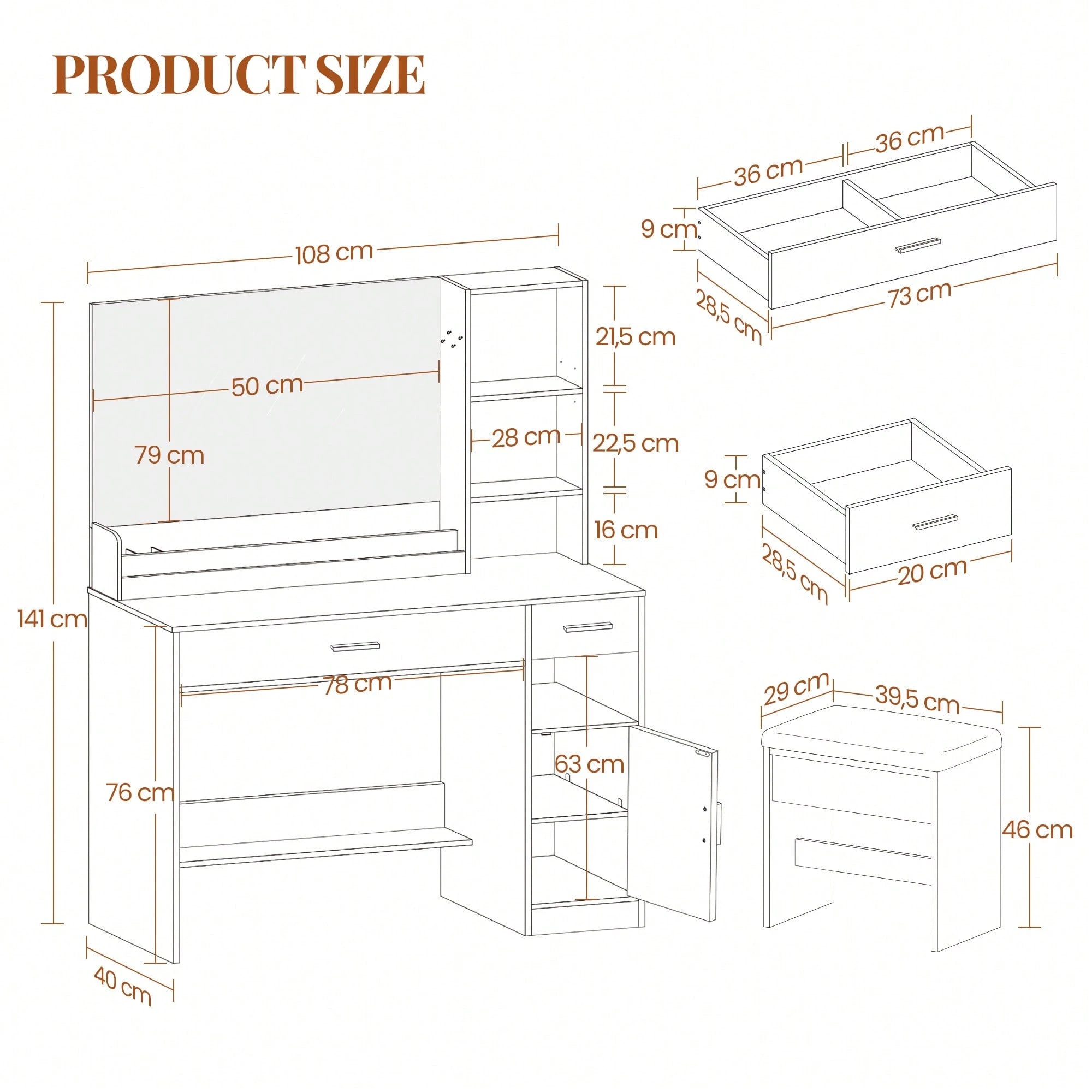 Trasforma la tua routine di bellezza in un'esperienza da star! Questa toeletta elegante in bianco è il tuo nuovo migliore amico per truccarsi con stile.  Lo specchio grande illuminato da luci LED regolabili ti garantisce un'illuminazione perfetta ogni volta, mentre lo sgabello comodo ti permette di stare seduta comodamente.  Con...