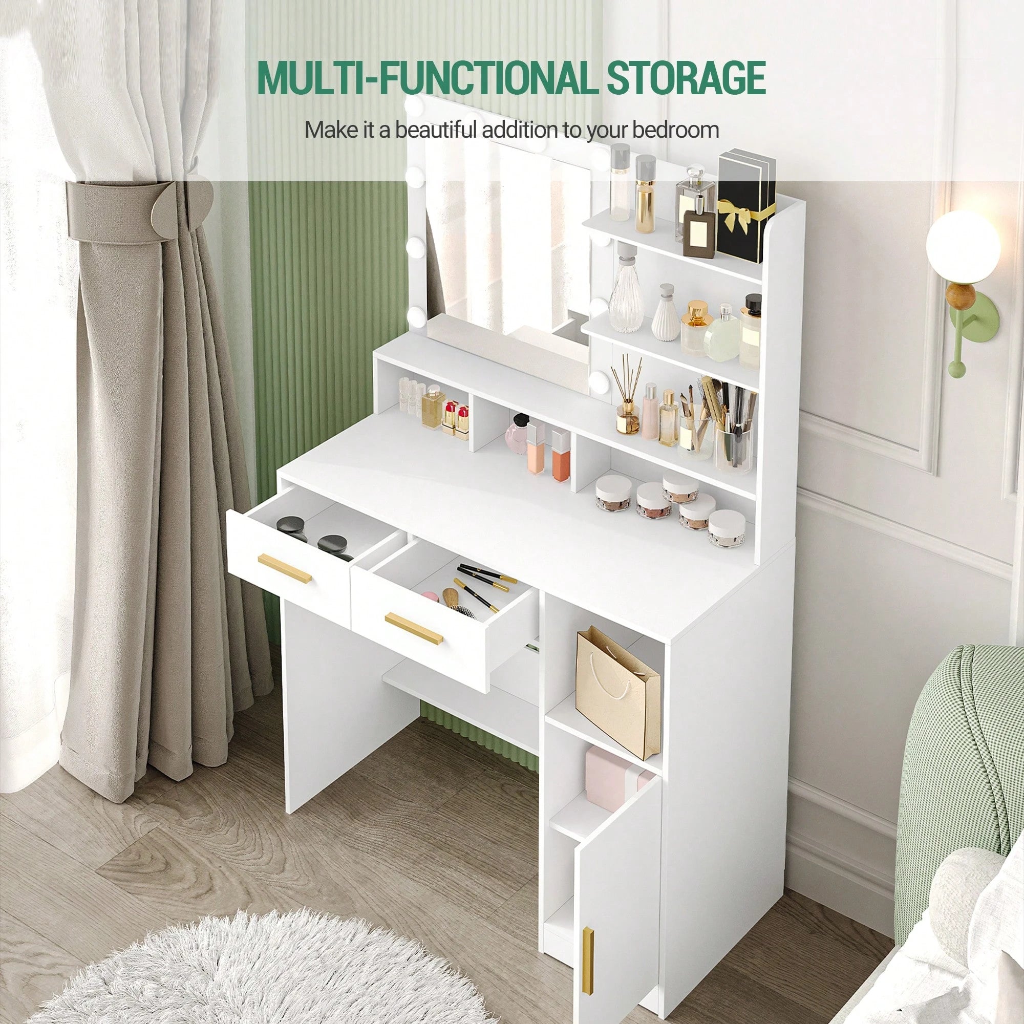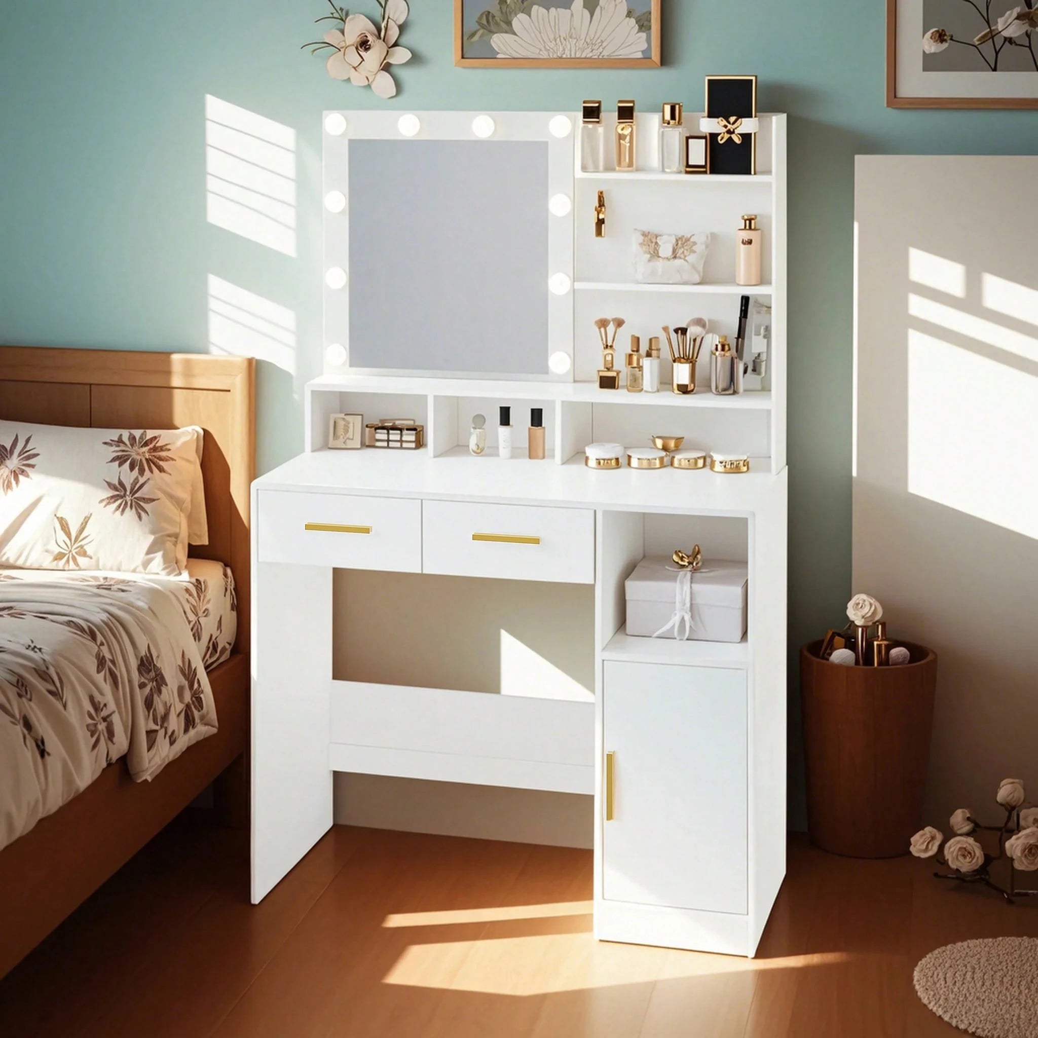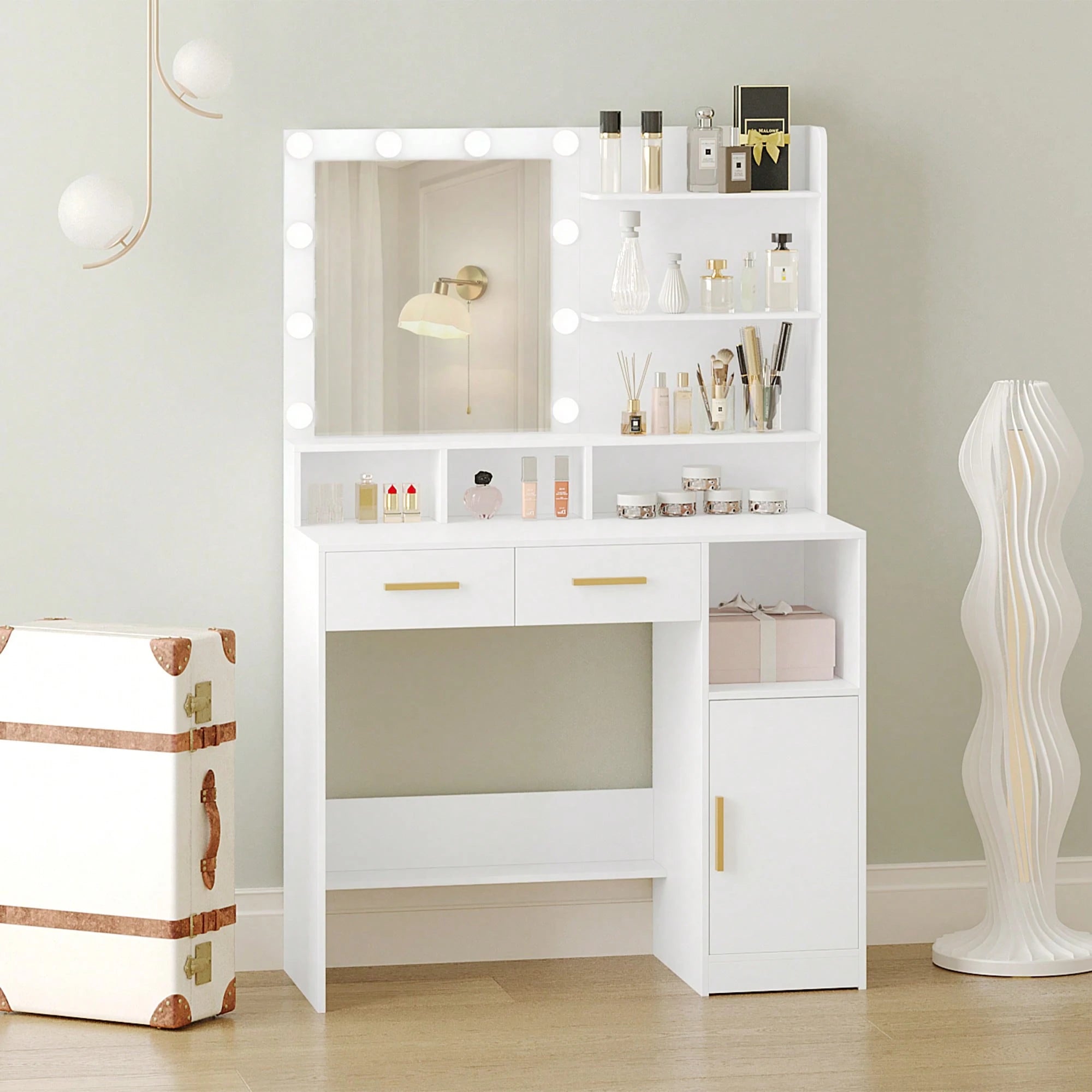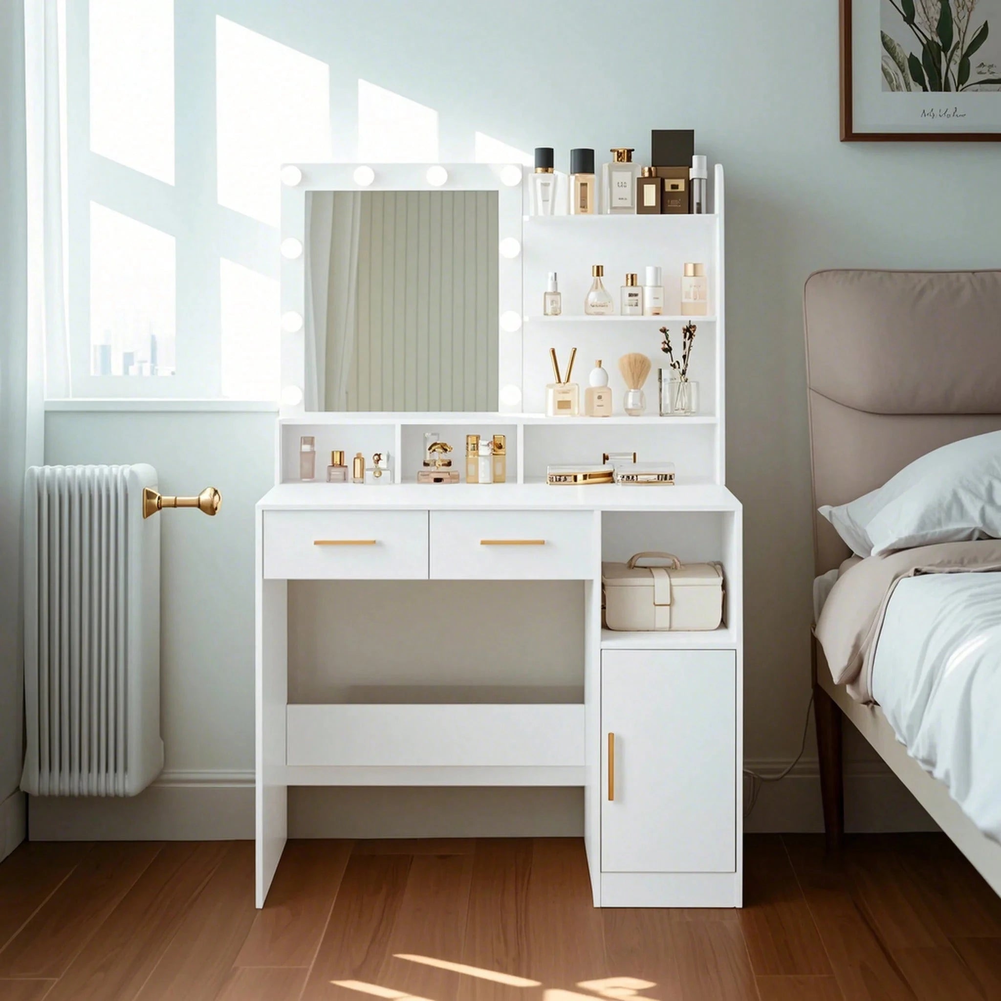 La struttura bianca offre ampio spazio di lavoro con 2 cassetti capienti, 1 armadietto chiuso e 3 ripiani, più 4 scomparti aperti per organizzare cosmetici e accessori.