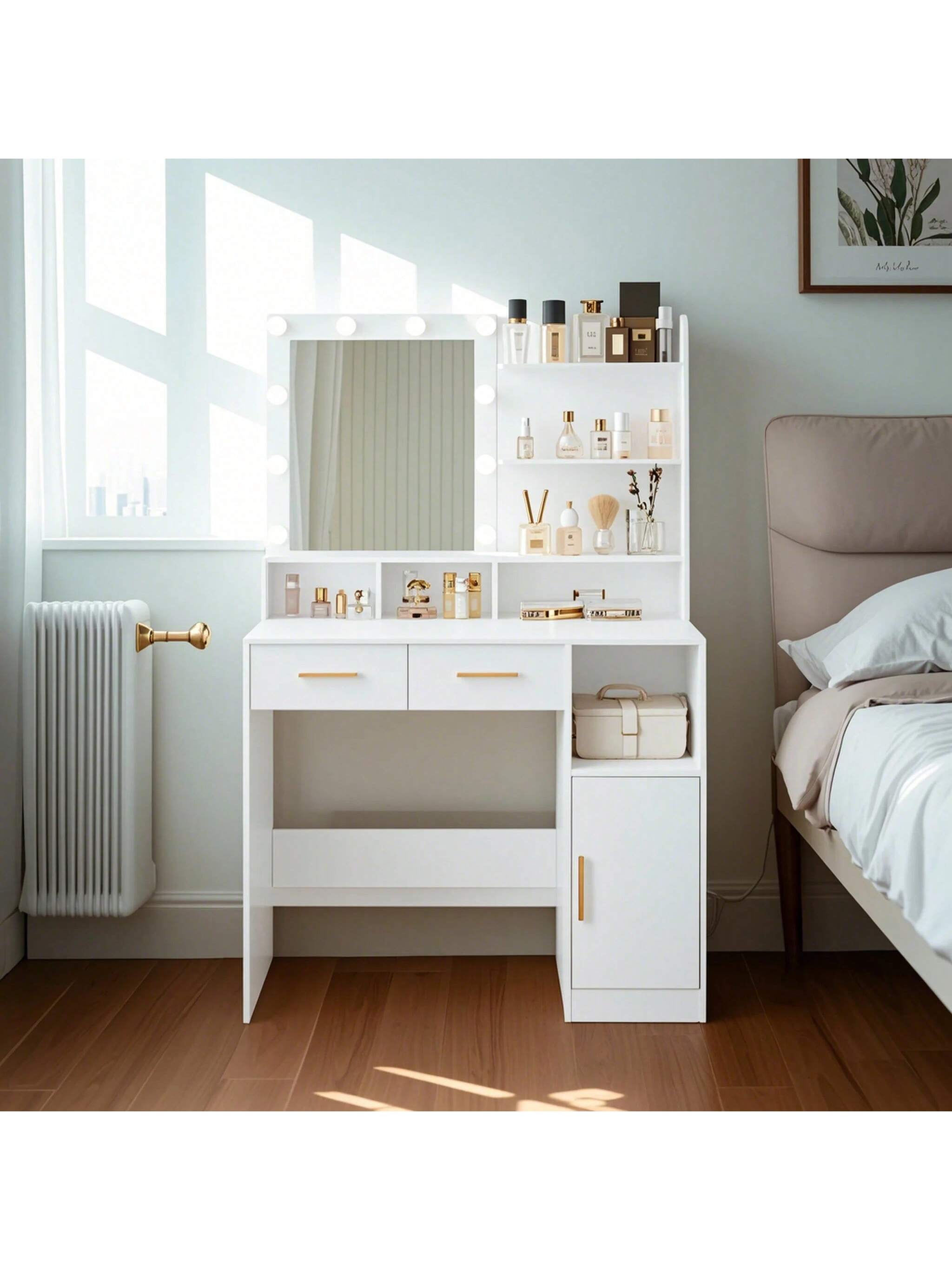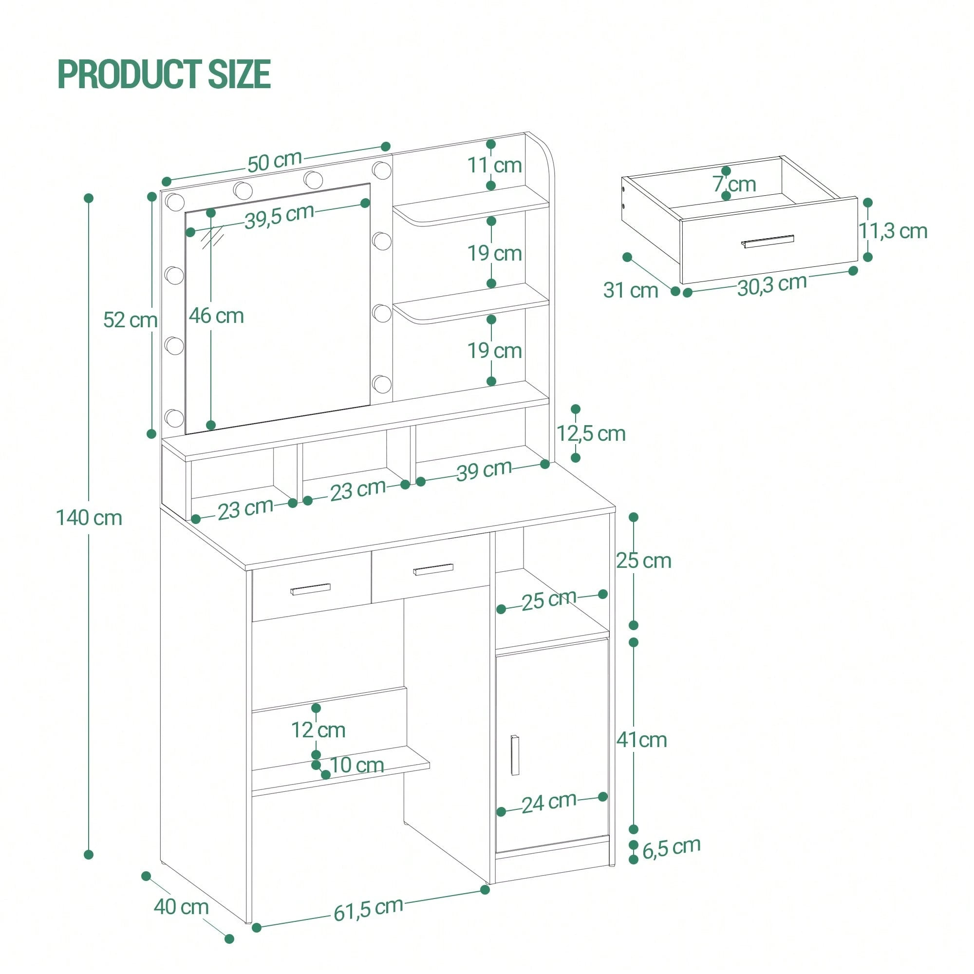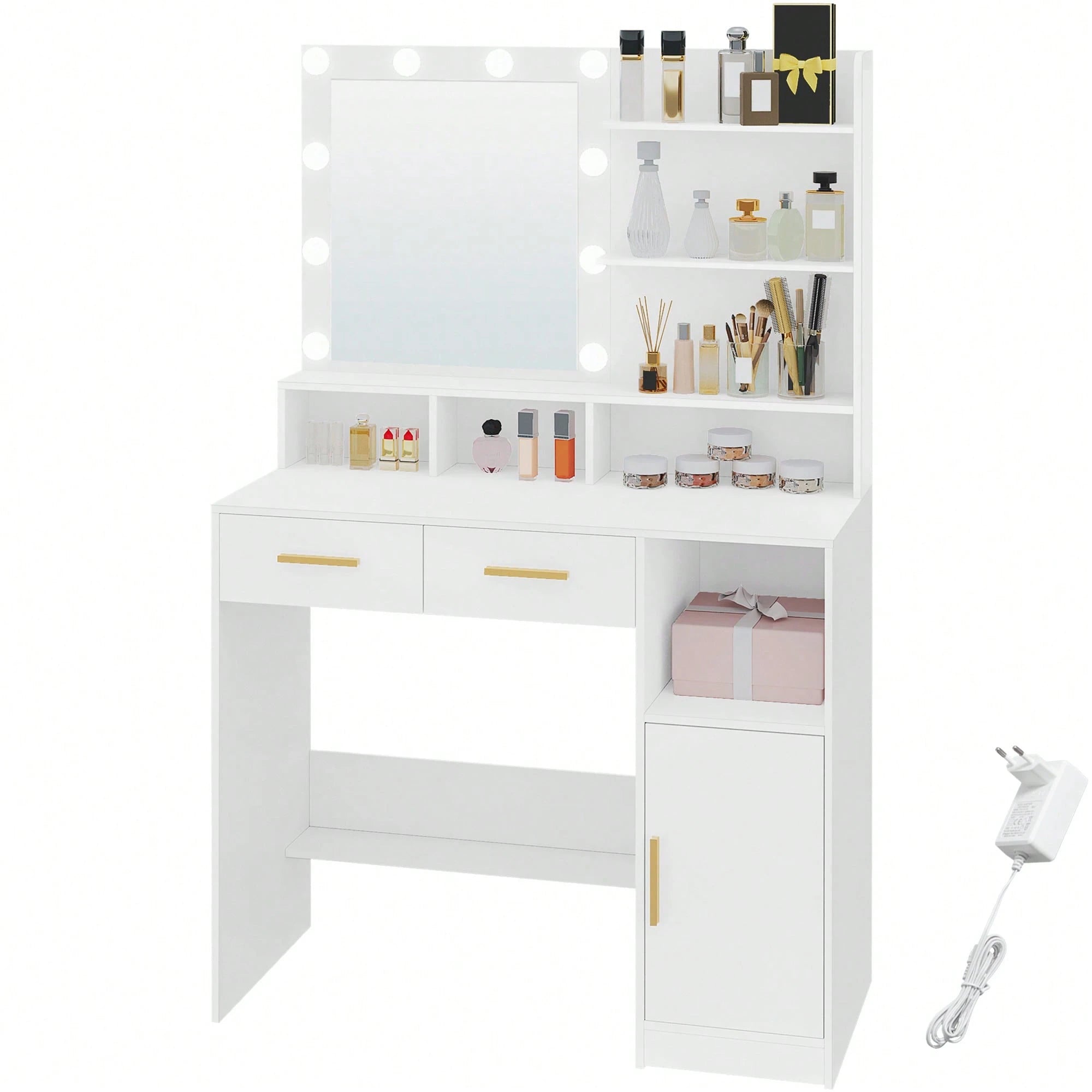 Toeletta da trucco professionale con specchio illuminato da 10 luci LED a luminosità regolabile per un'applicazione del make-up precisa in qualsiasi condizione di luce. La struttura bianca offre ampio spazio di lavoro con 2 cassetti capienti, 1 armadietto chiuso e 3 ripiani, più 4 scomparti aperti per organizzare cosmetici e...