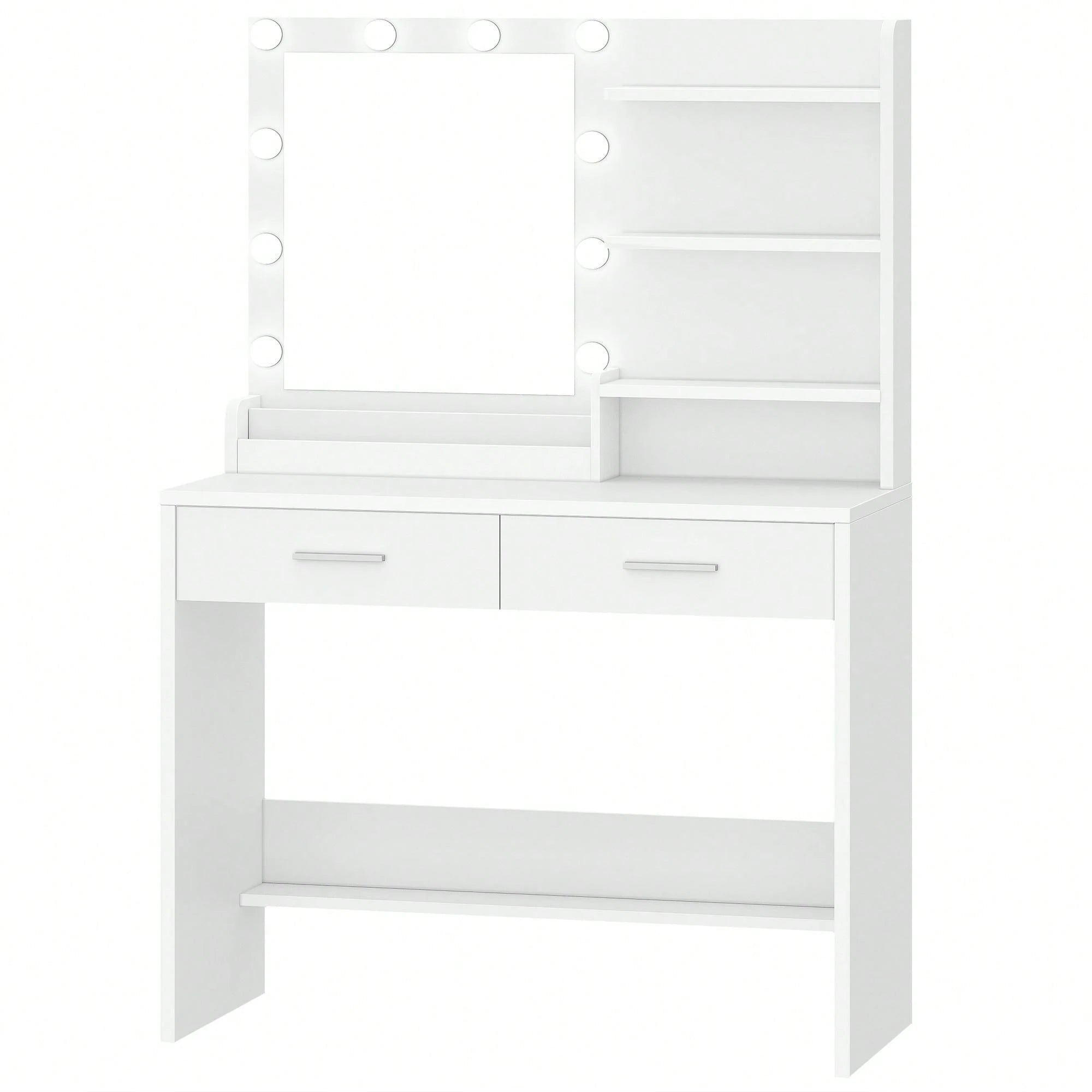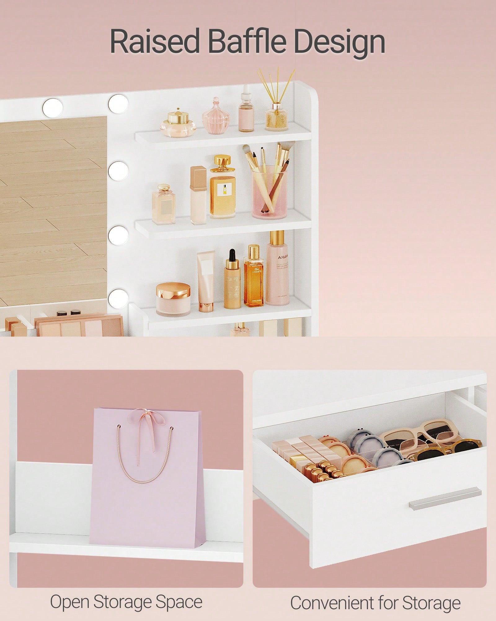 Toeletta da Trucco con Illuminazione a LED, Toeletta da Trucco con specchio, 3 livelli di luminosità, 2 cassetti, 4 ripiani aperti e 2 scomparti, moderna, Bianca