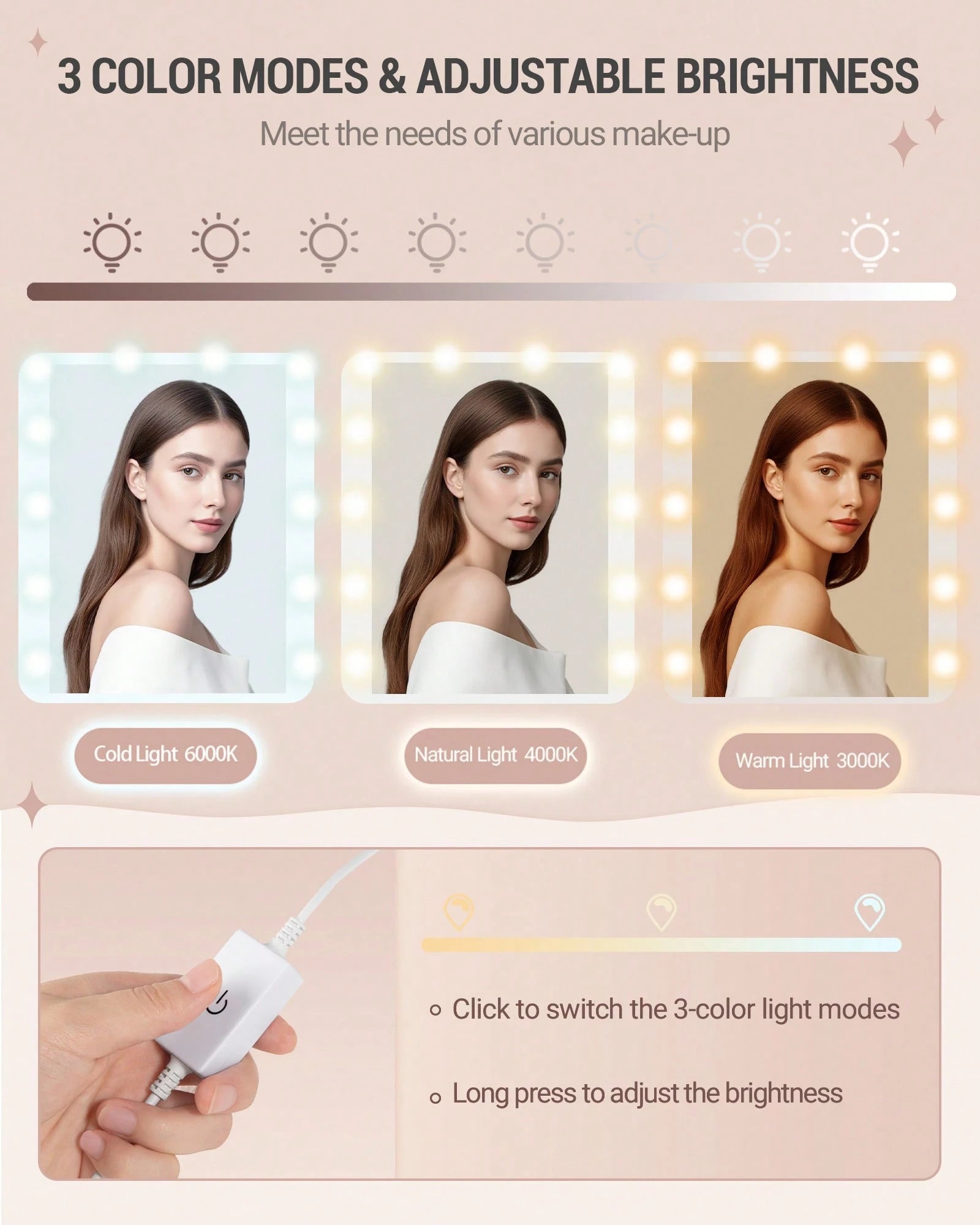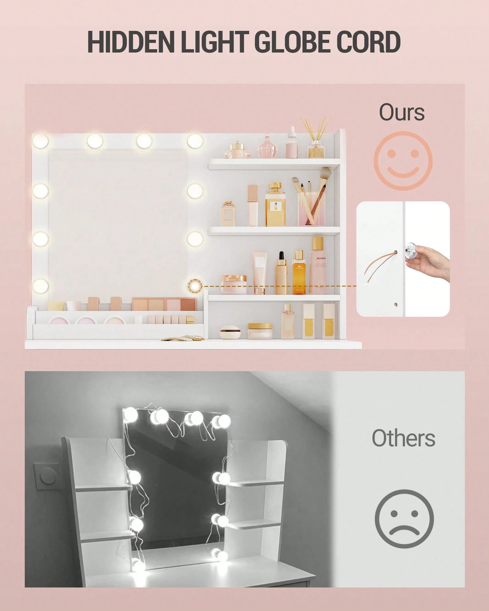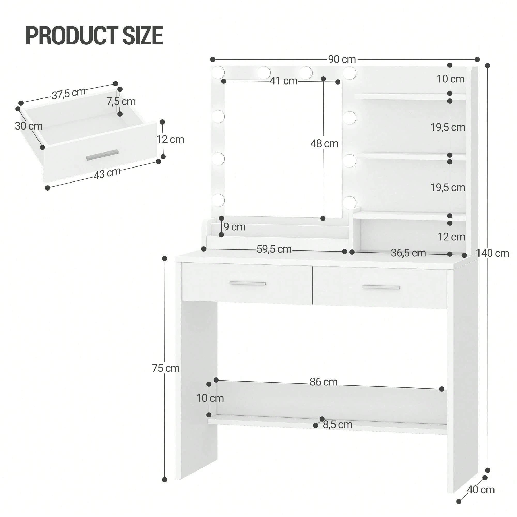 Trasforma il tuo spazio bellezza con questa toeletta moderna dotata di specchio illuminato a LED. Tre livelli di luminosità regolabili garantiscono un'illuminazione perfetta per ogni tipo di trucco e occasione.