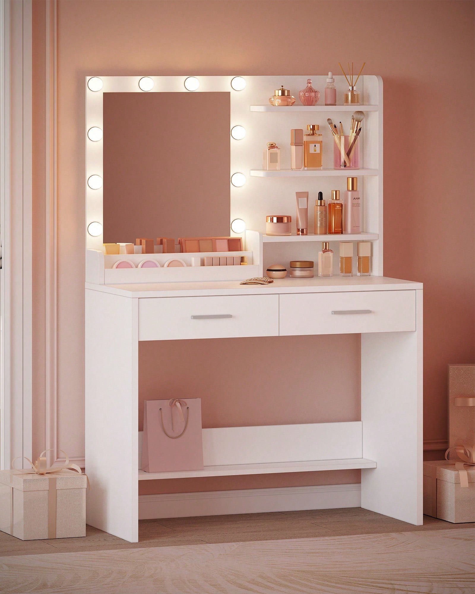 La struttura bianca elegante offre ampio spazio di archiviazione con 2 cassetti capienti, 4 ripiani aperti e 2 scomparti dedicati, ideali per organizzare cosmetici, accessori e prodotti di bellezza.