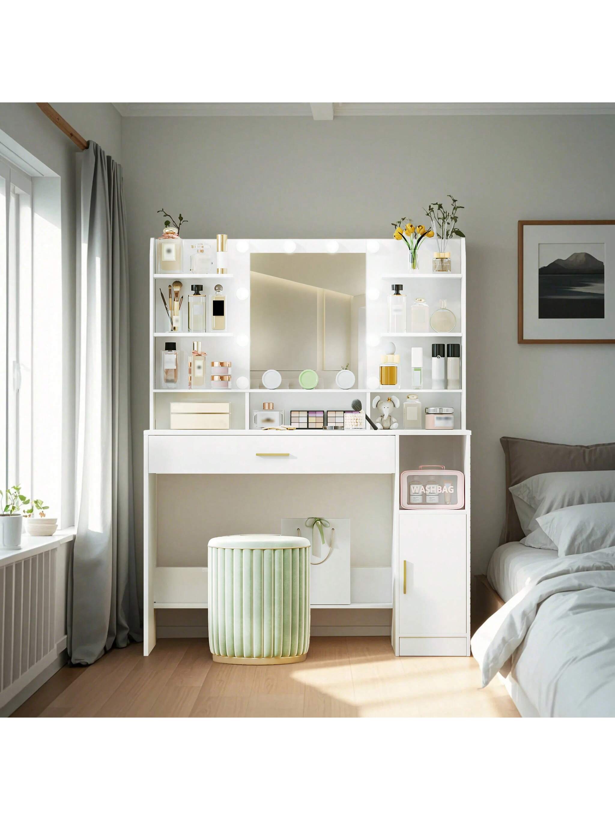 Toeletta da trucco professionale con specchio illuminato a LED e luminosità regolabile per un'applicazione del make-up precisa in qualsiasi condizione di luce. Dotata di ampi cassetti organizzati e ripiani aperti, offre spazio generoso per cosmetici accessori e prodotti di bellezza. La struttura elegante in bianco si integra perfettamente in camere...
