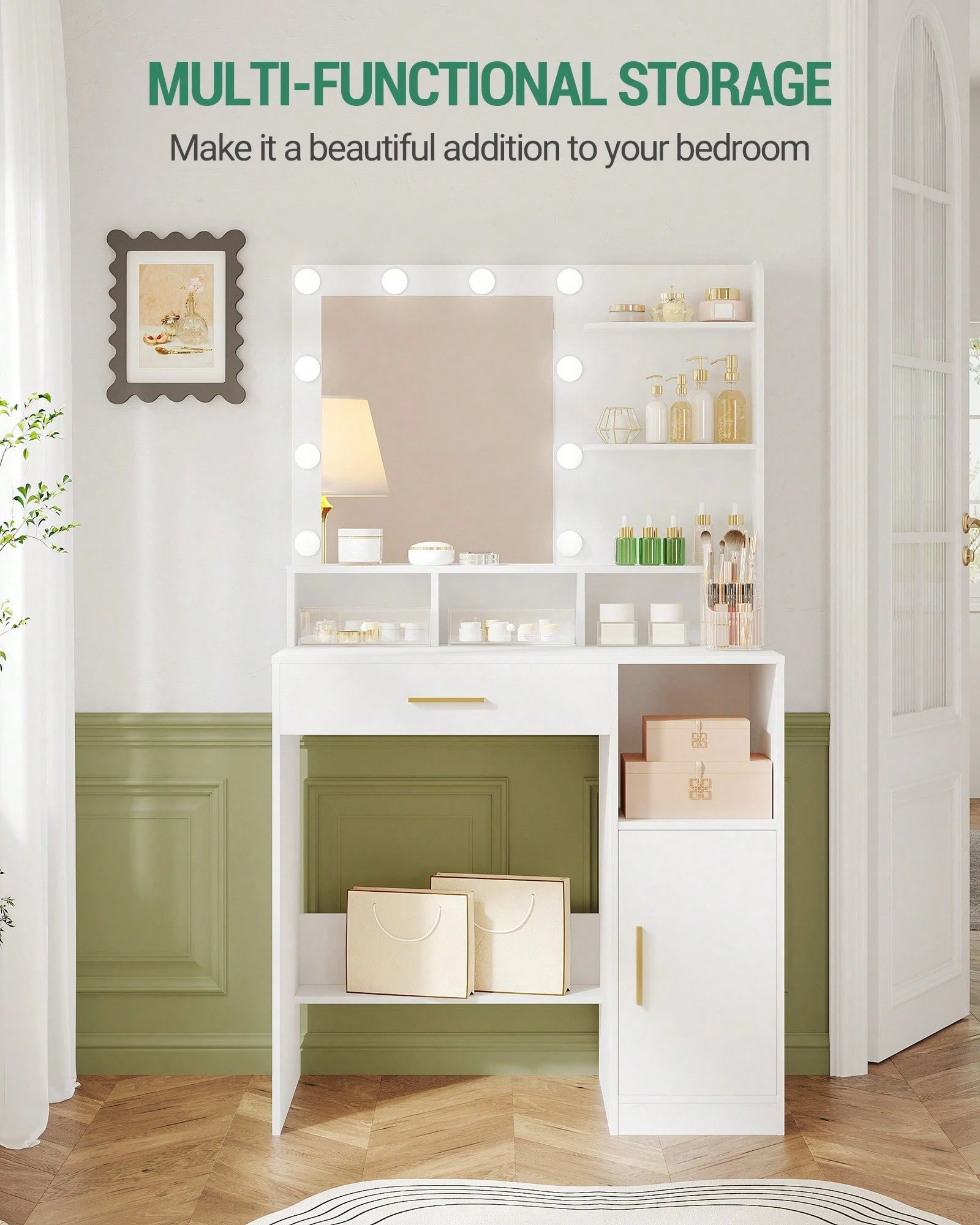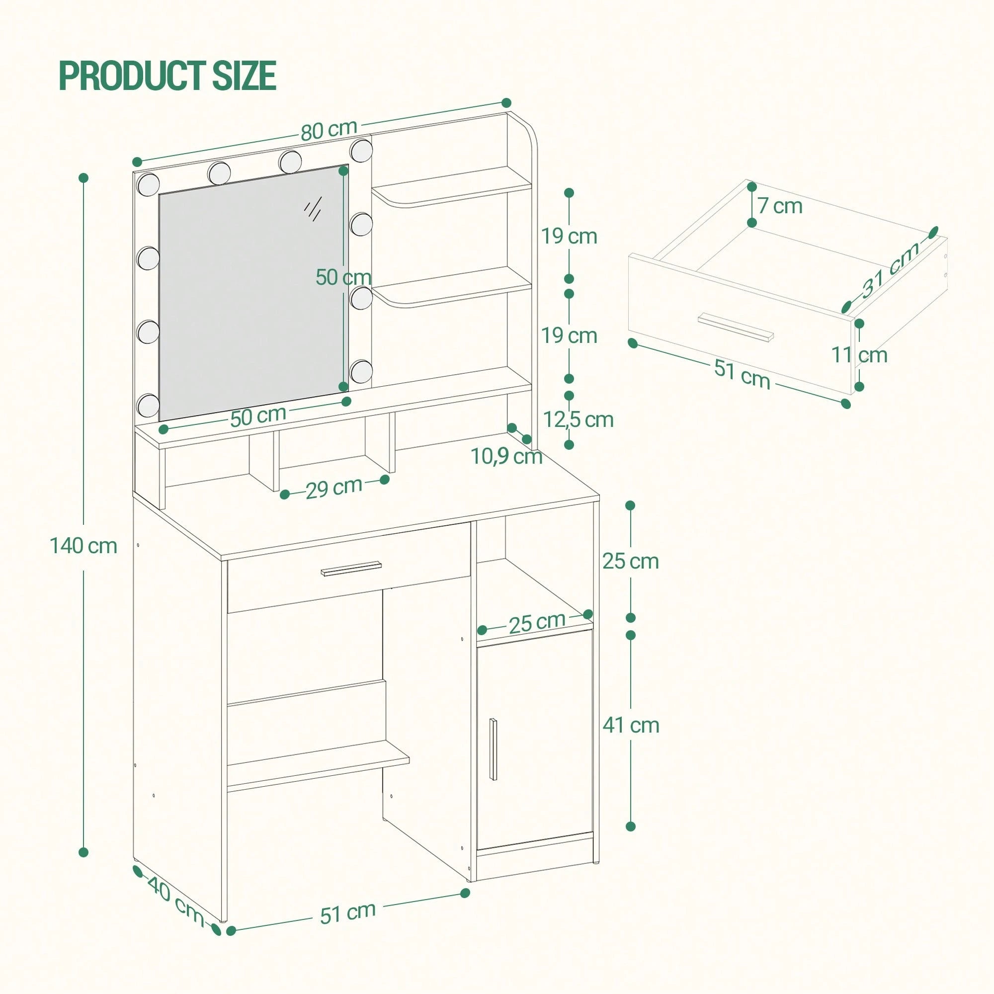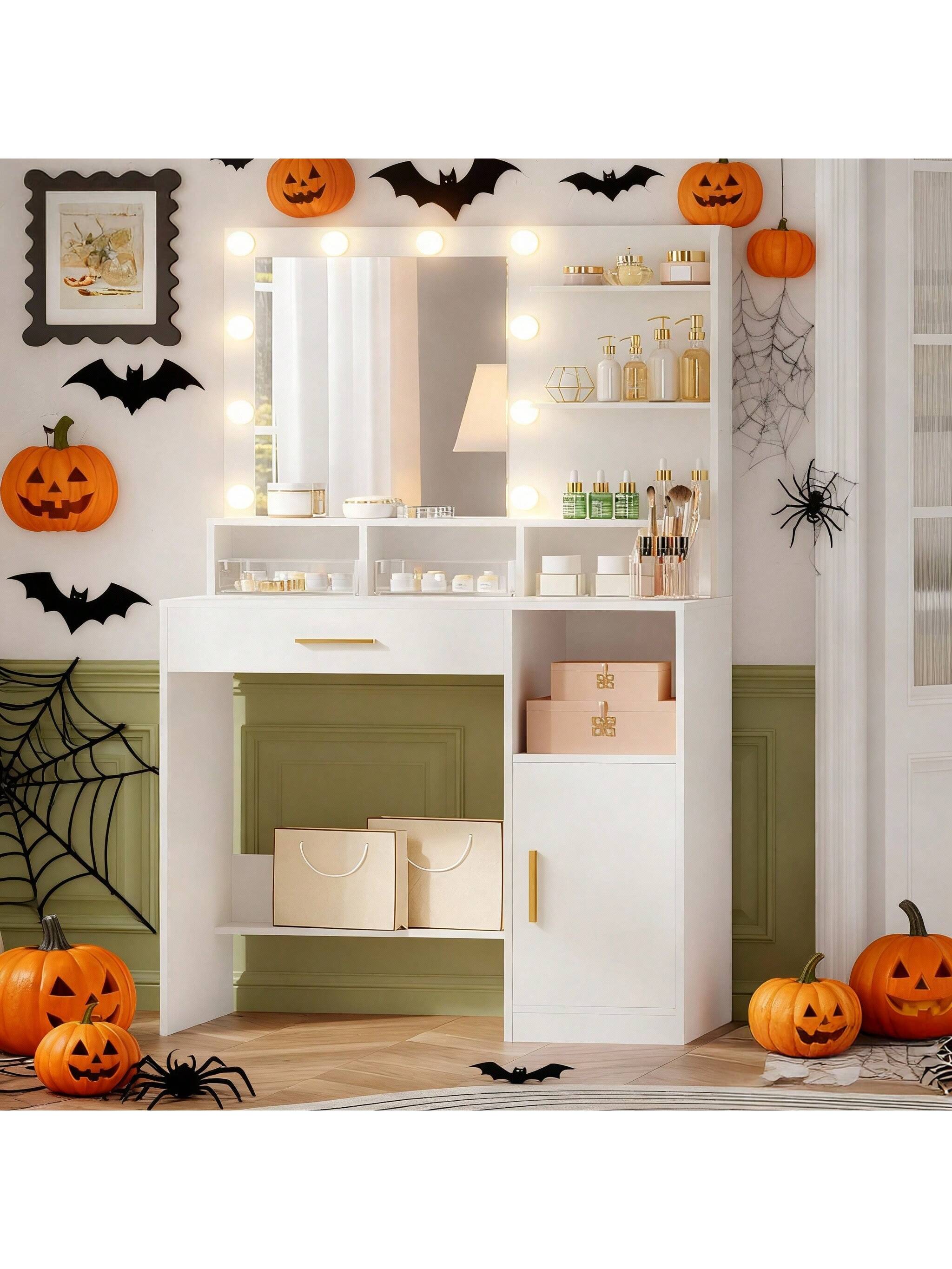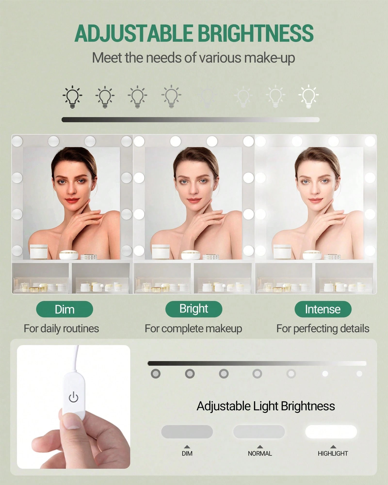 Toeletta da trucco professionale con specchio grande illuminato a LED regolabile, ideale per un'applicazione precisa del make-up in qualsiasi condizione di luce. La struttura robusta e stabile garantisce durabilità nel tempo, mentre il design moderno si adatta a qualsiasi ambiente. Dotata di ampio cassetto e armadietto per organizzare cosmetici e...