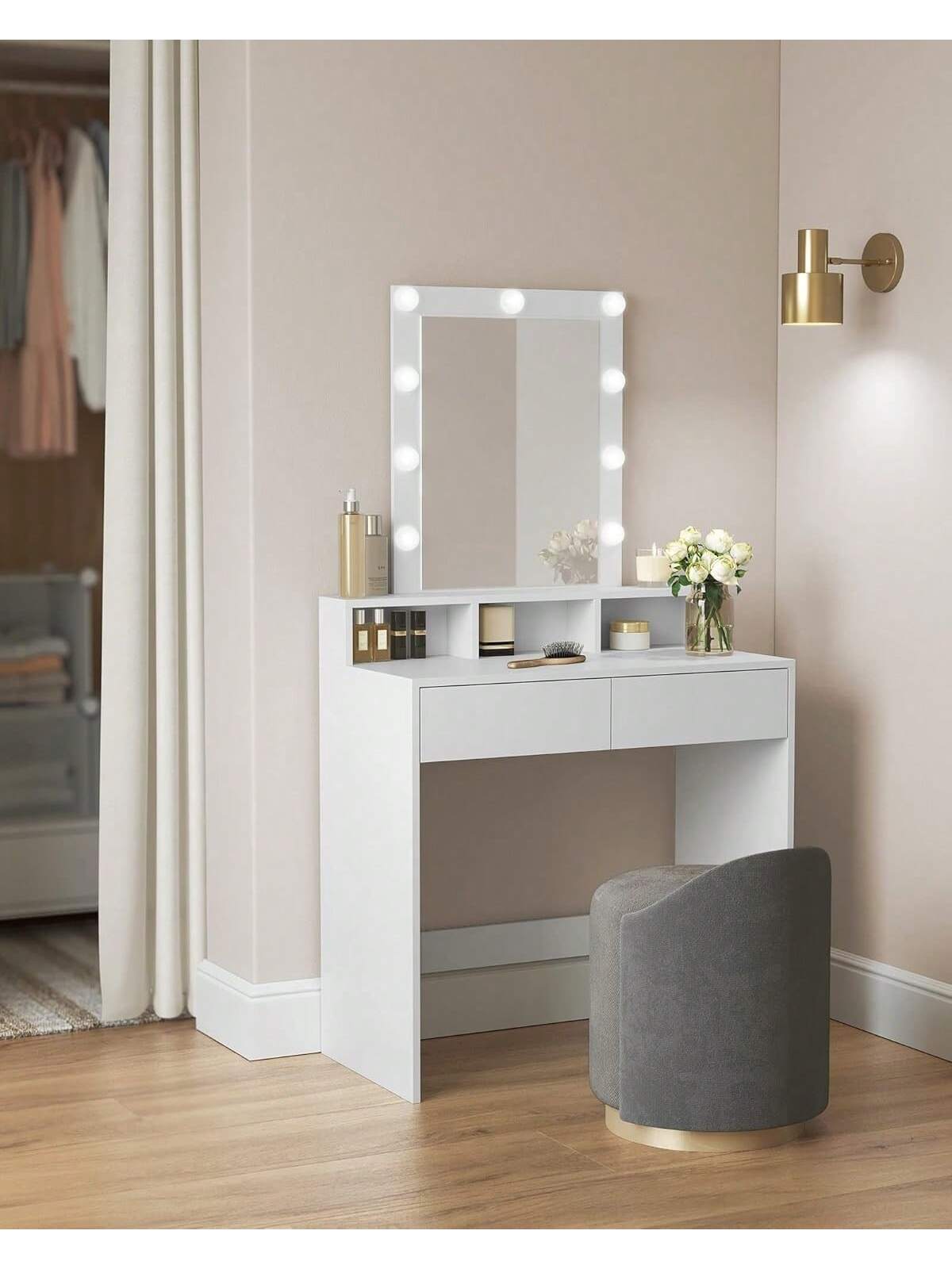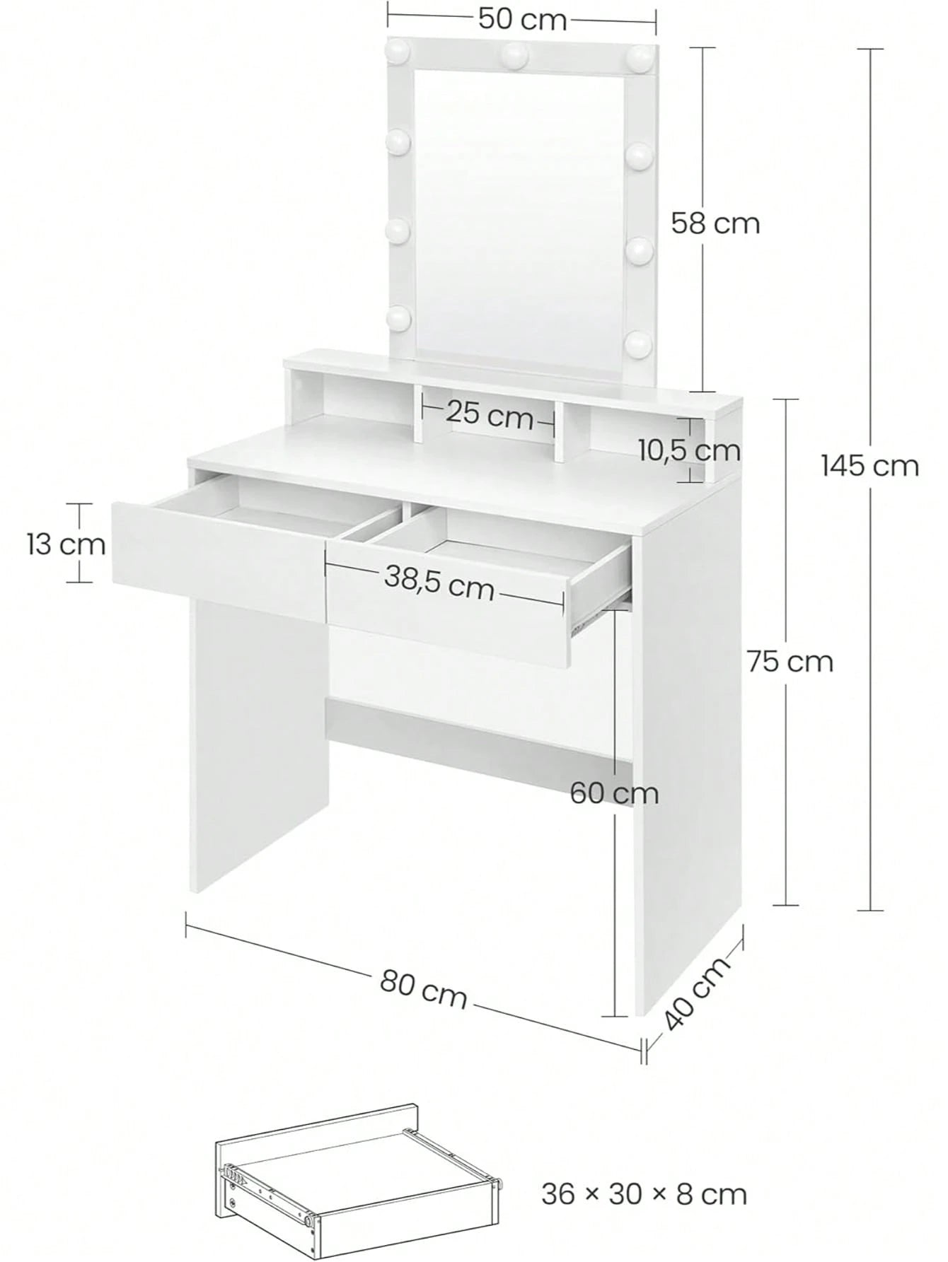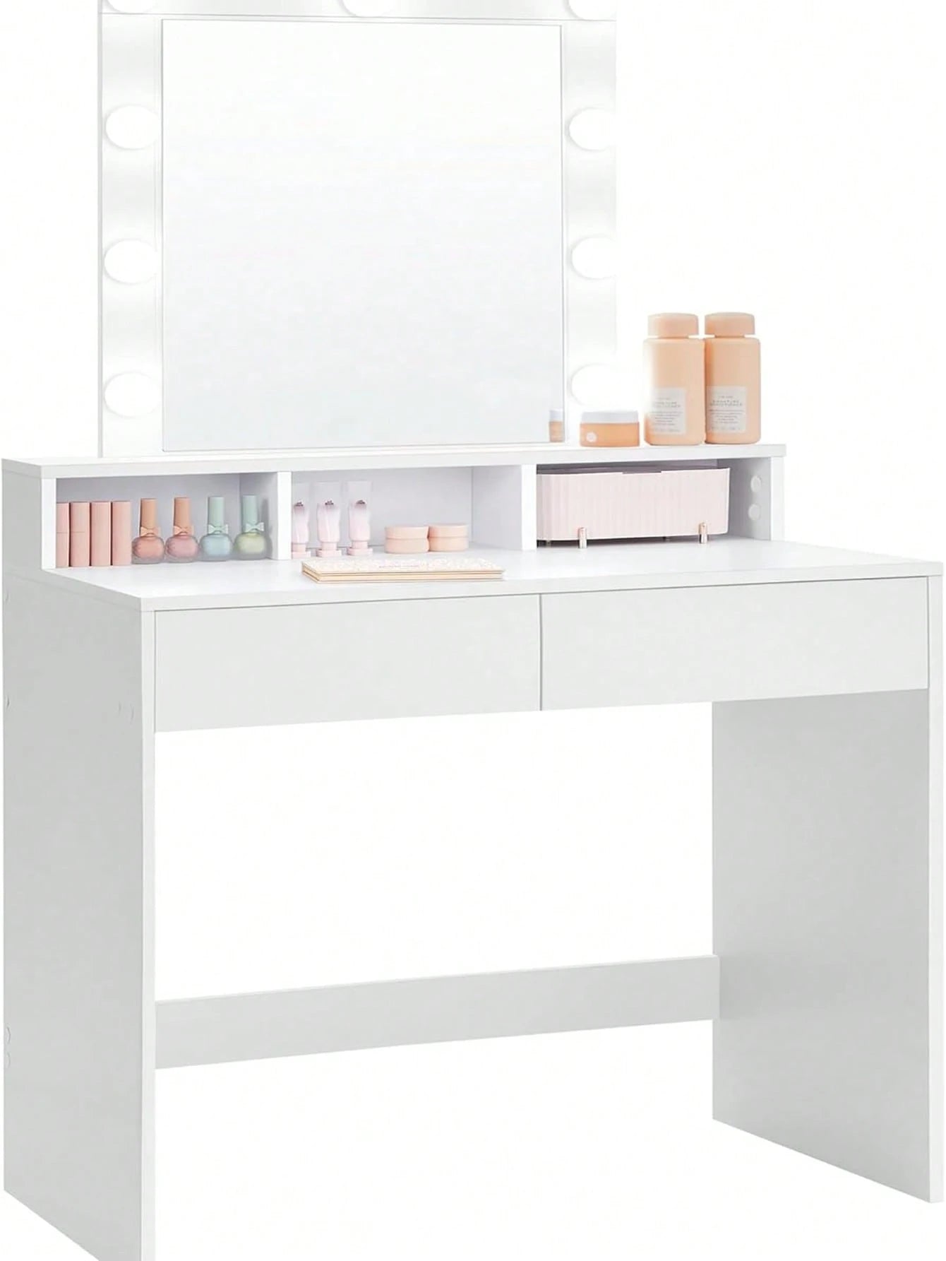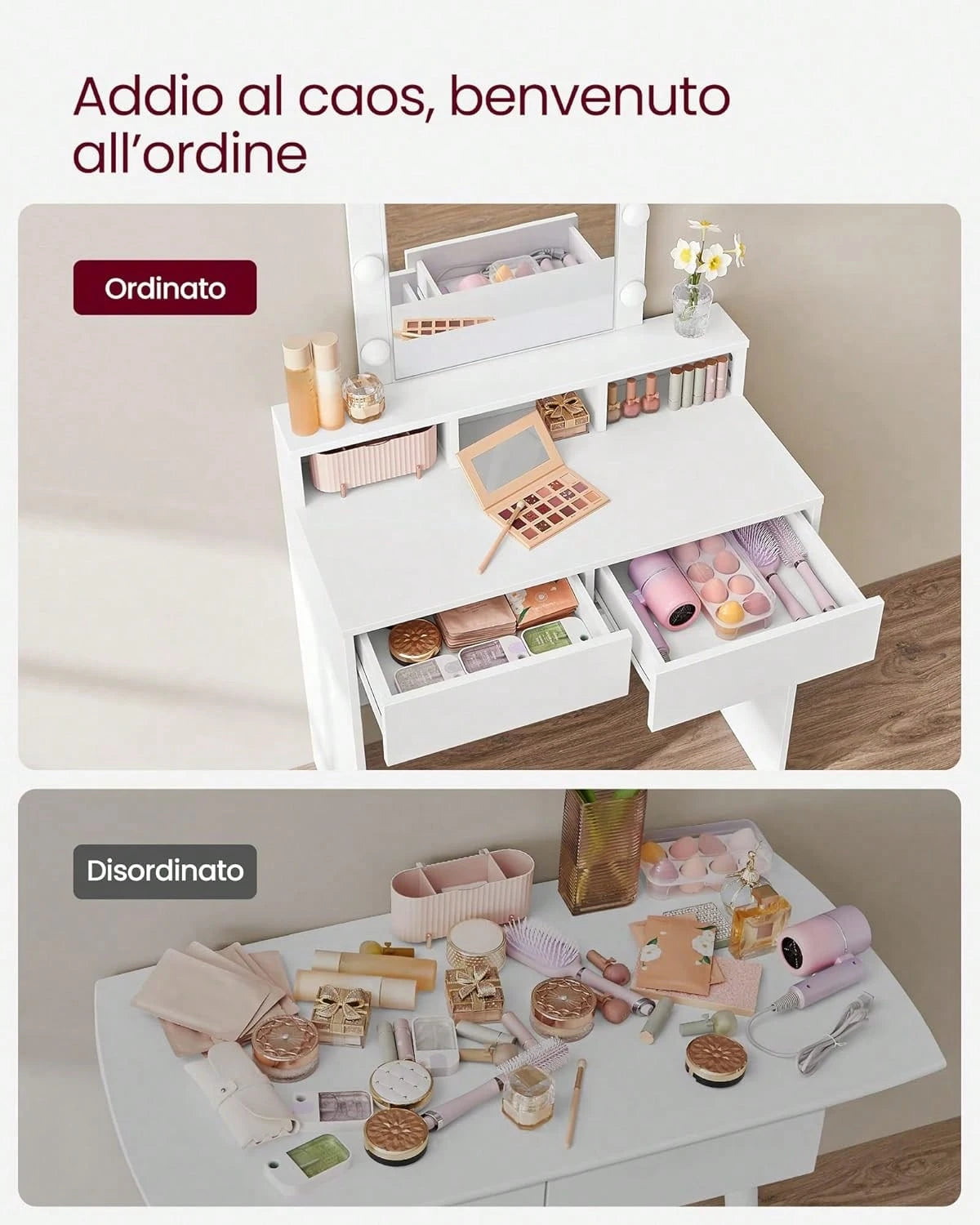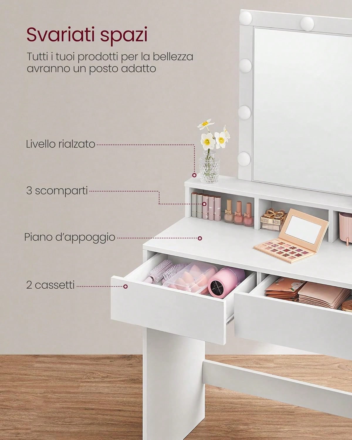 La struttura in bianco elegante offre ampio spazio di lavoro con 2 cassetti capienti e 3 scomparti organizzativi, ideali per riporre cosmetici, accessori e prodotti di bellezza.