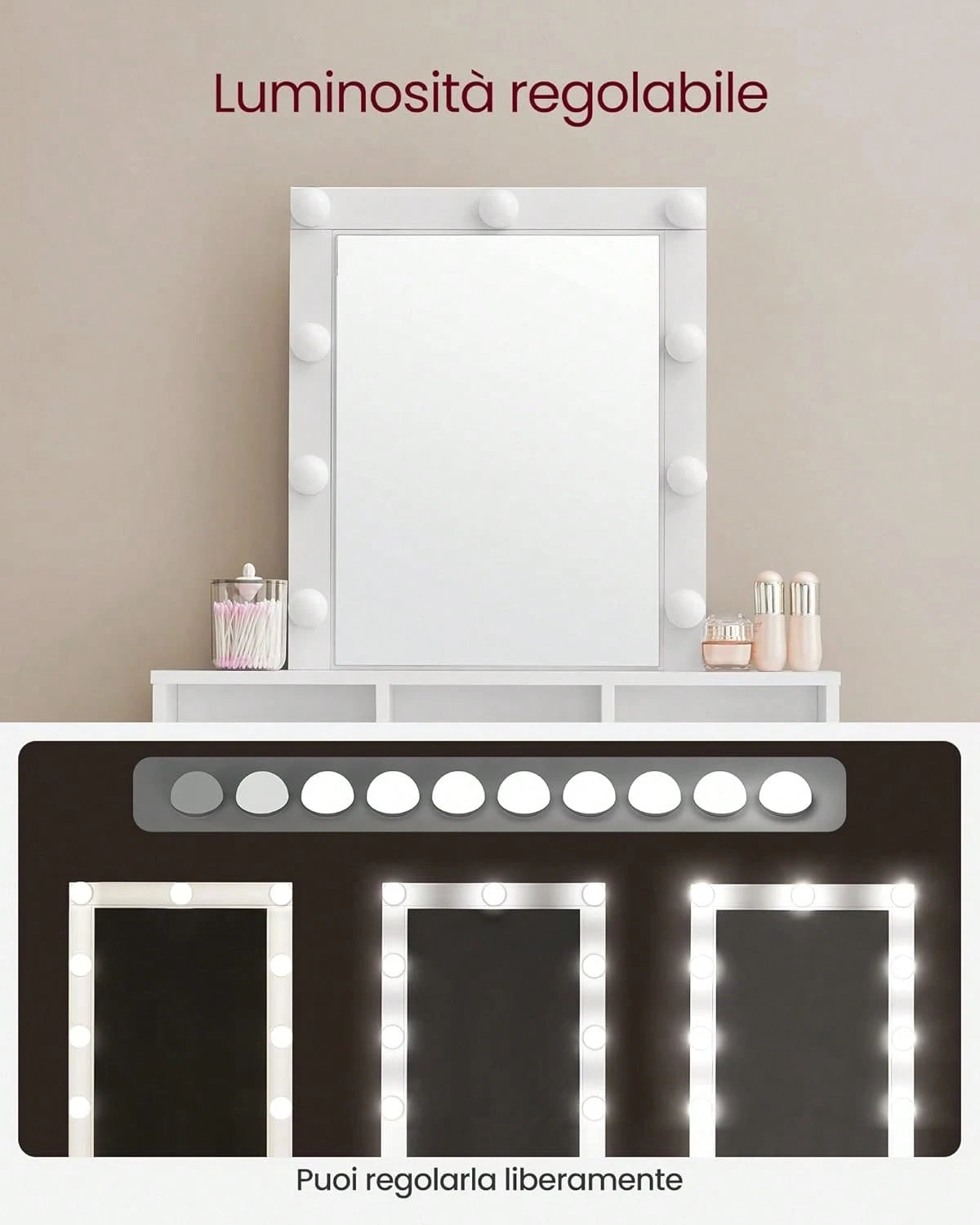 Toeletta moderna con specchio illuminato a LED e luminosità regolabile per un'applicazione del trucco precisa in qualsiasi condizione di luce.