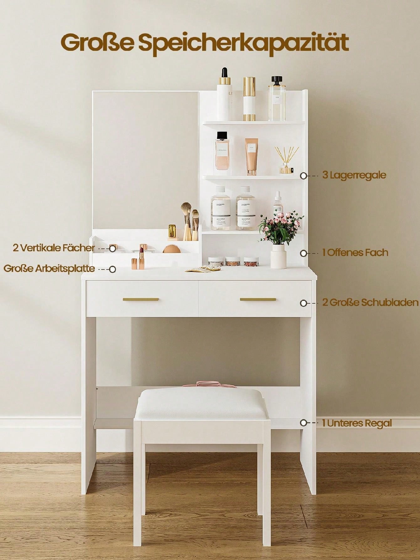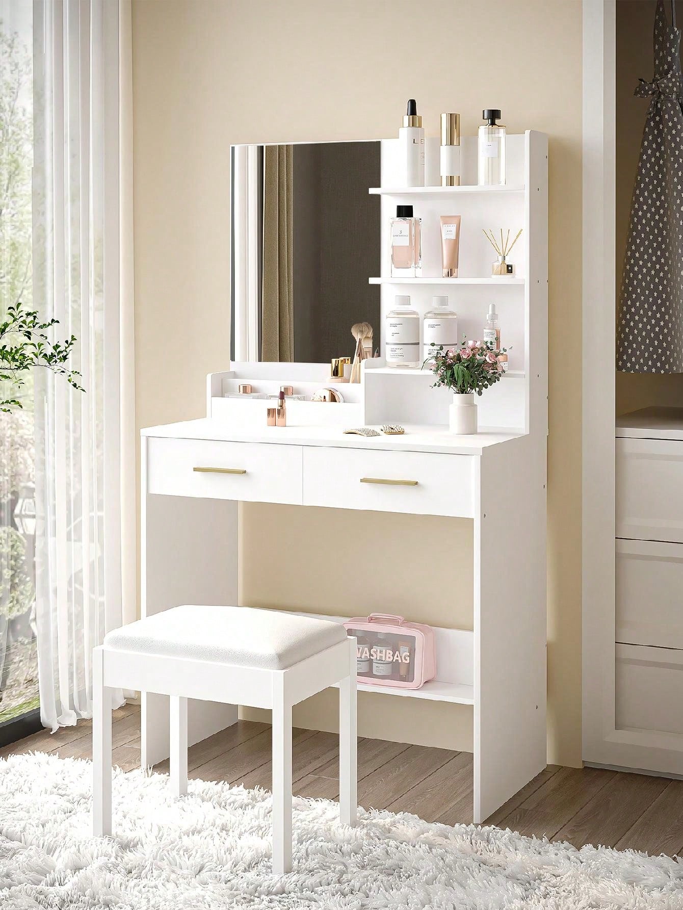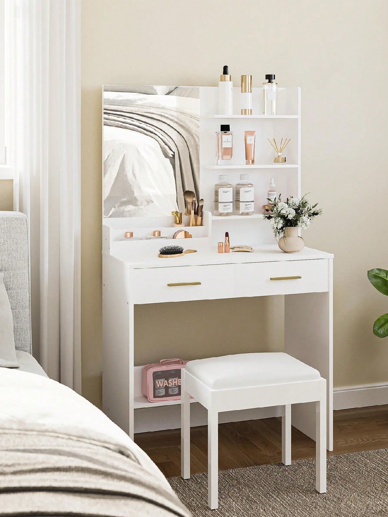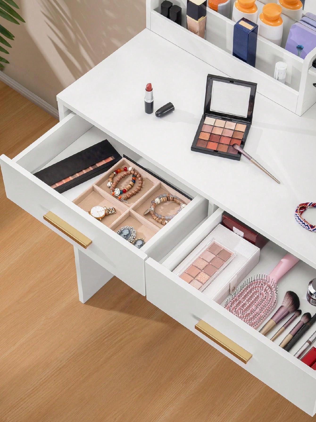 - I 2 cassetti e i 4 ripiani aperti della scrivania vanity offrono spazio sufficiente per