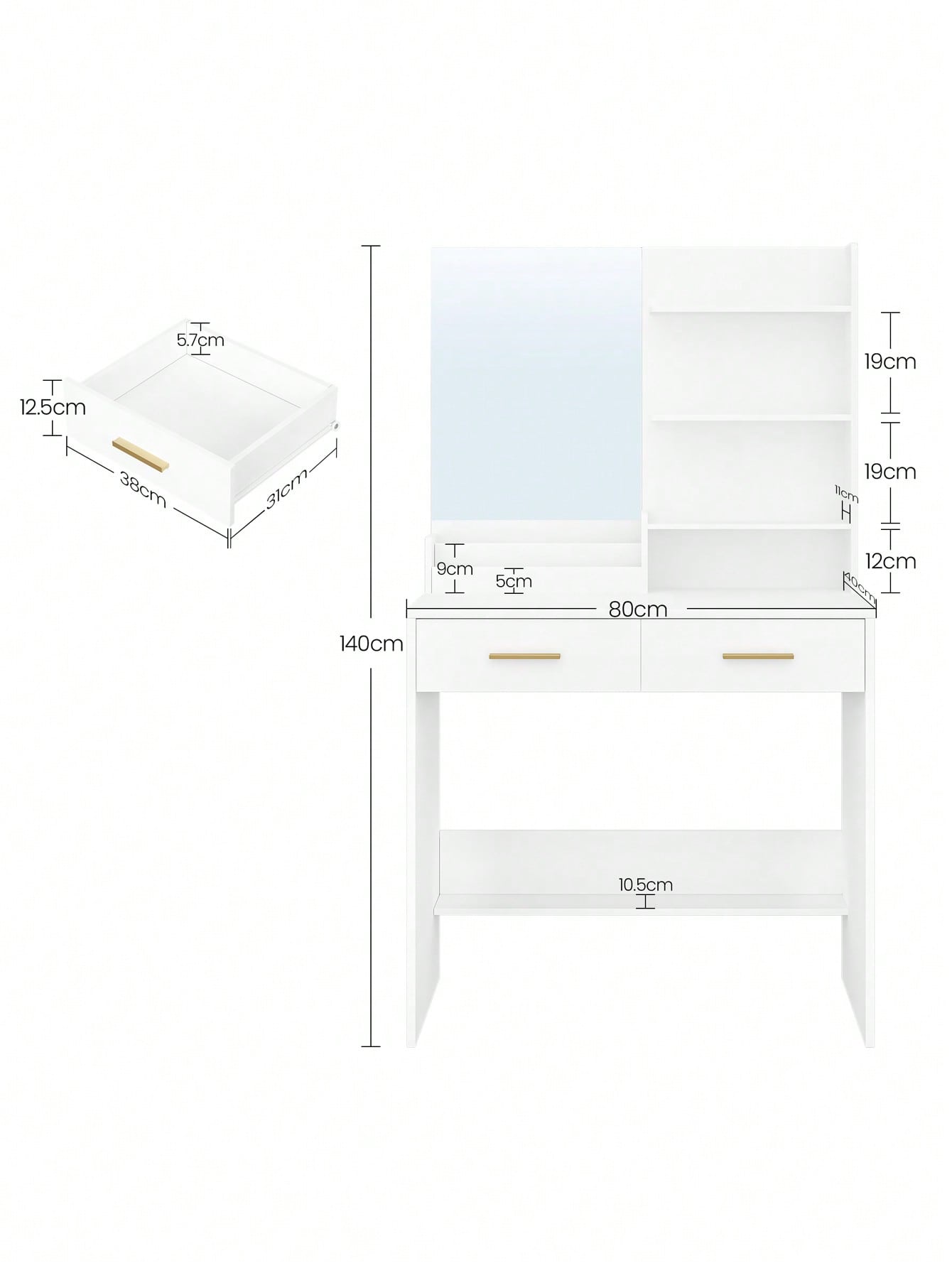 2. Grande specchio per le vostre esigenze: La dimensione dello specchio dellacassettiera è di 53 * 39,6 cm. Metterà in mostra tutta la vostra bellezza in tutte le direzioni.3. Design moderno e unico: Piatto bianco semplice e suggestivo con manigliedorate di alta qualità per soddisfare le esigenze di alta qualità dei consumatori e aggiungere fascino magico e alla moda alla vostra stanza.