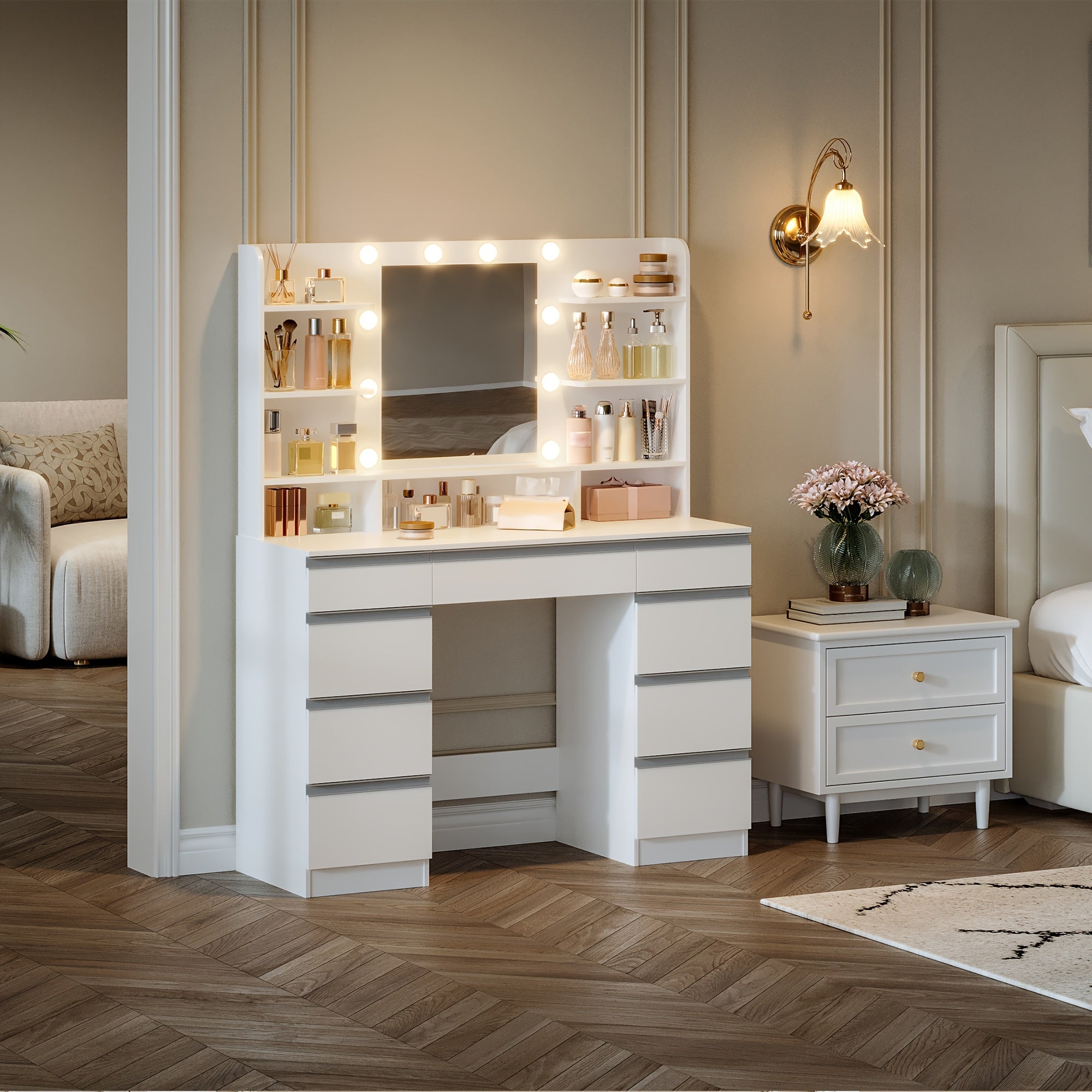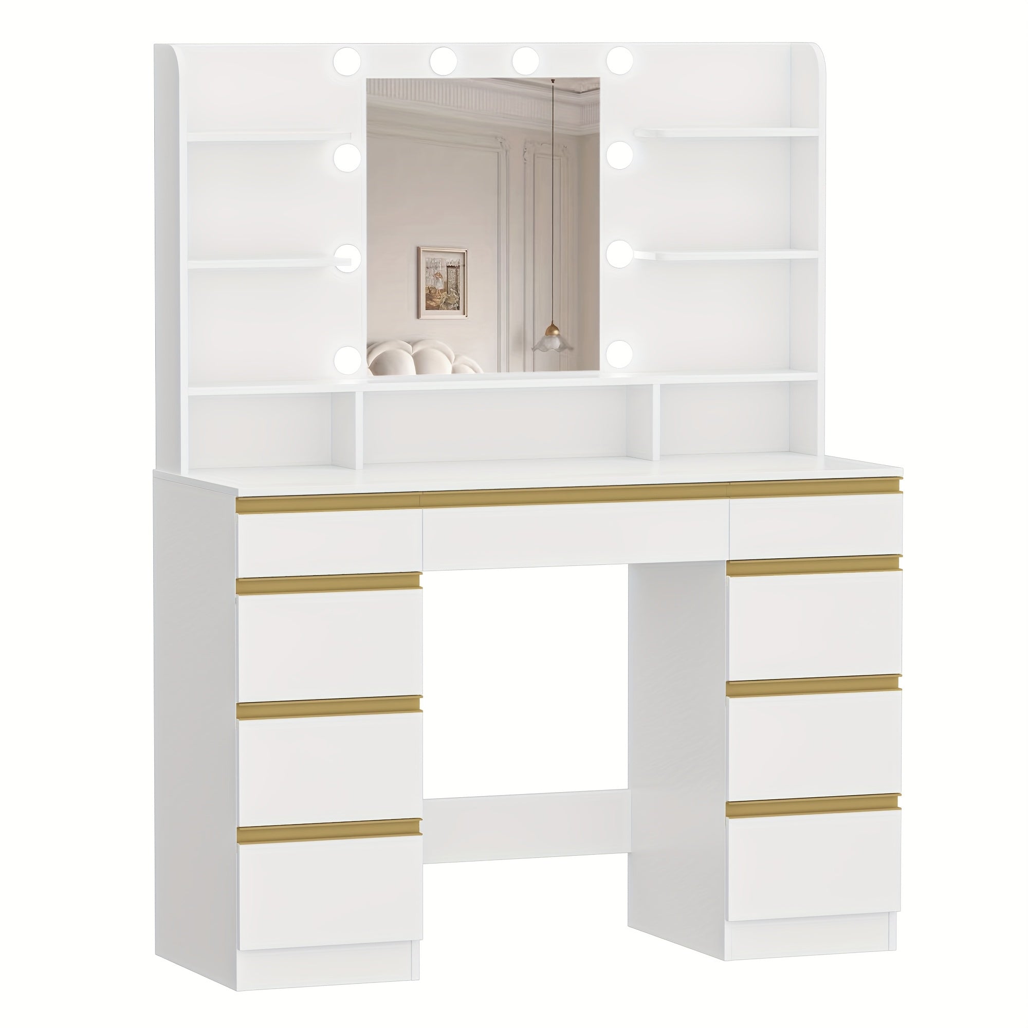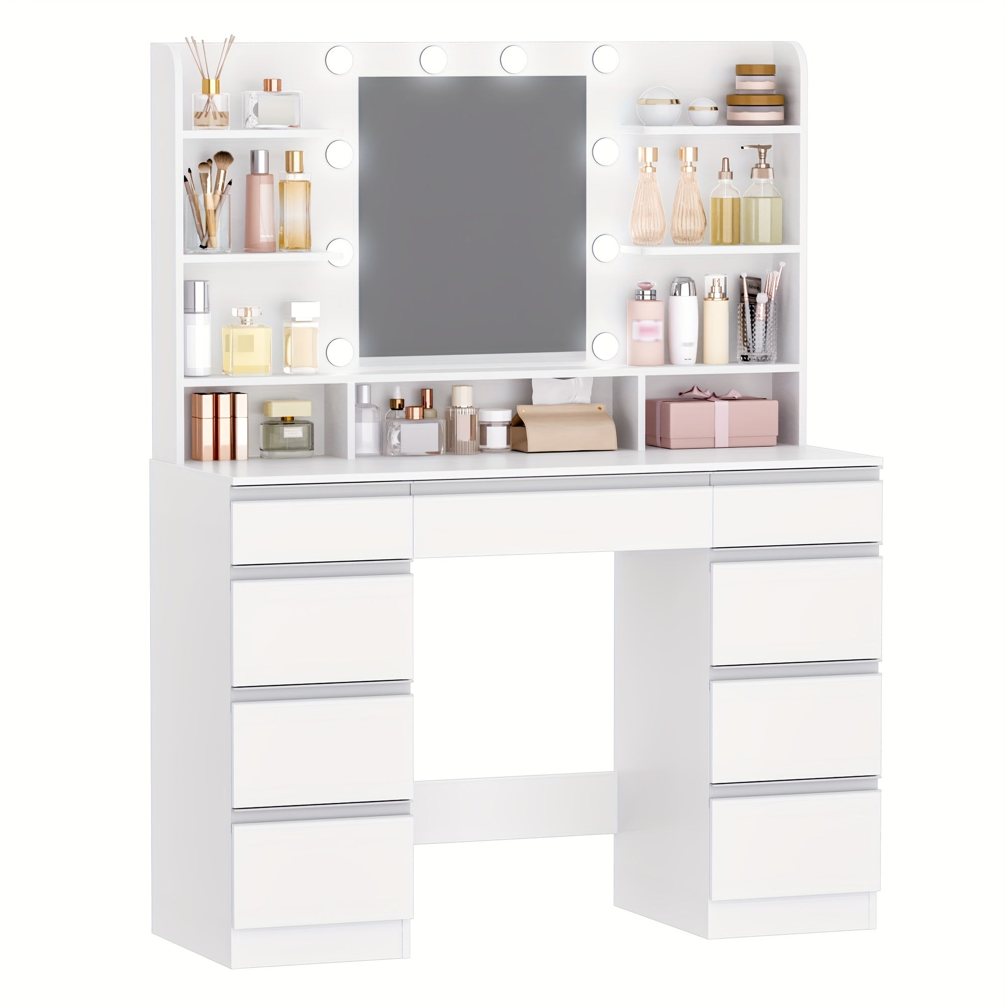Toilette Luminosità Regolabile, Grande Specchio HD, 1 Cassetto Grande e 8 Cassetti Piccoli, 9 Ripiani Aperti, Bianco