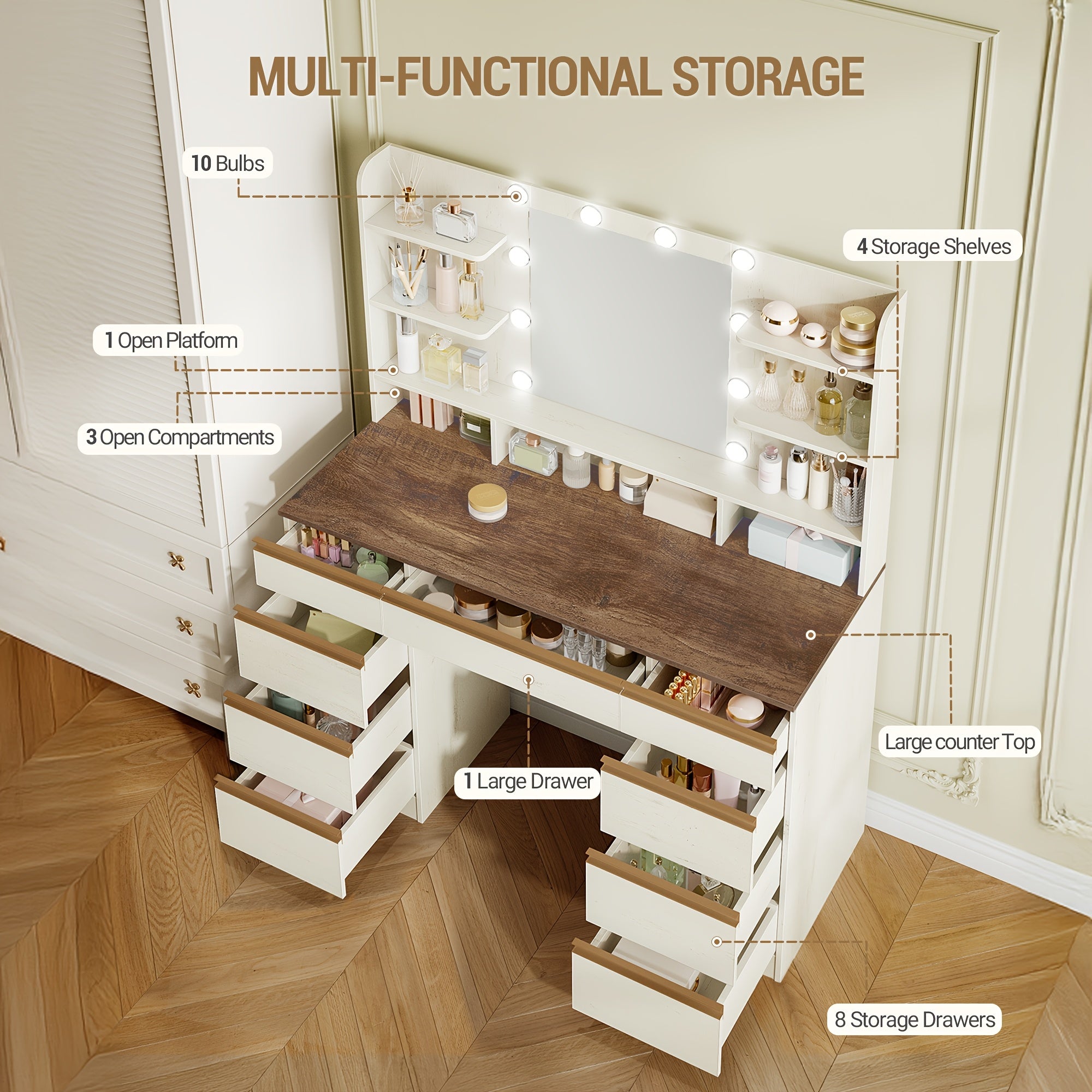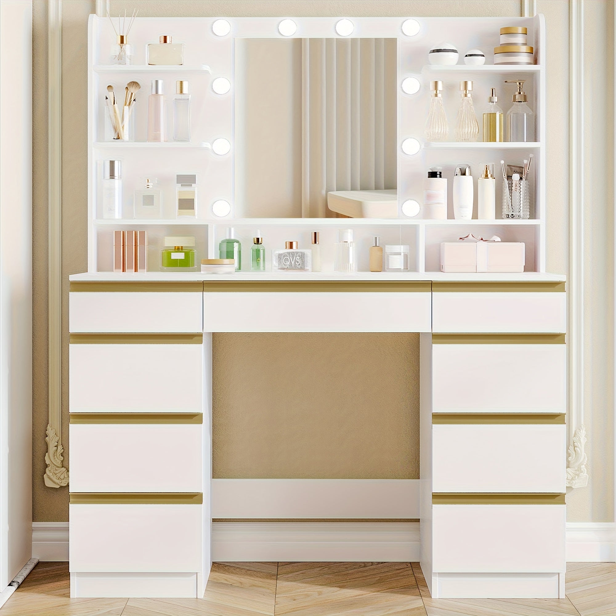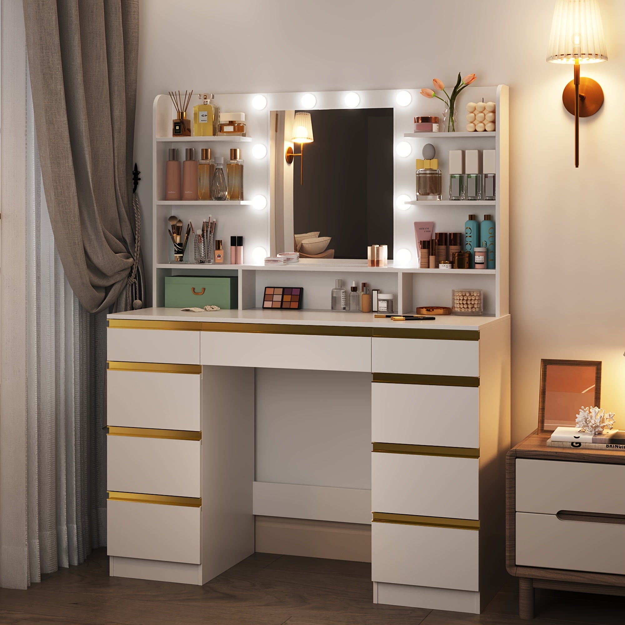 Toilette Luminosità Regolabile, Grande Specchio HD, 1 Cassetto Grande e 8 Cassetti Piccoli, 9 Ripiani Aperti, Bianco