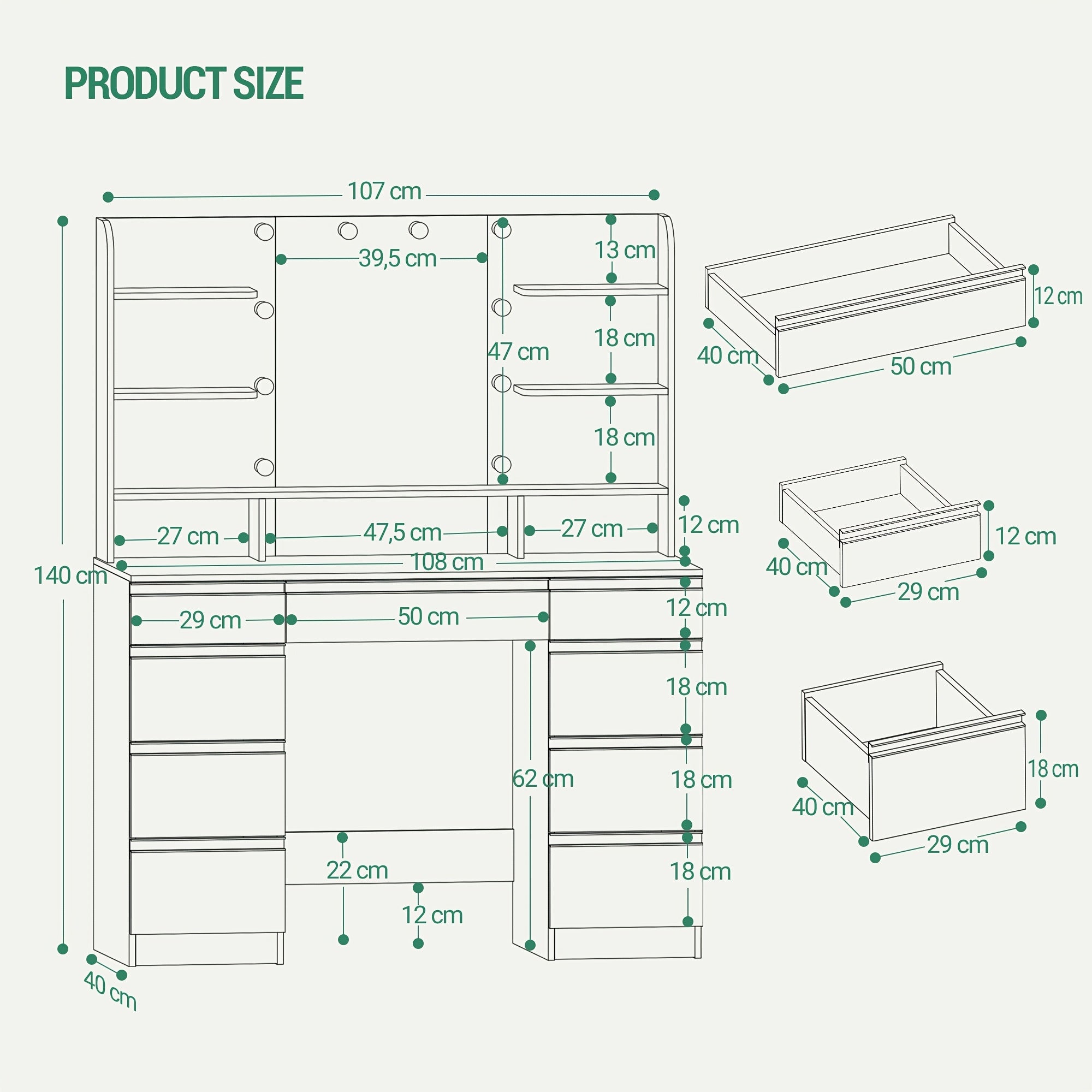 Toilette professionale con specchio HD di grandi dimensioni e illuminazione a luminosità regolabile per un'applicazione del trucco precisa in qualsiasi condizione di luce. La struttura bianca offre ampio spazio di stoccaggio con 1 cassetto grande, 8 cassetti piccoli e 9 ripiani aperti, ideale per organizzare cosmetici, accessori e prodotti di...